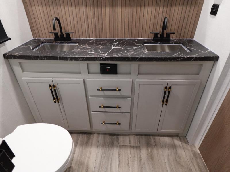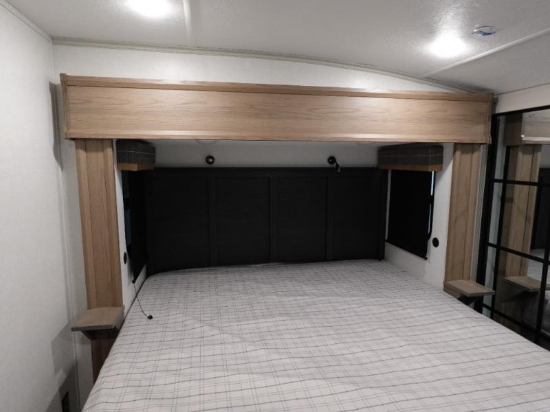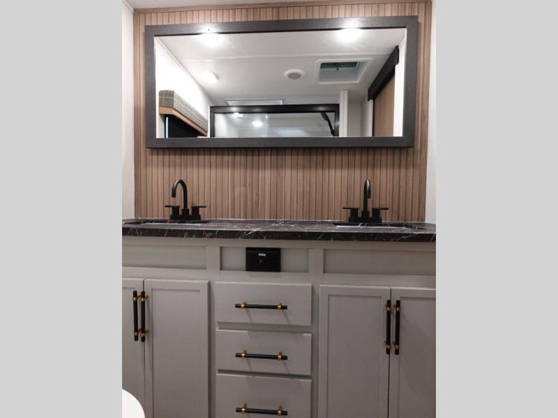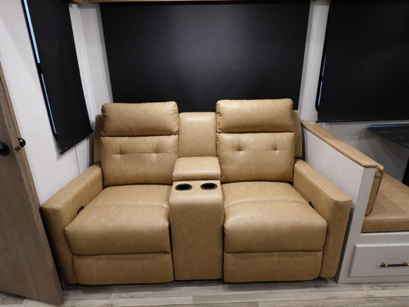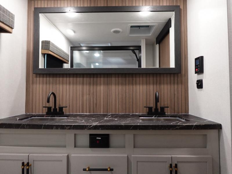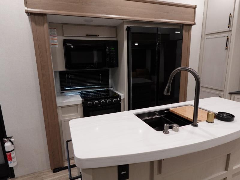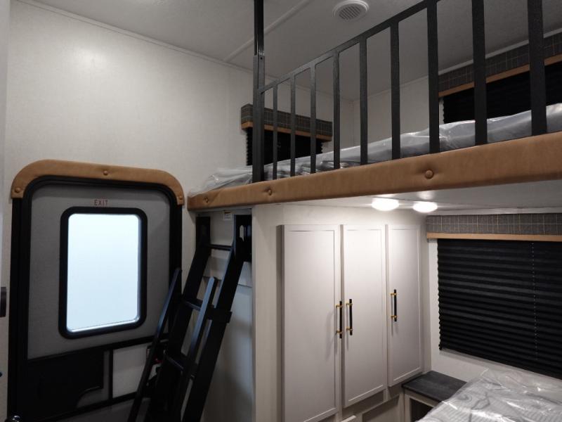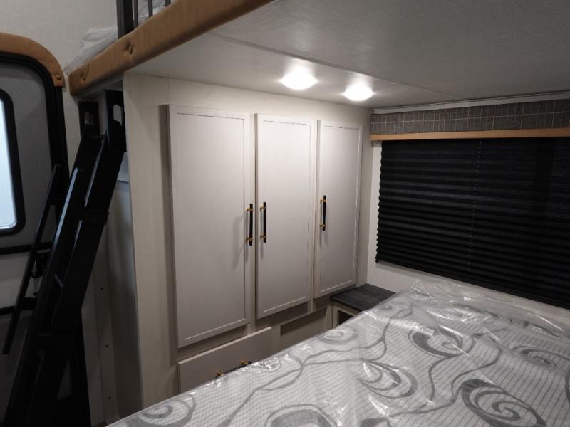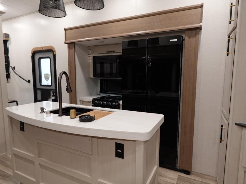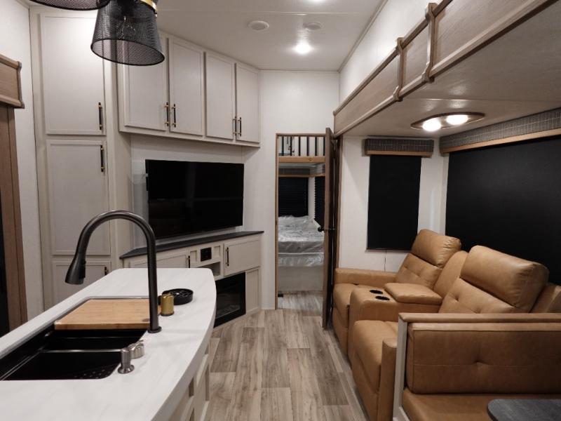 You will experience a smooth flow of traffic in and out of this fifth wheel with dual entry doors! One of the entrances even leads into the rear private bedroom which also has a 54" x 74" loft bed for storage or sleeping space, plus its very own half bathroom which will come in handy at night. The chef will enjoy preparing and serving meals using the kitchen island and all the amenities inside, plus they will enjoy cooking at the outdoor kitchen when wanting to be outside with everyone. Inside, there is a large pantry that is big enough to store everyone's favorite snacks, and the dinette offers a comfortable place to eat your meals or play card games. And the full bathroom has a dual sink vanity for two to get ready at once. When you're ready to wind down your nights, head to the front private bedroom and relax on the king bed slide!