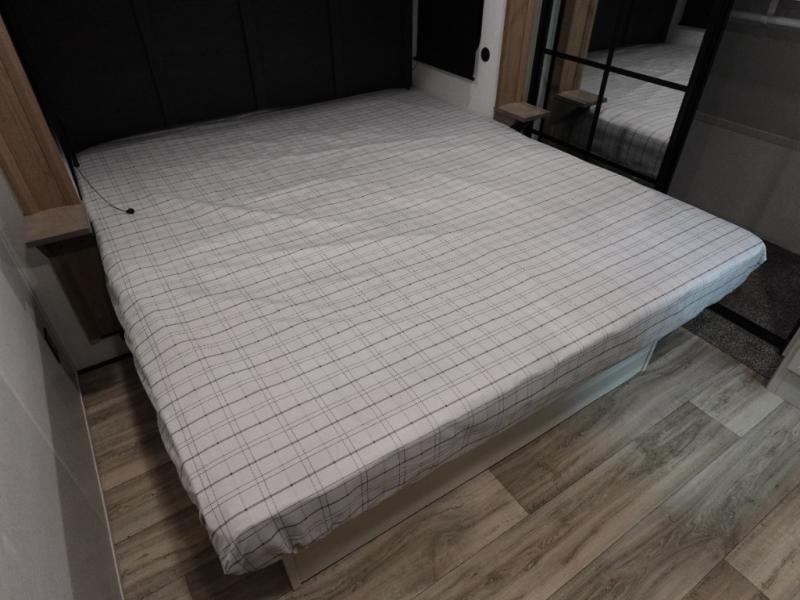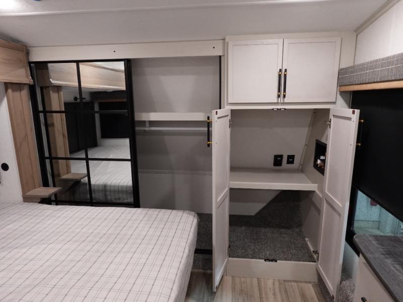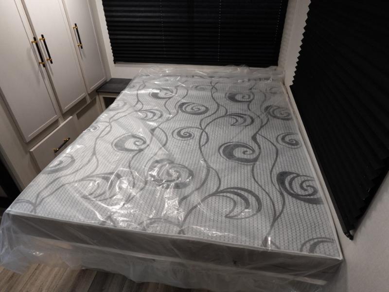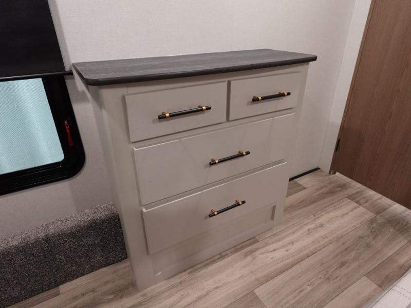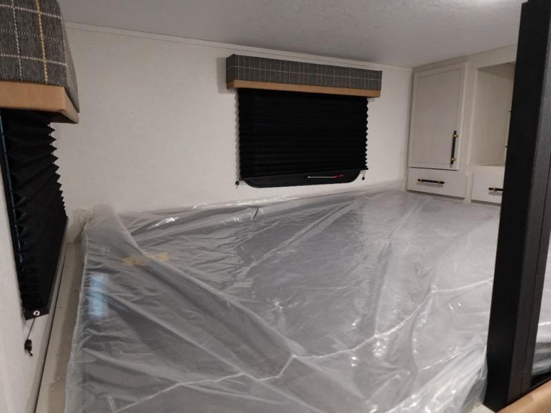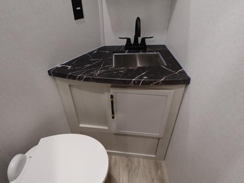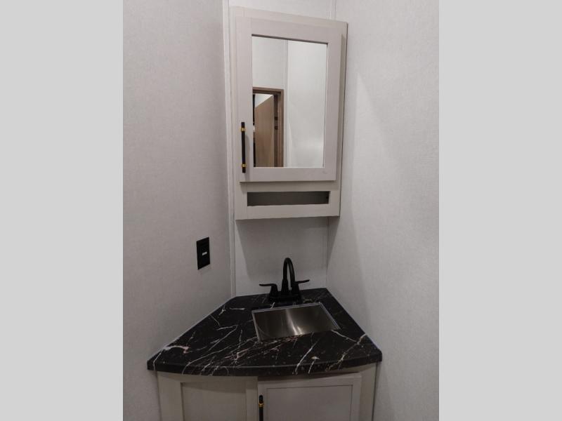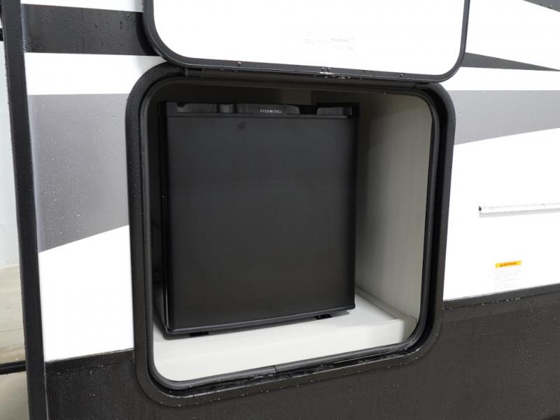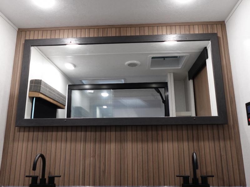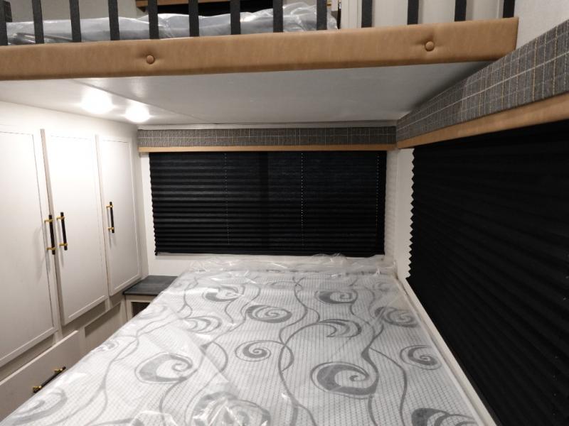 You will experience a smooth flow of traffic in and out of this fifth wheel with dual entry doors! One of the entrances even leads into the rear private bedroom which also has a 54" x 74" loft bed for storage or sleeping space, plus its very own half bathroom which will come in handy at night. The chef will enjoy preparing and serving meals using the kitchen island and all the amenities inside, plus they will enjoy cooking at the outdoor kitchen when wanting to be outside with everyone. Inside, there is a large pantry that is big enough to store everyone's favorite snacks, and the dinette offers a comfortable place to eat your meals or play card games. And the full bathroom has a dual sink vanity for two to get ready at once. When you're ready to wind down your nights, head to the front private bedroom and relax on the king bed slide!