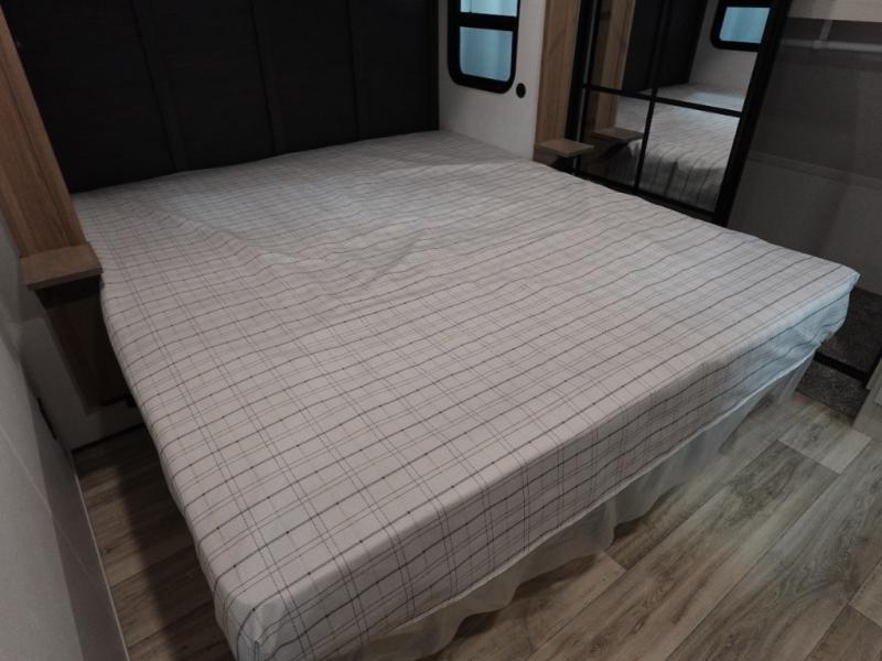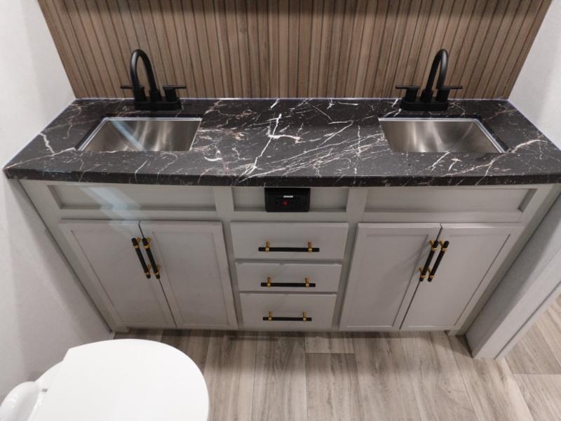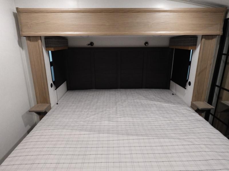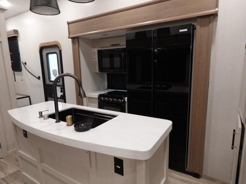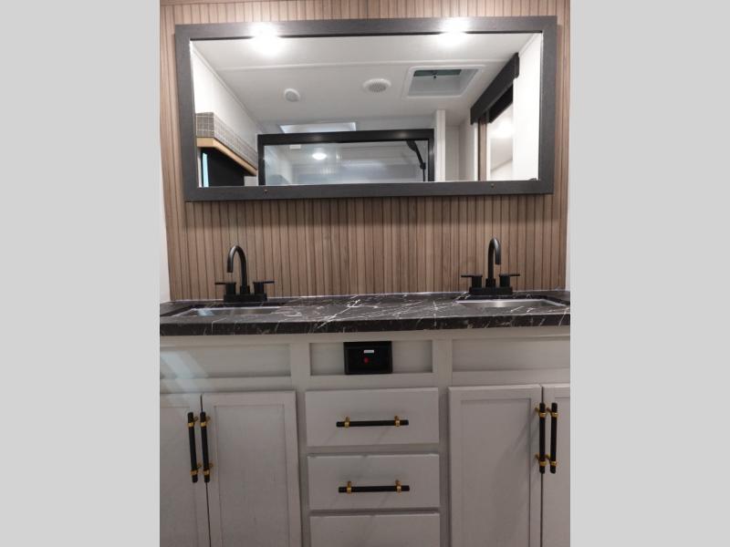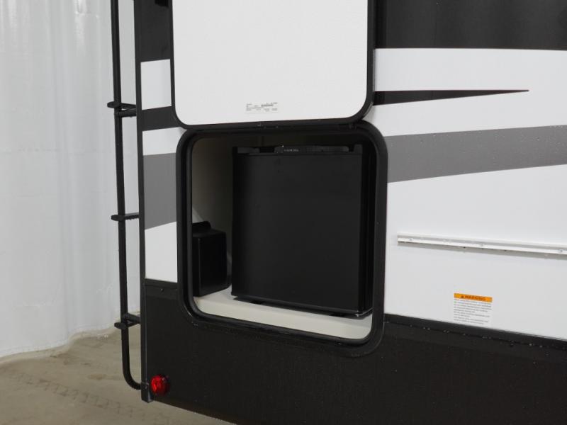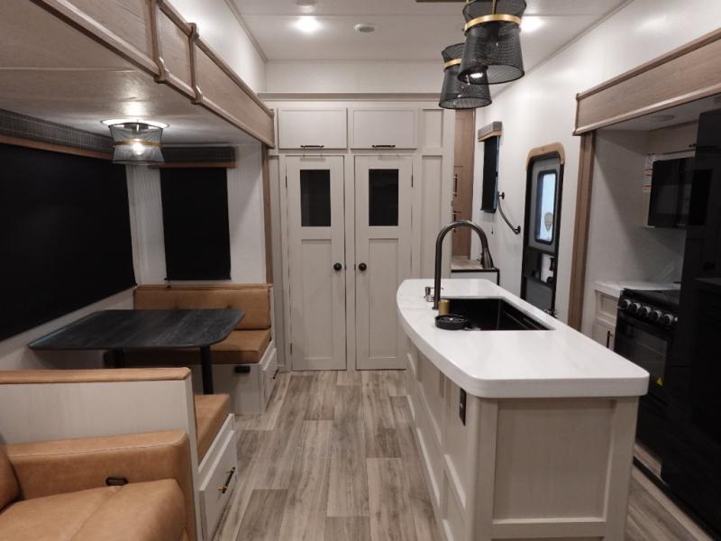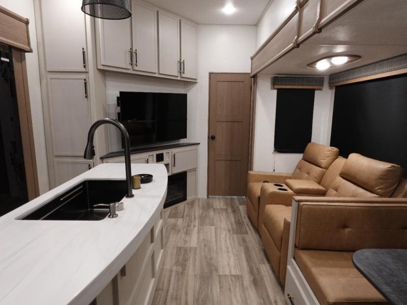 You will experience a smooth flow of traffic in and out of this fifth wheel with dual entry doors! One of the entrances even leads into the rear private bedroom which also has a 54" x 74" loft bed for storage or sleeping space, plus its very own half bathroom which will come in handy at night. The chef will enjoy preparing and serving meals using the kitchen island and all the amenities inside, plus they will enjoy cooking at the outdoor kitchen when wanting to be outside with everyone. Inside, there is a large pantry that is big enough to store everyone's favorite snacks, and the booth dinette offers a comfortable place to eat your meals or play card games. And the full bathroom has a dual sink vanity for two to get ready at once. When you're ready to wind down your nights, head to the front private bedroom and relax on the king bed slide!