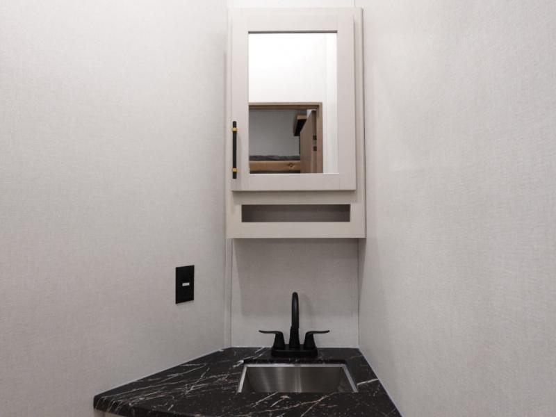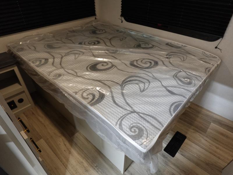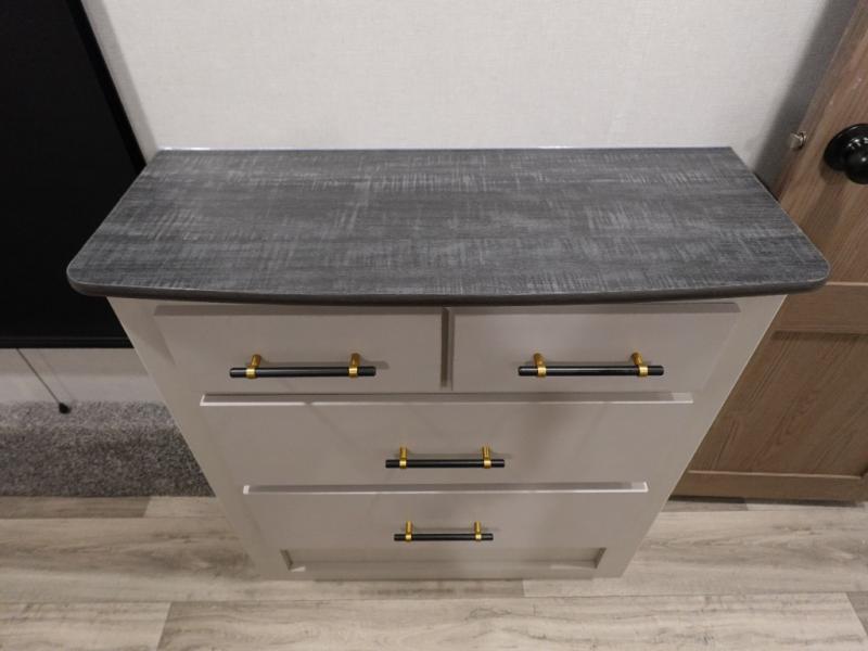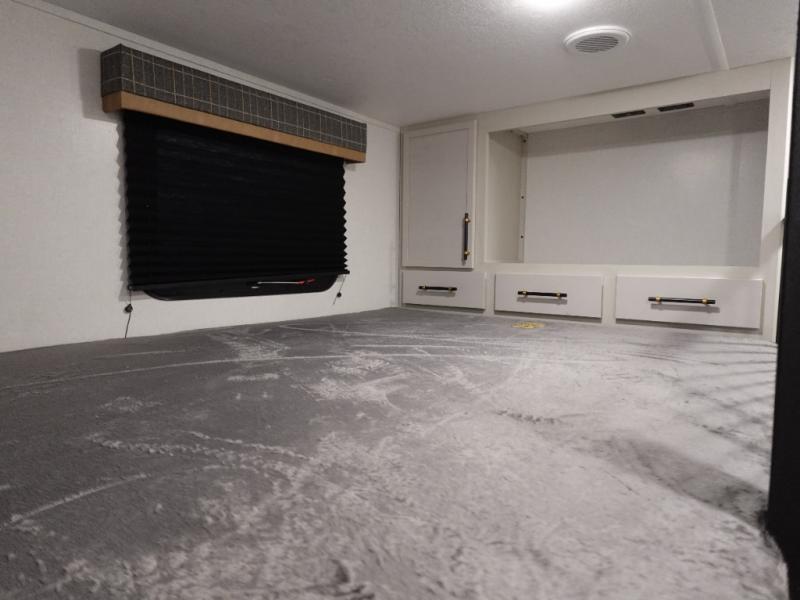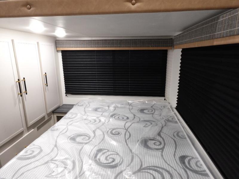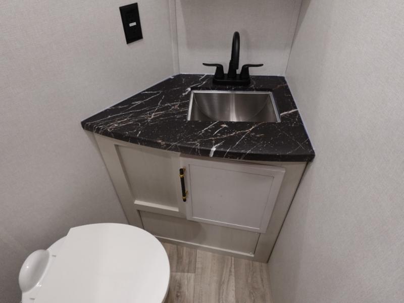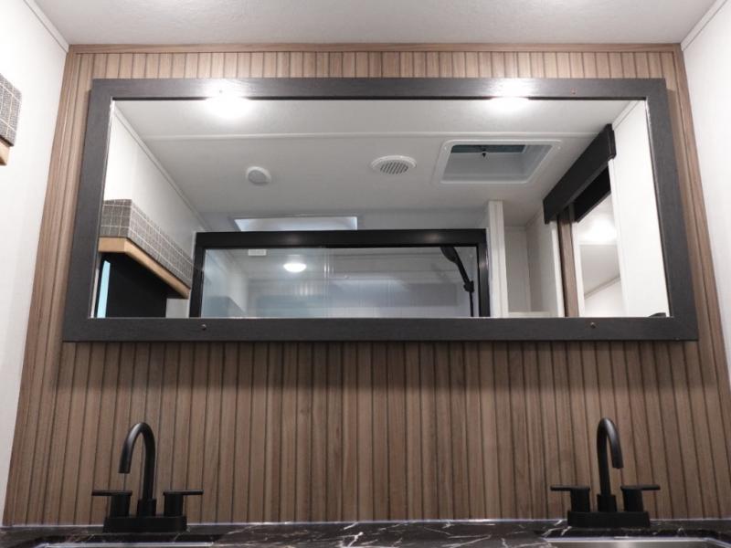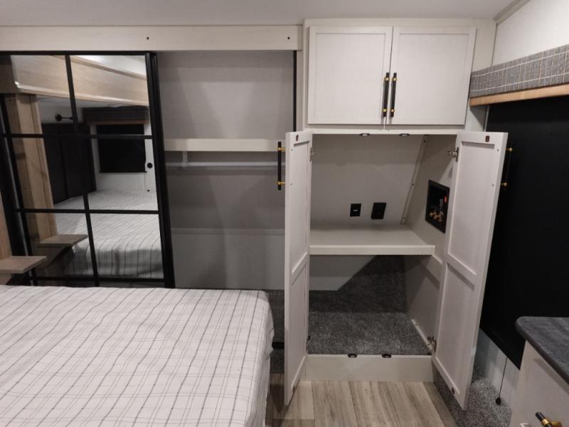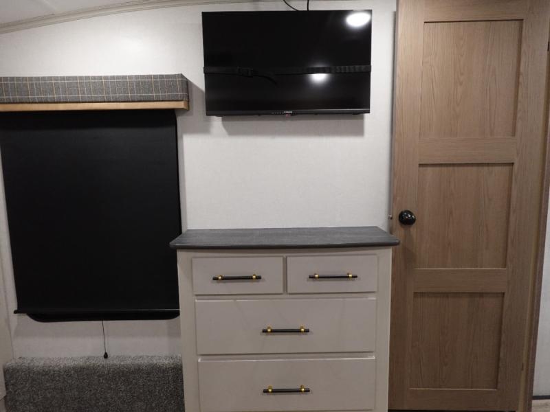 You will experience a smooth flow of traffic in and out of this fifth wheel with dual entry doors! One of the entrances even leads into the rear private bedroom which also has a 54" x 74" loft bed for storage or sleeping space, plus its very own half bathroom which will come in handy at night. The chef will enjoy preparing and serving meals using the kitchen island and all the amenities inside, plus they will enjoy cooking at the outdoor kitchen when wanting to be outside with everyone. Inside, there is a large pantry that is big enough to store everyone's favorite snacks, and the booth dinette offers a comfortable place to eat your meals or play card games. And the full bathroom has a dual sink vanity for two to get ready at once. When you're ready to wind down your nights, head to the front private bedroom and relax on the king bed slide!
