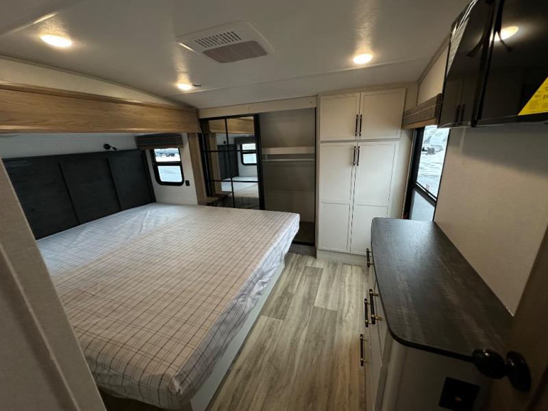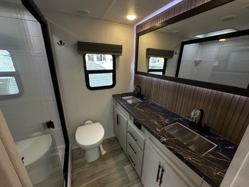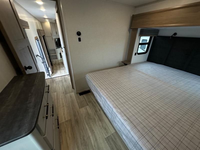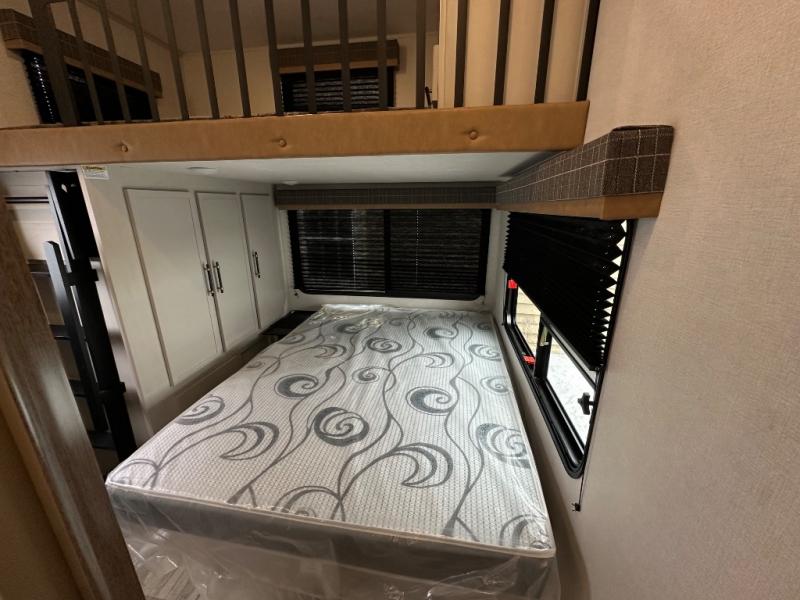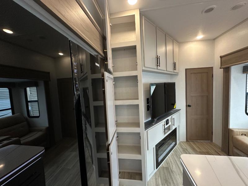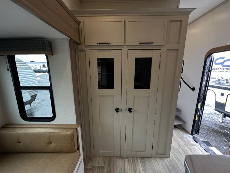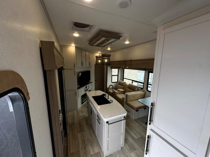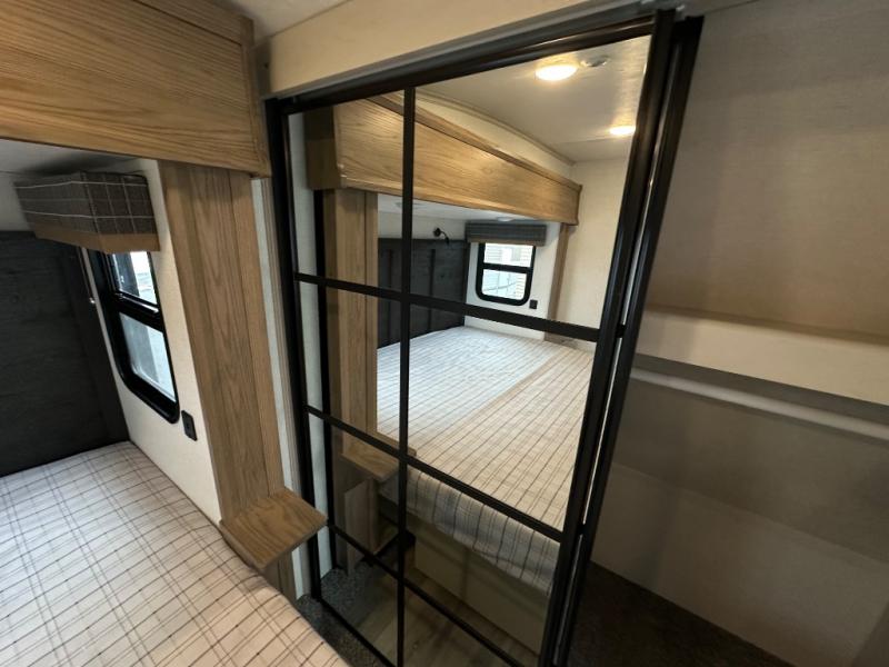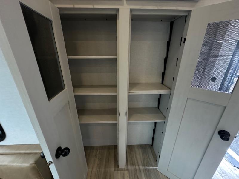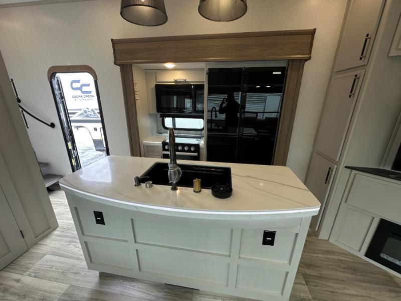 You will experience a smooth flow of traffic in and out of this fifth wheel with dual entry doors! One of the entrances even leads into the rear private bedroom which also has a 54" x 74" loft bed for storage or sleeping space, plus its very own half bathroom which will come in handy at night. The chef will enjoy preparing and serving meals using the kitchen island and all the amenities inside, plus they will enjoy cooking at the outdoor kitchen when wanting to be outside with everyone. Inside, there is a large pantry that is big enough to store everyone's favorite snacks, and the booth dinette offers a comfortable place to eat your meals or play card games. And the full bathroom has a dual sink vanity for two to get ready at once. When you're ready to wind down your nights, head to the front private bedroom and relax on the king bed slide!