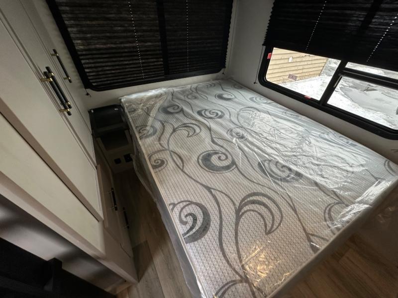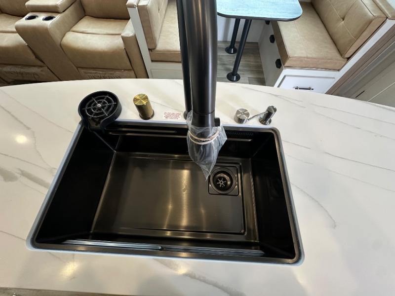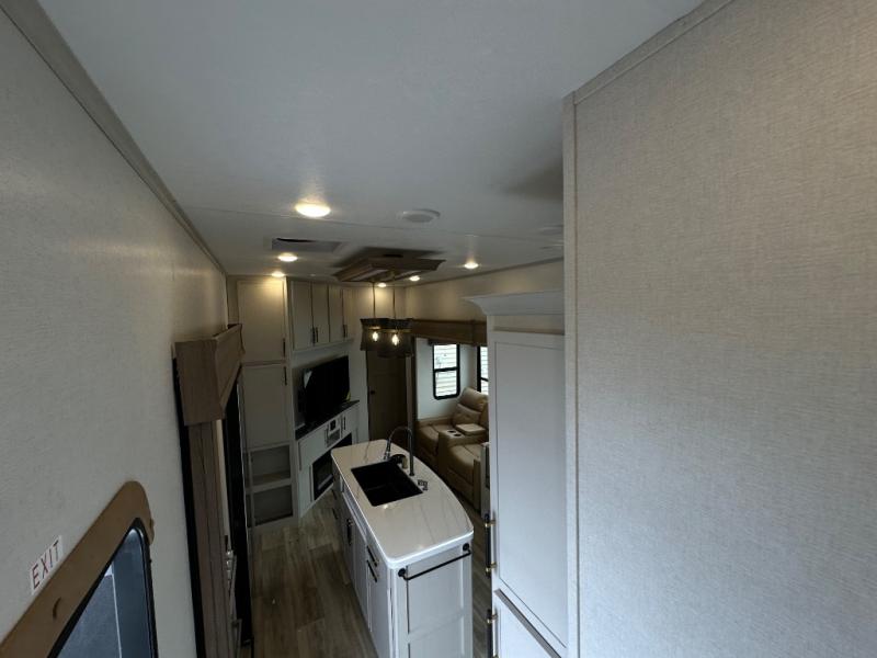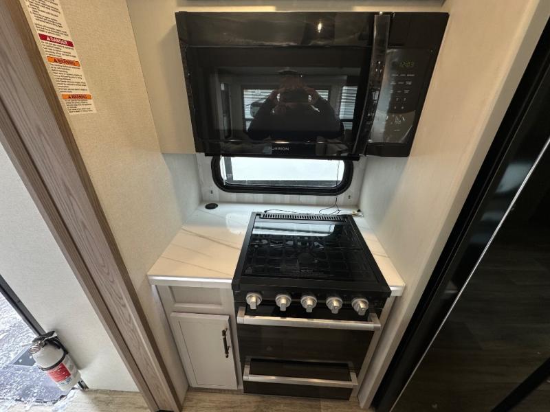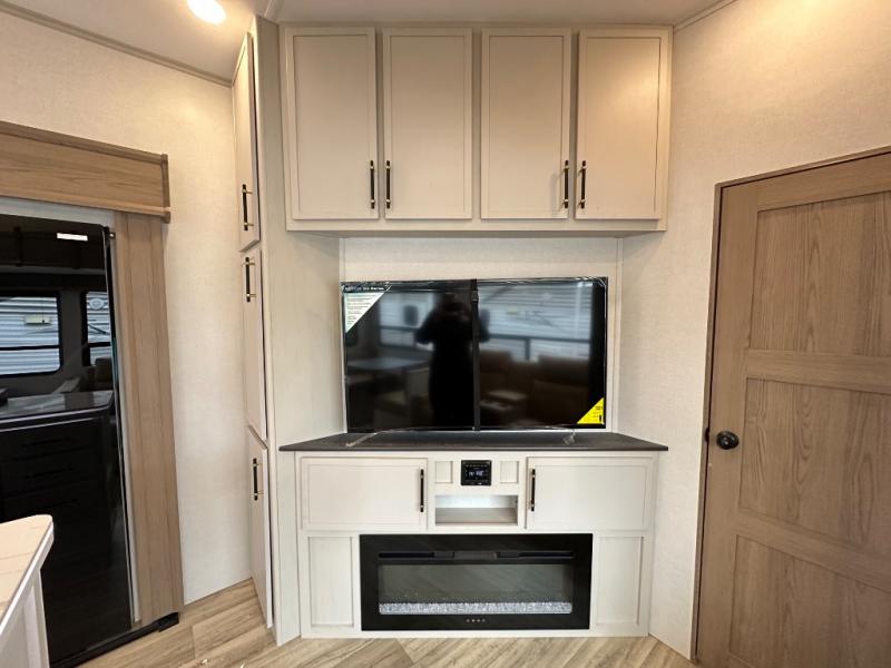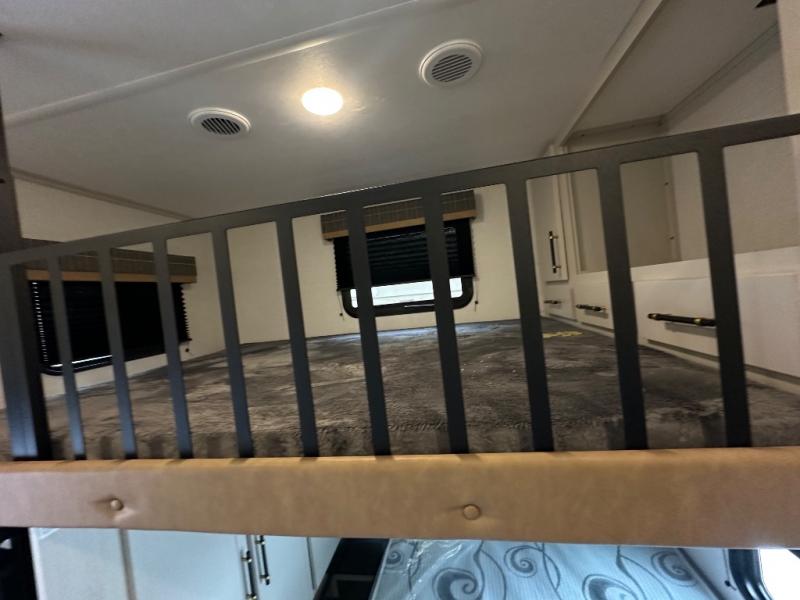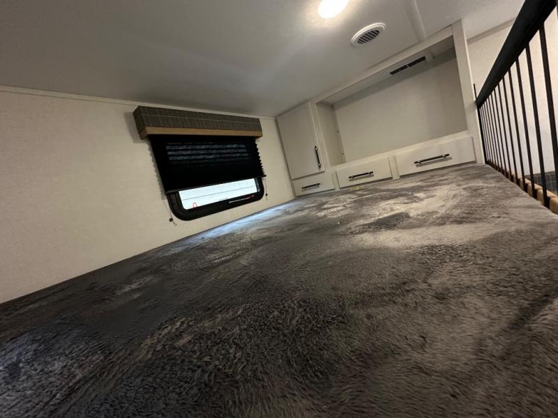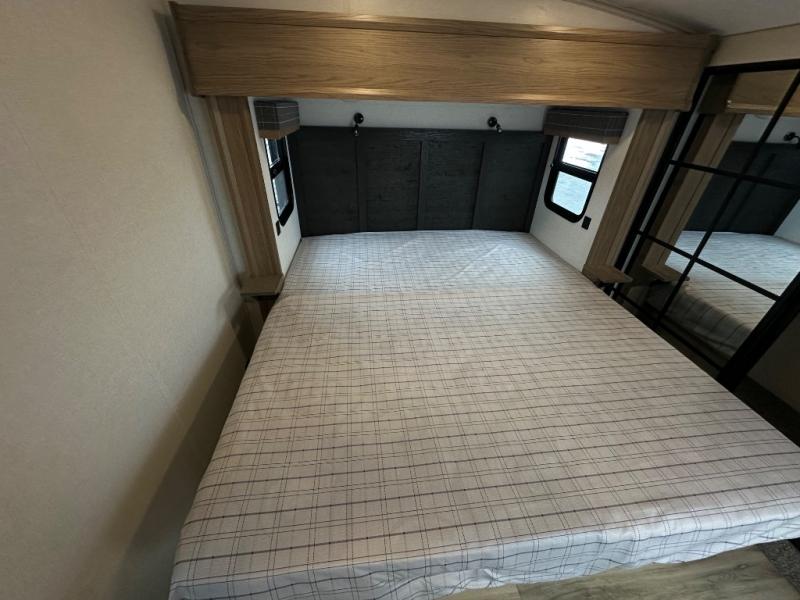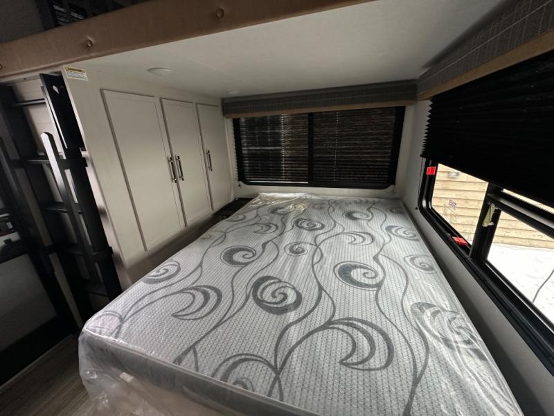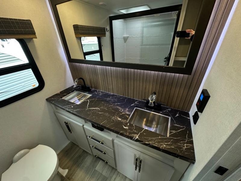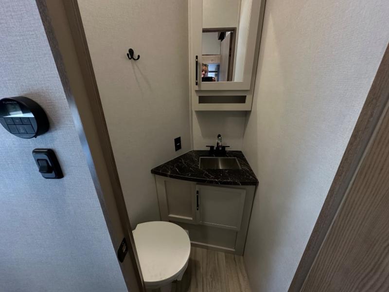 You will experience a smooth flow of traffic in and out of this fifth wheel with dual entry doors! One of the entrances even leads into the rear private bedroom which also has a 54" x 74" loft bed for storage or sleeping space, plus its very own half bathroom which will come in handy at night. The chef will enjoy preparing and serving meals using the kitchen island and all the amenities inside, plus they will enjoy cooking at the outdoor kitchen when wanting to be outside with everyone. Inside, there is a large pantry that is big enough to store everyone's favorite snacks, and the booth dinette offers a comfortable place to eat your meals or play card games. And the full bathroom has a dual sink vanity for two to get ready at once. When you're ready to wind down your nights, head to the front private bedroom and relax on the king bed slide!