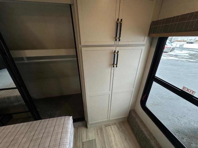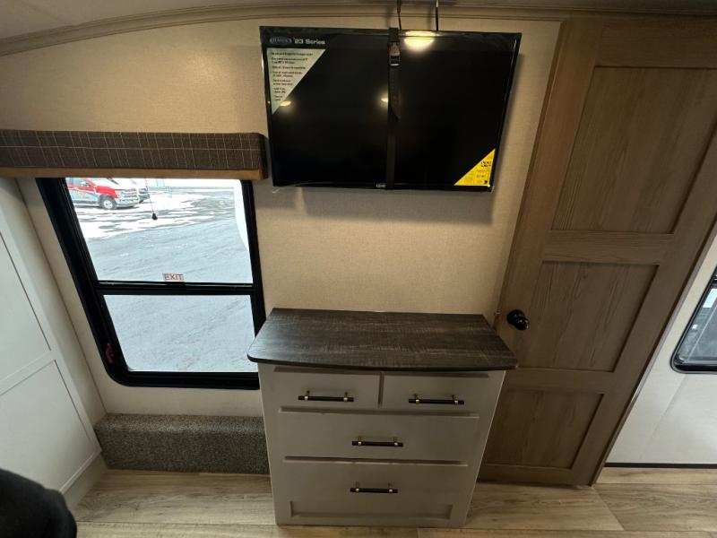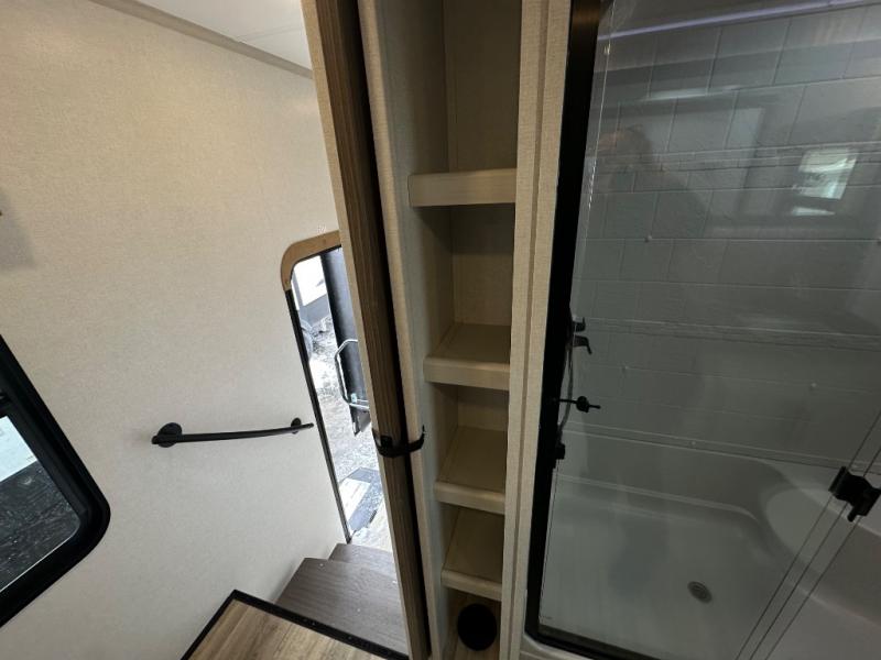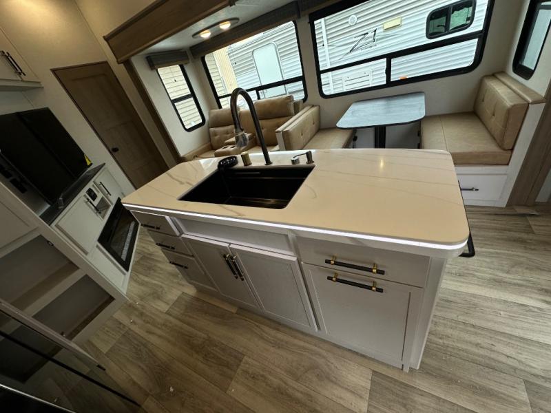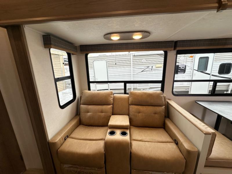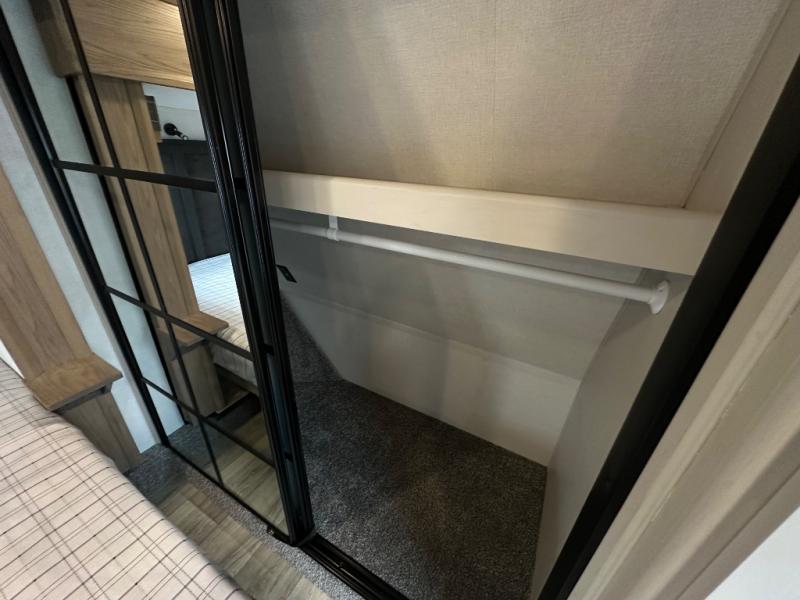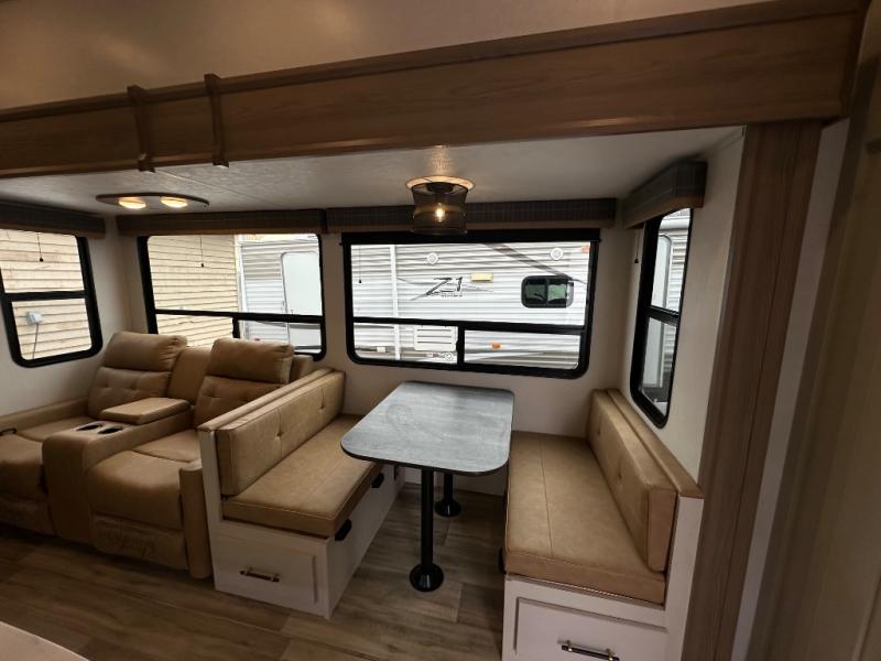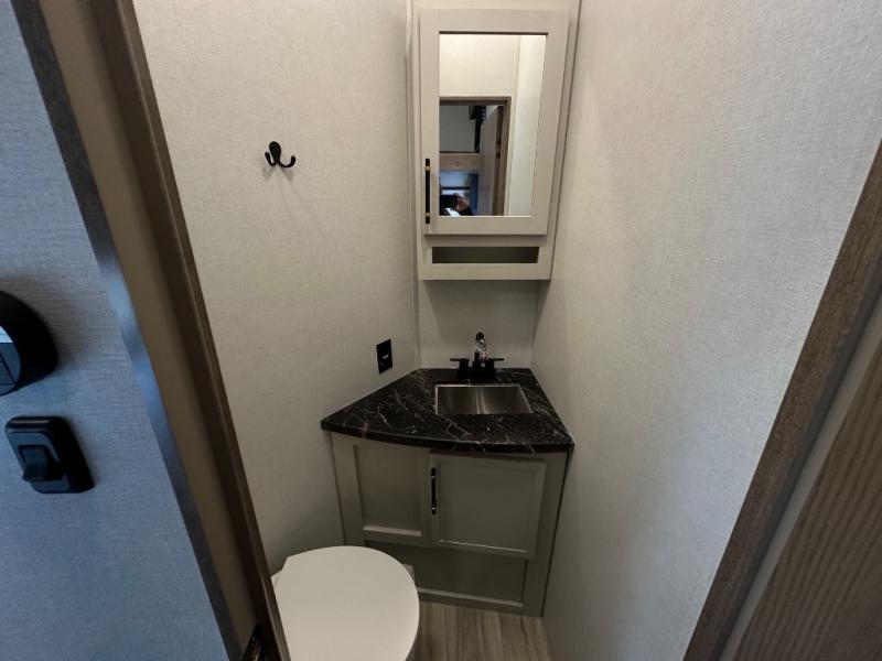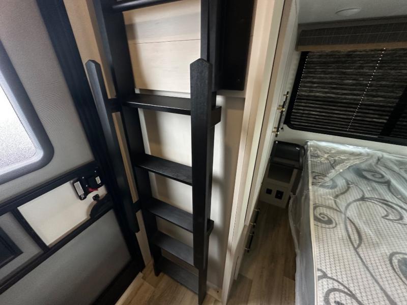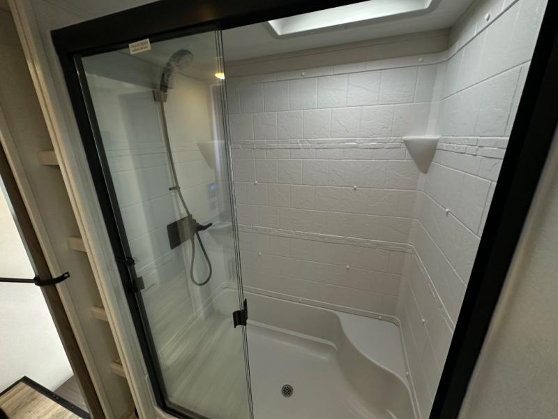 You will experience a smooth flow of traffic in and out of this fifth wheel with dual entry doors! One of the entrances even leads into the rear private bedroom which also has a 54" x 74" loft bed for storage or sleeping space, plus its very own half bathroom which will come in handy at night. The chef will enjoy preparing and serving meals using the kitchen island and all the amenities inside, plus they will enjoy cooking at the outdoor kitchen when wanting to be outside with everyone. Inside, there is a large pantry that is big enough to store everyone's favorite snacks, and the booth dinette offers a comfortable place to eat your meals or play card games. And the full bathroom has a dual sink vanity for two to get ready at once. When you're ready to wind down your nights, head to the front private bedroom and relax on the king bed slide!