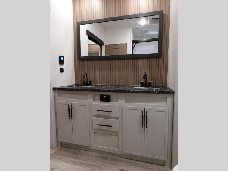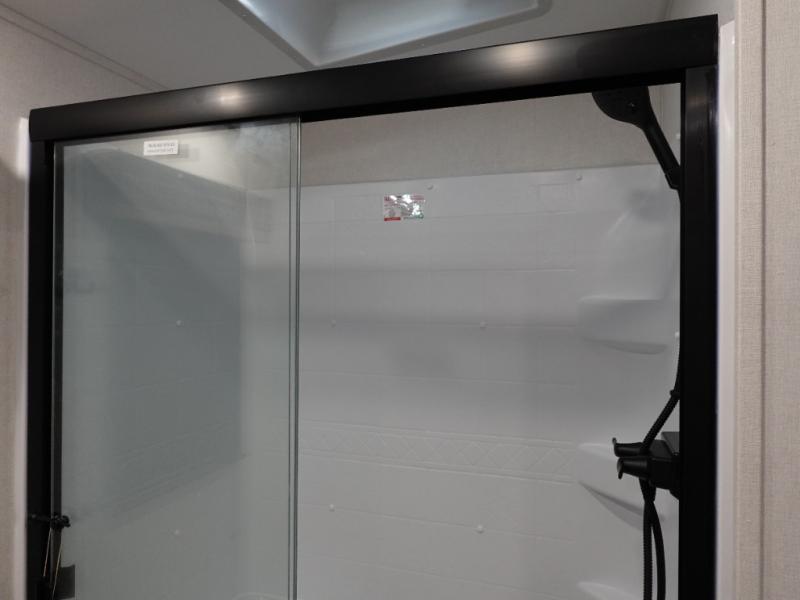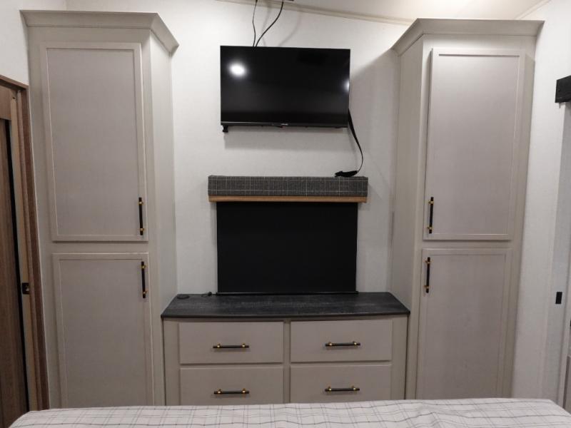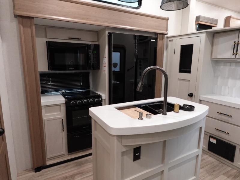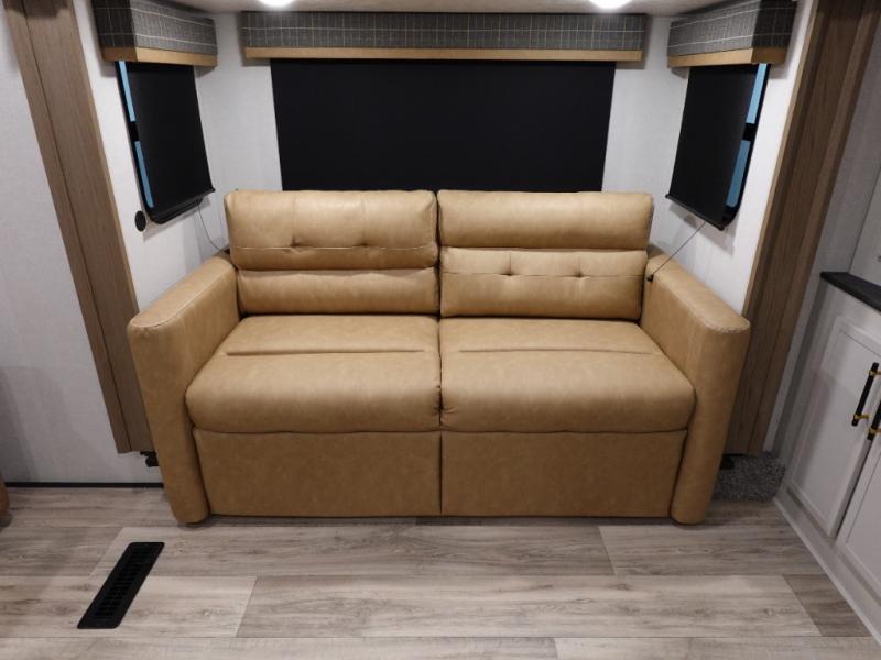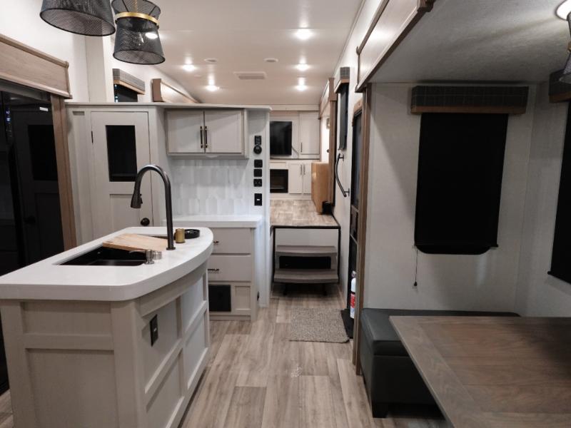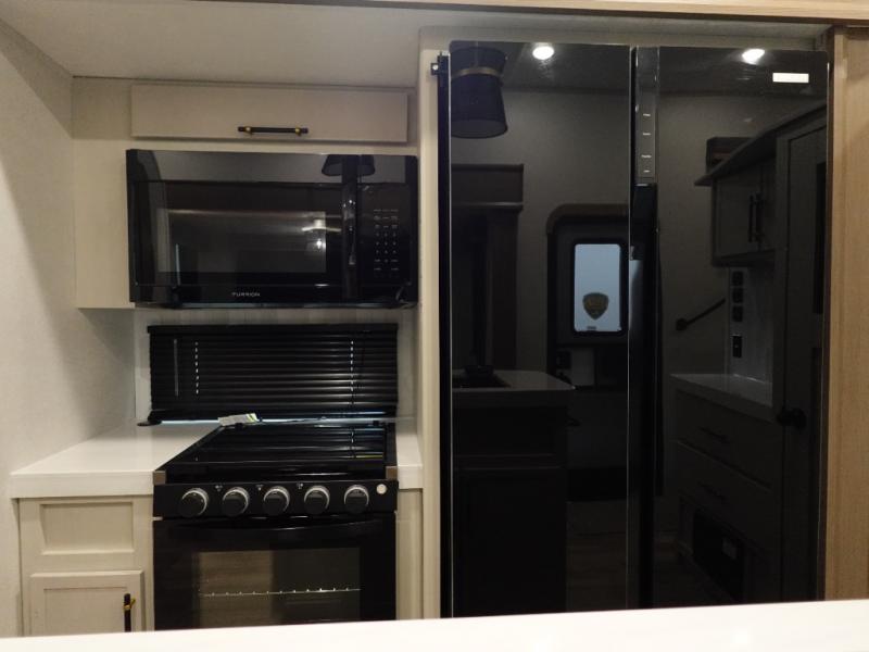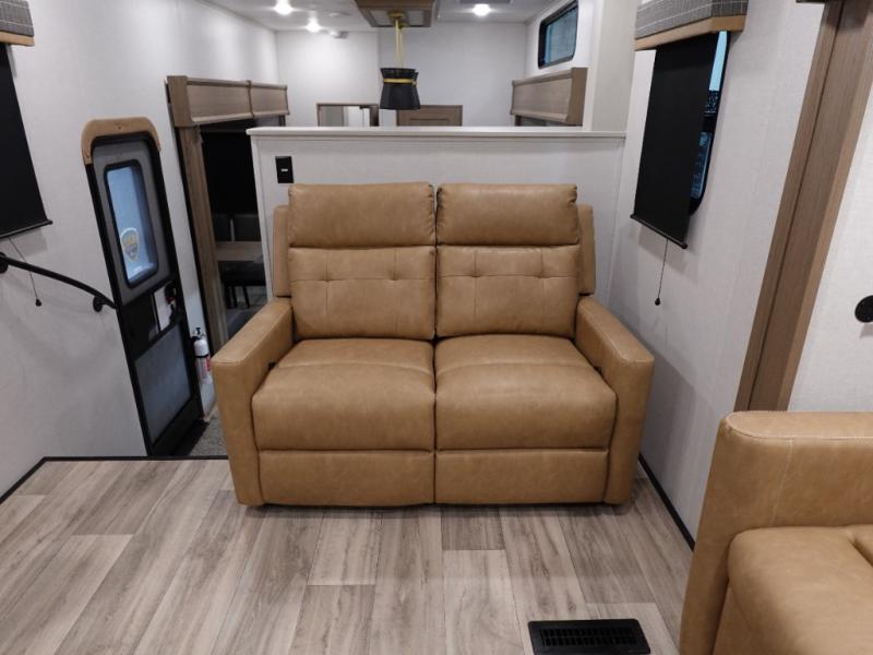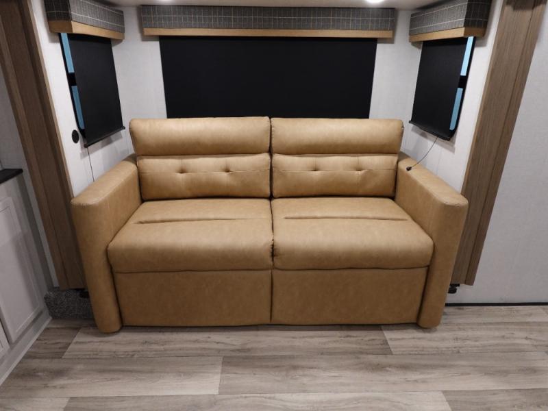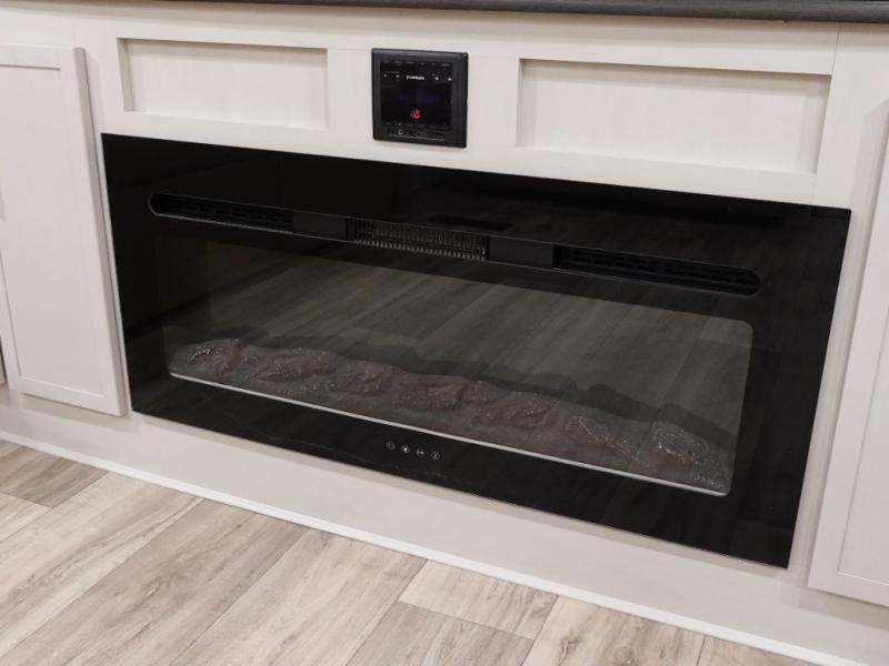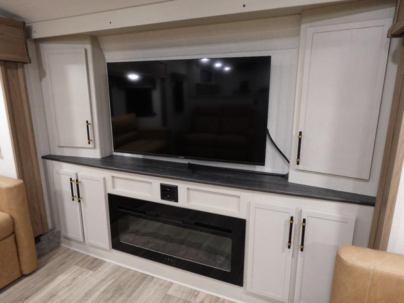 Experience a comfortable camping trip with this fifth wheel! The front living area not only has opposing sofa slides, but also theater seating across from an entertainment center with a 40" fireplace and a HD LED TV. The separate kitchen has everything you will need to prepare delicious home cooked meals including a glass top three burner cooktop with an oven and a kitchen island with a large sink that has a high rise faucet with a sprayer for an easy clean up. There is even a half bathroom by the kitchen so you can use it and quickly get back to cooking. The master suite has a king bed slide for more interior space, an entertainment center for a comfortable movie night, and access to the spacious full rear bathroom with a dual sink vanity, storage and washer/dryer prep!