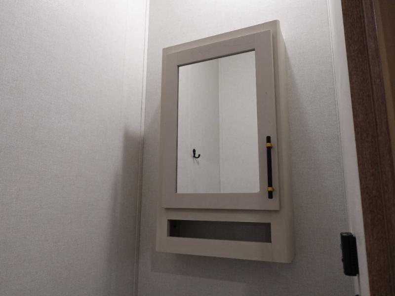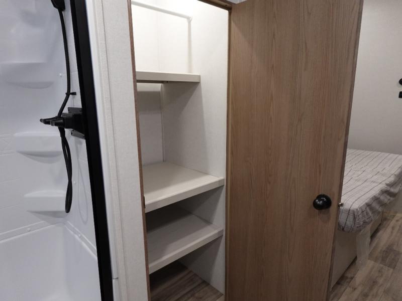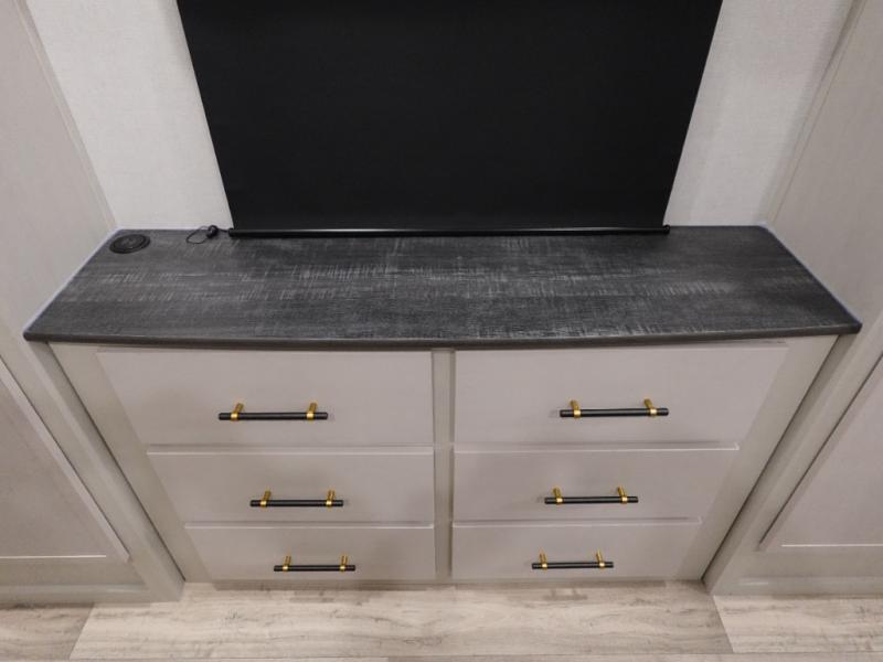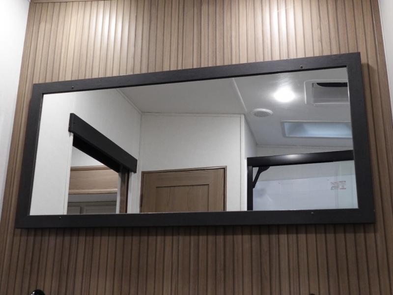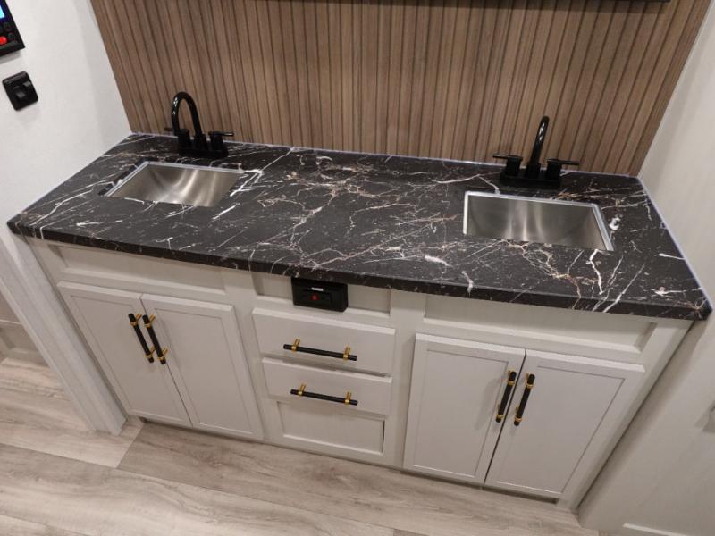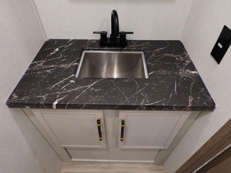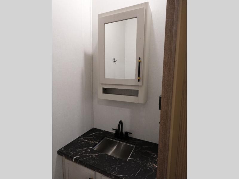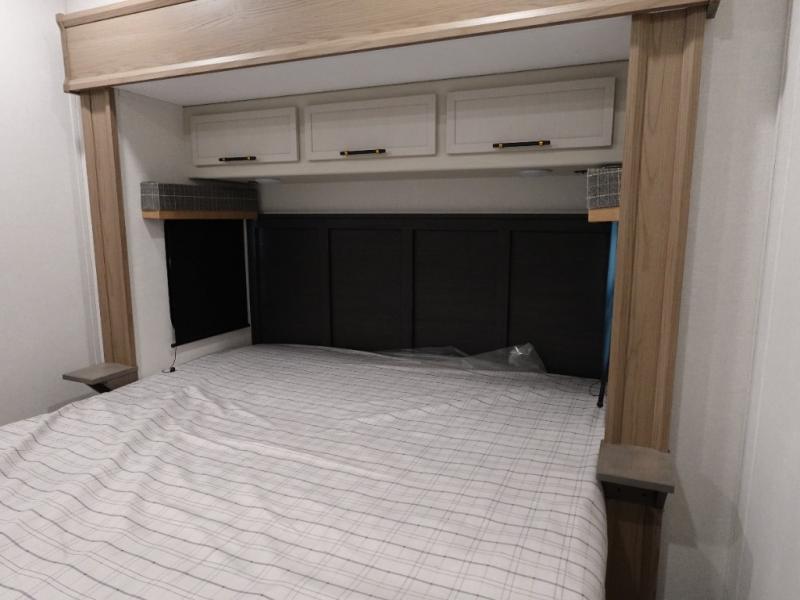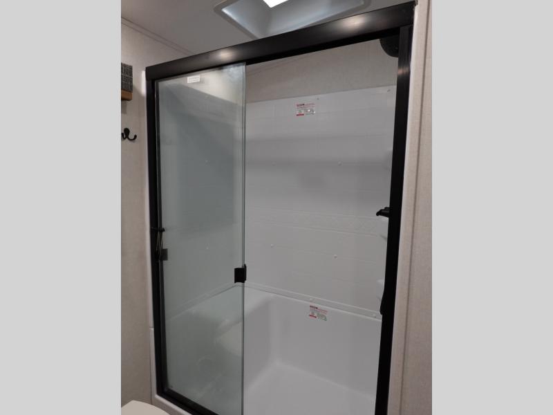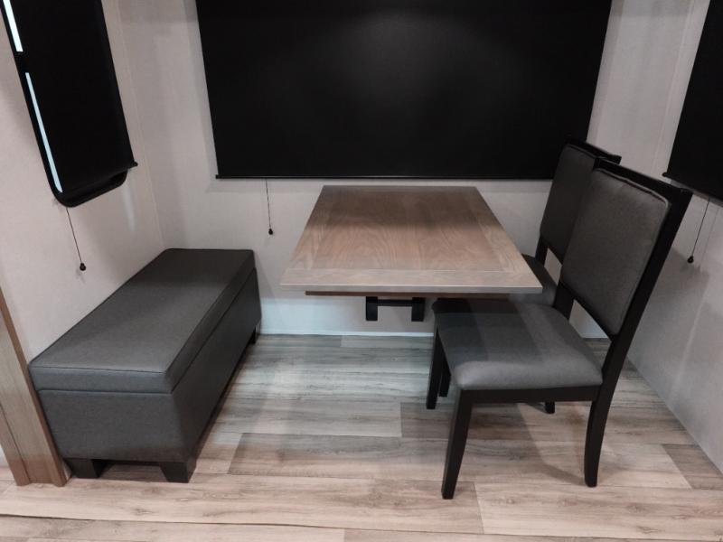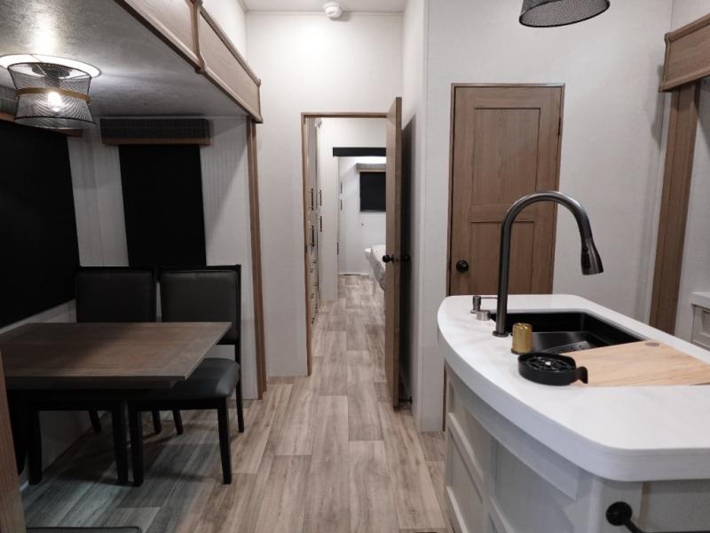 Experience a comfortable camping trip with this fifth wheel! The front living area not only has opposing sofa slides, but also theater seating across from an entertainment center with a 40" fireplace and a HD LED TV. The separate kitchen has everything you will need to prepare delicious home cooked meals including a glass top three burner cooktop with an oven and a kitchen island with a large sink that has a high rise faucet with a sprayer for an easy clean up. There is even a half bathroom by the kitchen so you can use it and quickly get back to cooking. The master suite has a king bed slide for more interior space, an entertainment center for a comfortable movie night, and access to the spacious full rear bathroom with a dual sink vanity, storage and washer/dryer prep!