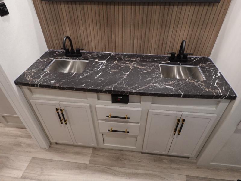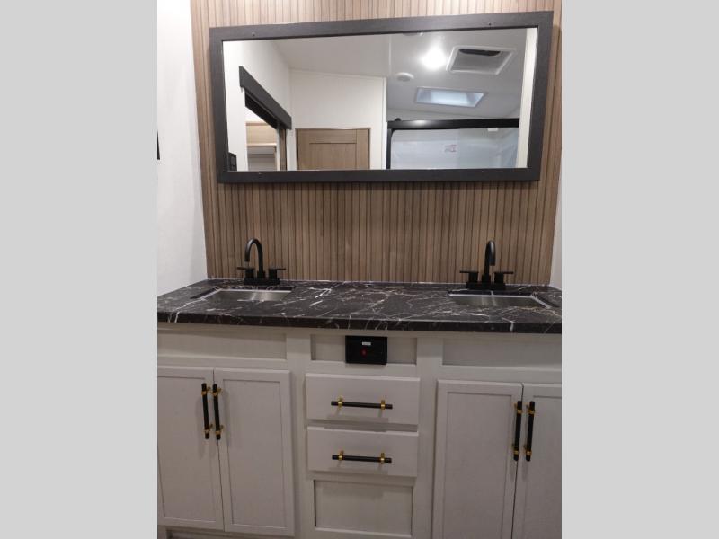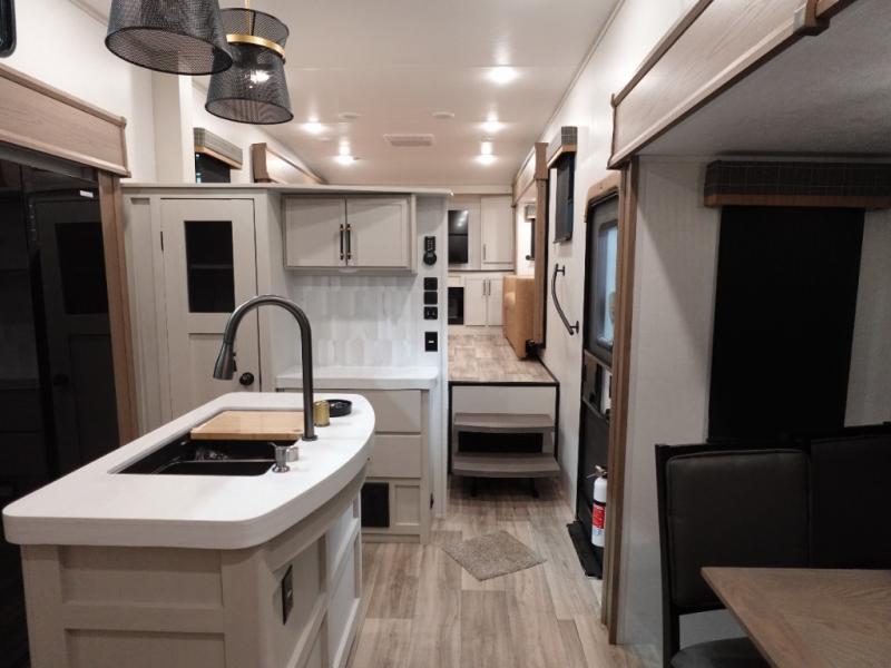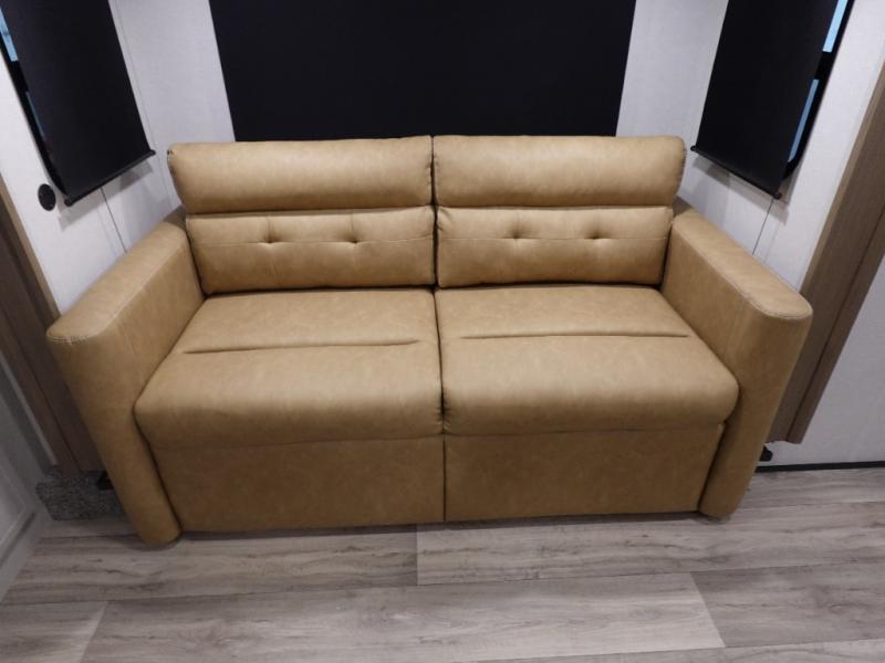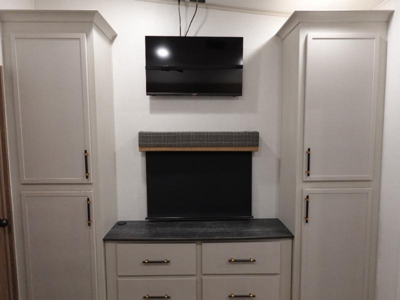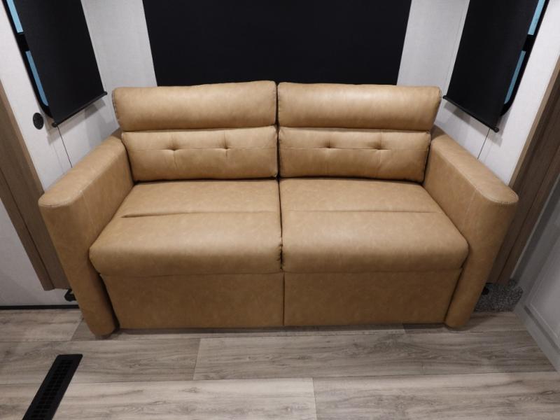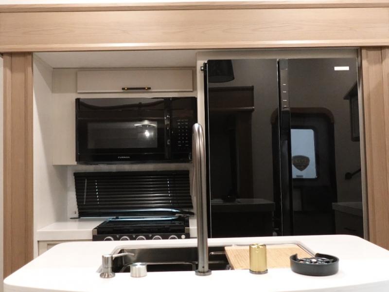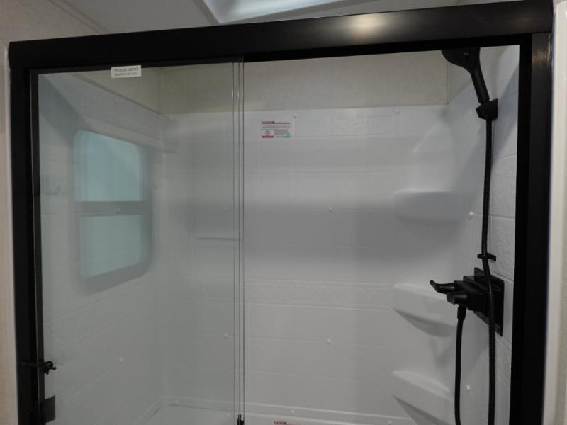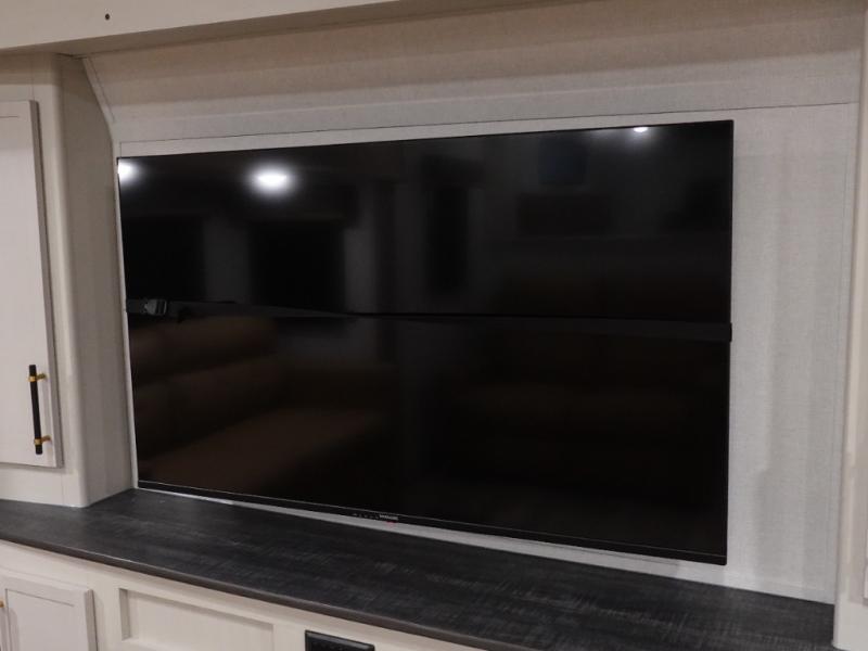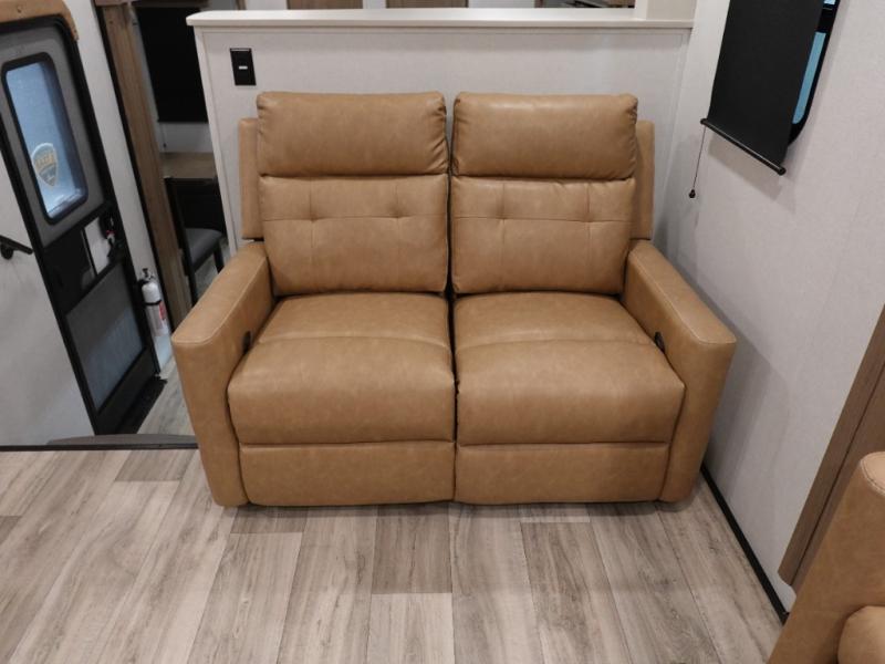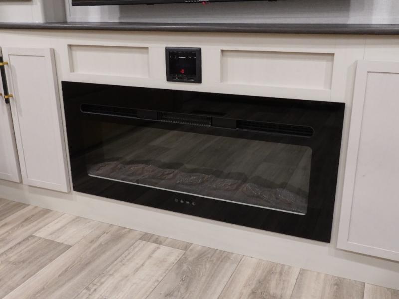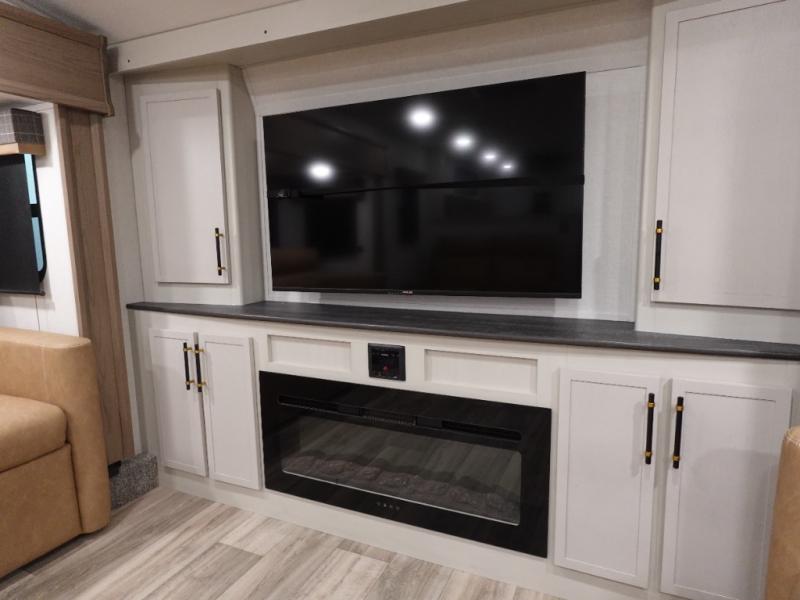 Experience a comfortable camping trip with this fifth wheel! The front living area not only has opposing sofa slides, but also theater seating across from an entertainment center with a 40" fireplace and a HD LED TV. The separate kitchen has everything you will need to prepare delicious home cooked meals including a glass top three burner cooktop with an oven and a kitchen island with a large sink that has a high rise faucet with a sprayer for an easy clean up. There is even a half bathroom by the kitchen so you can use it and quickly get back to cooking. The master suite has a king bed slide for more interior space, an entertainment center for a comfortable movie night, and access to the spacious full rear bathroom with a dual sink vanity, storage and washer/dryer prep!