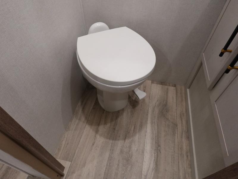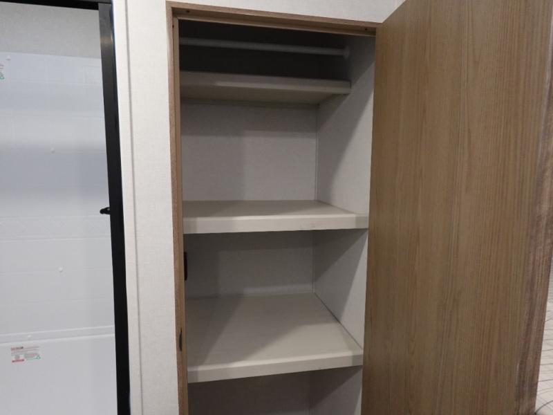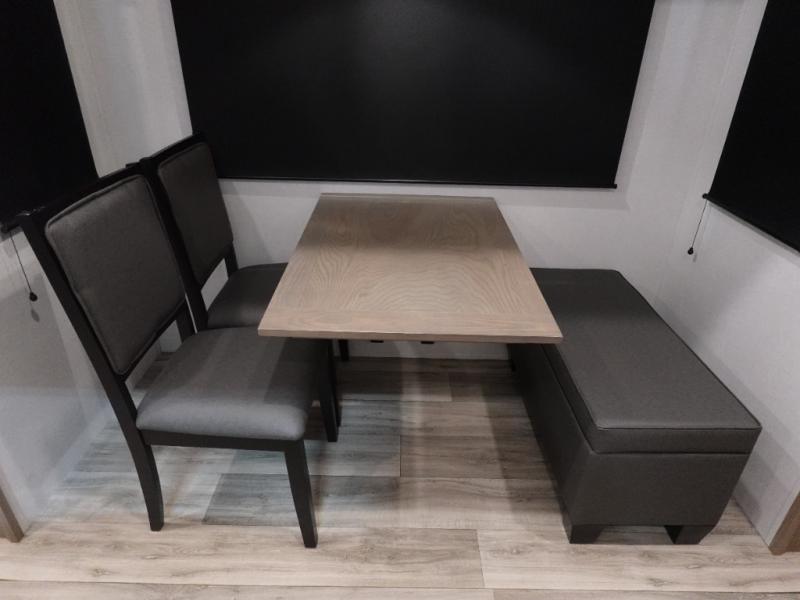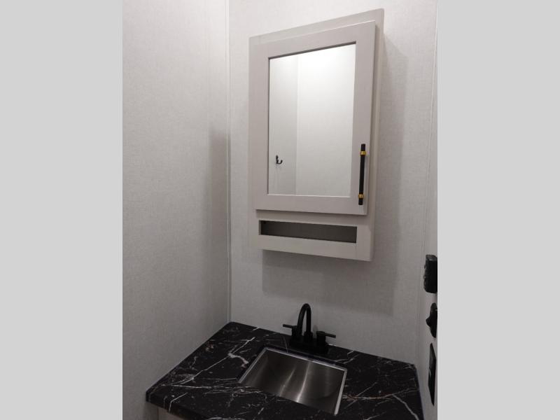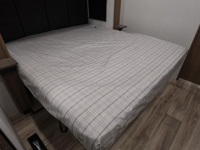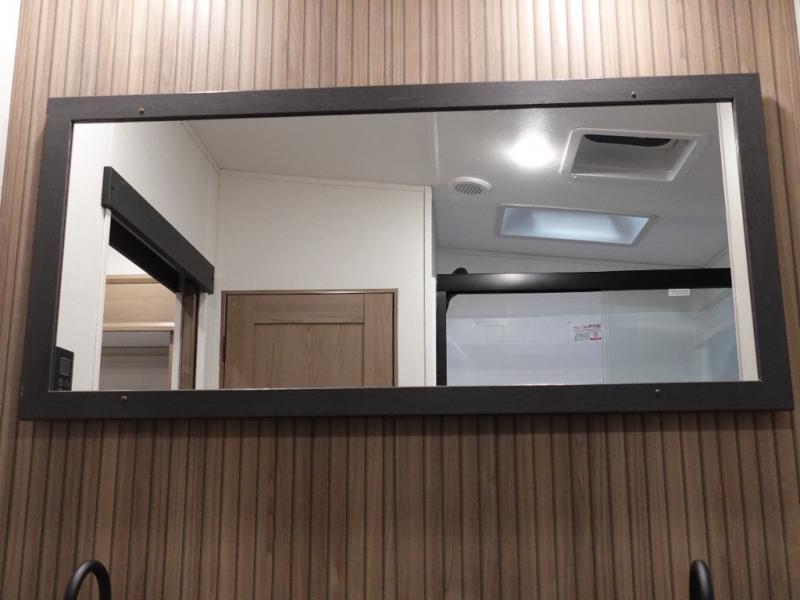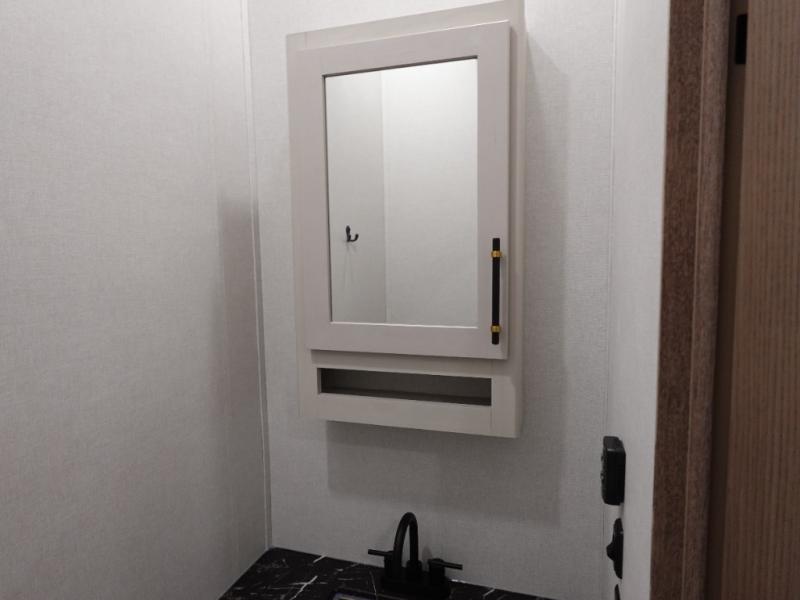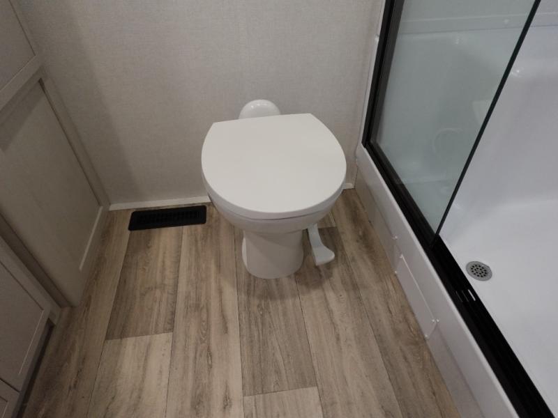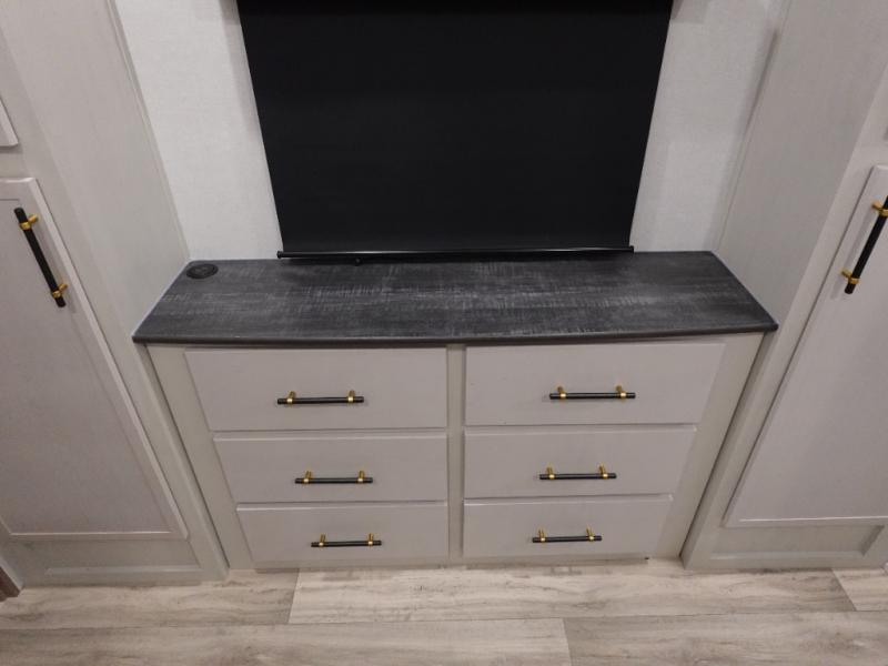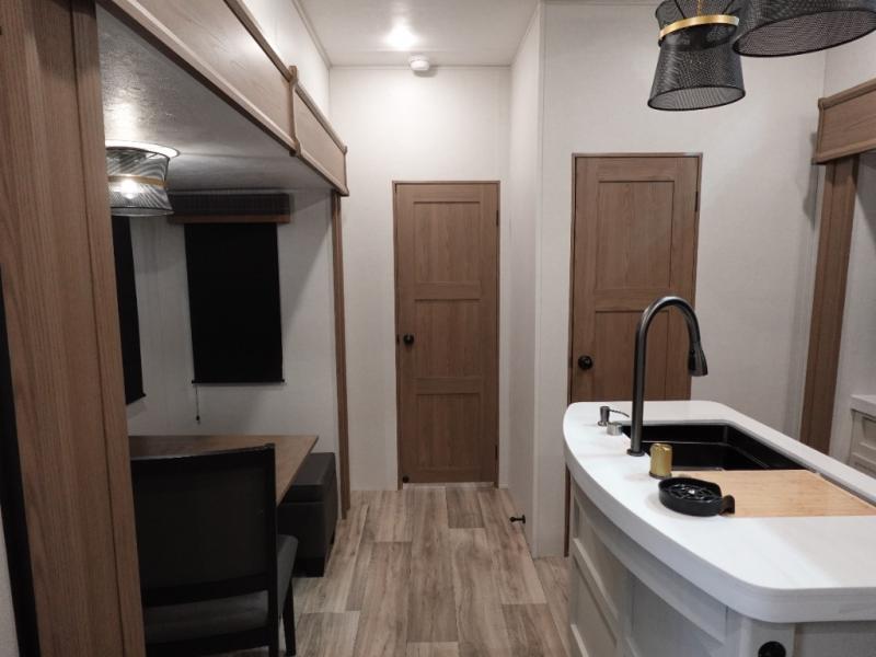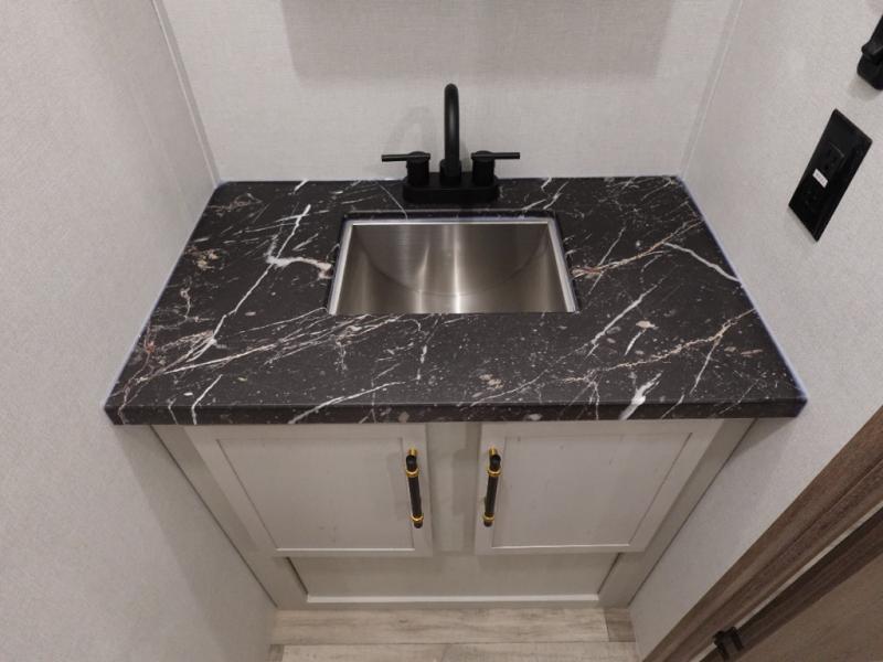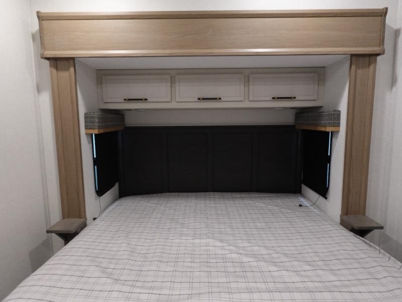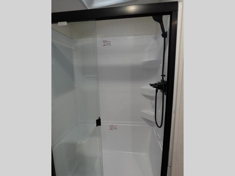 Experience a comfortable camping trip with this fifth wheel! The front living area not only has opposing sofa slides, but also theater seating across from an entertainment center with a 40" fireplace and a HD LED TV. The separate kitchen has everything you will need to prepare delicious home cooked meals including a glass top three burner cooktop with an oven and a kitchen island with a large sink that has a high rise faucet with a sprayer for an easy clean up. There is even a half bathroom by the kitchen so you can use it and quickly get back to cooking. The master suite has a king bed slide for more interior space, an entertainment center for a comfortable movie night, and access to the spacious full rear bathroom with a dual sink vanity, storage and washer/dryer prep!
