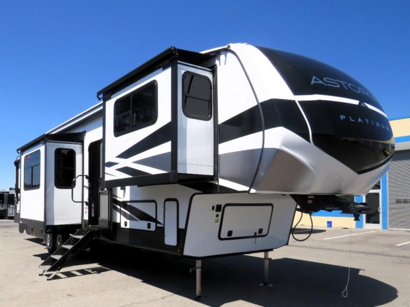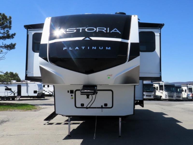 Each one of these Dutchmen RV Astoria Platinum fifth wheels feature a fiberglass exterior for added durability and an All Weather Thermal Package so you can camp all year long! There are also MorRyde Solid entry steps, slam latch baggage doors, and many more exterior conveniences. You'll enjoy a 200W solar panel for off-grid capabilities, an X1 back up camera for easy parking, and a power awning with LED lights for an inviting outdoor space. The interior is designed with bathroom backsplash, night shades throughout the living area, and Thomas Payne furniture collection. The on-demand tankless water heater will provide endless hot showers, and the dual ducted A/C will keep you cool all summer long.