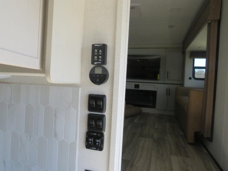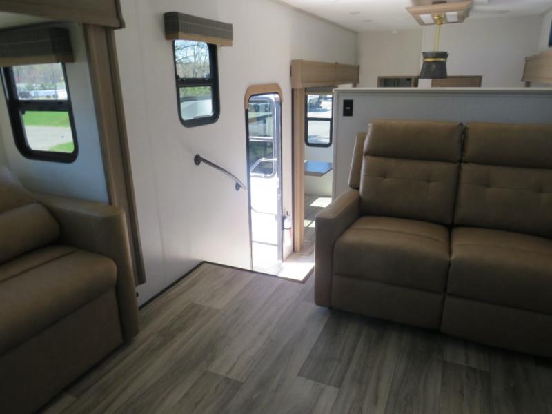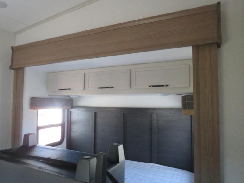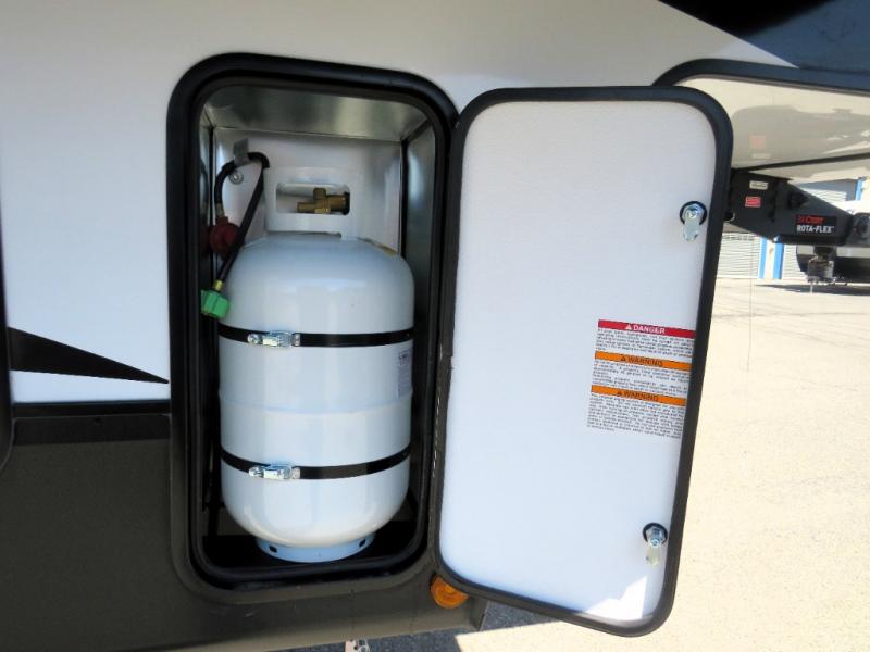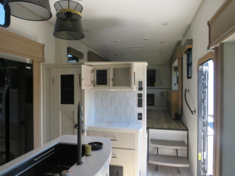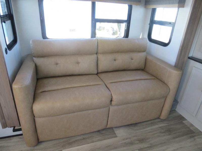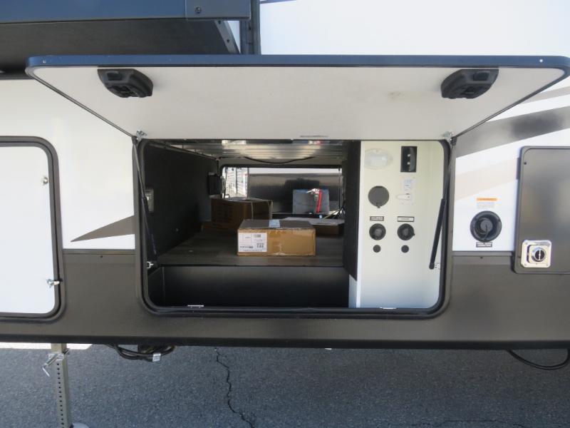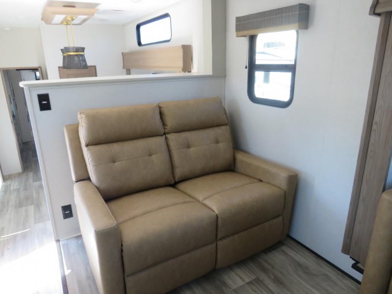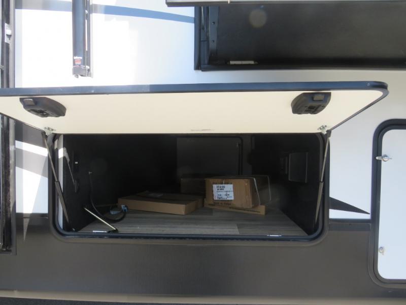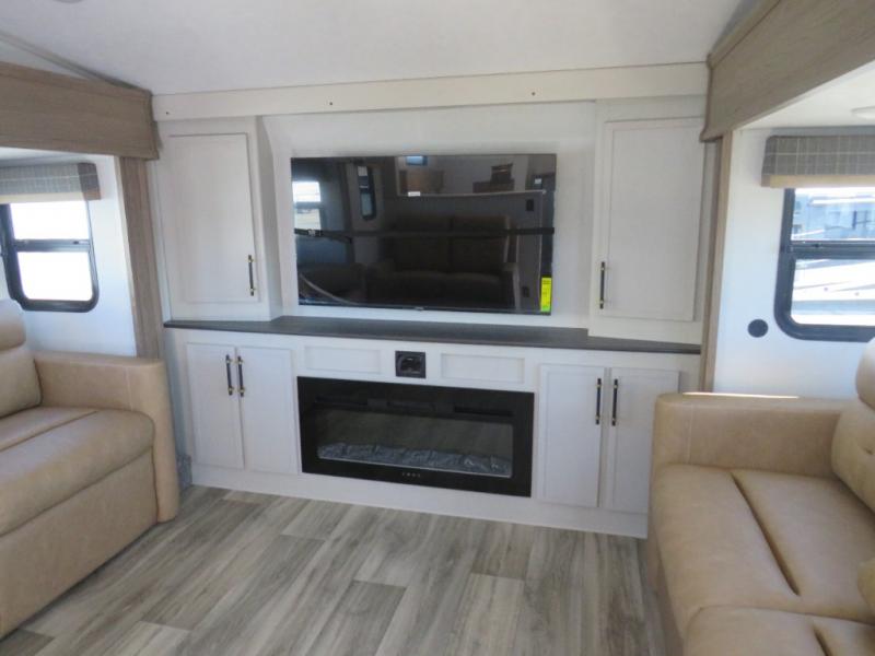 Experience a comfortable camping trip with this fifth wheel! The front living area not only has opposing sofa slides, but also theater seating across from an entertainment center with a 40" fireplace and a HD LED TV. The separate kitchen has everything you will need to prepare delicious home cooked meals including a glass top three burner cooktop with an oven and a kitchen island with a large sink that has a high rise faucet with a sprayer for an easy clean up. There is even a half bathroom by the kitchen so you can use it and quickly get back to cooking. The master suite has a king bed slide for more interior space, an entertainment center for a comfortable movie night, and access to the spacious full rear bathroom with a dual sink vanity, storage and washer/dryer prep!