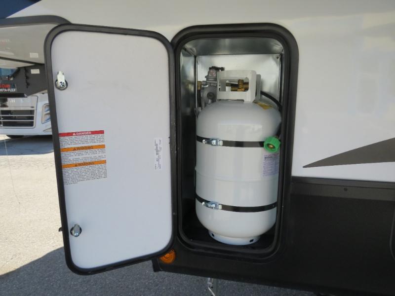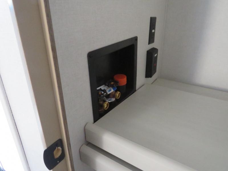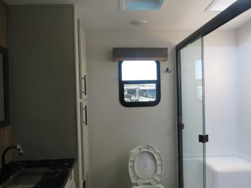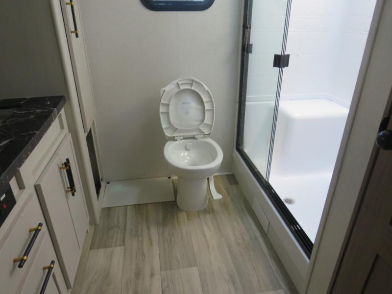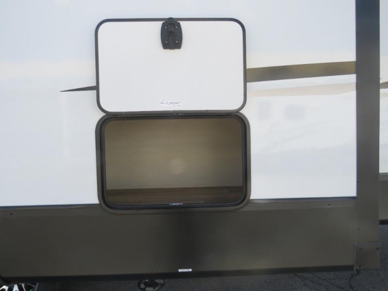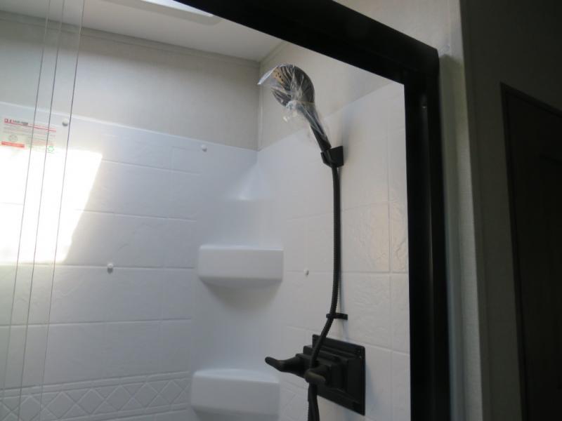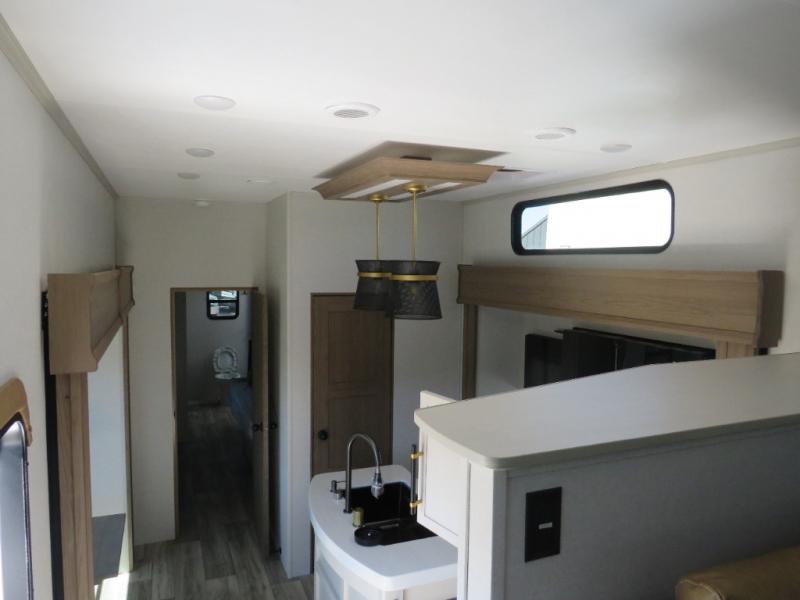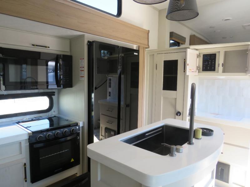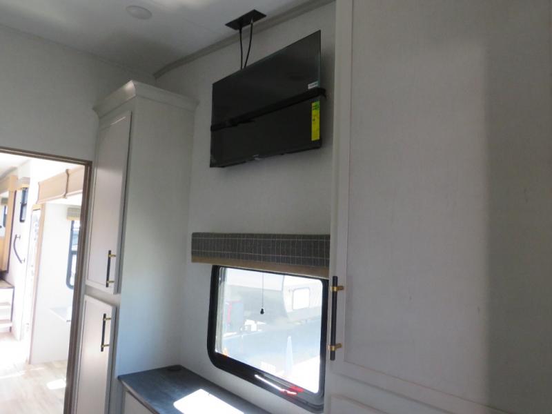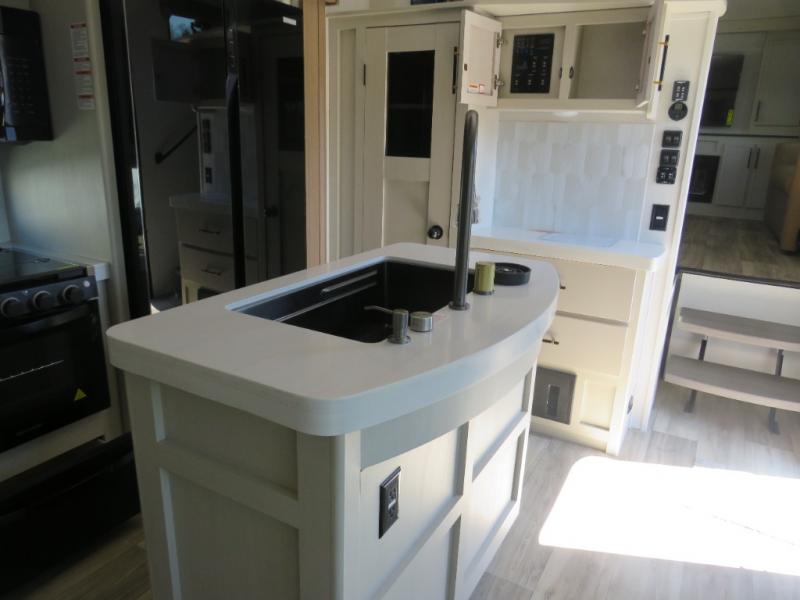 Experience a comfortable camping trip with this fifth wheel! The front living area not only has opposing sofa slides, but also theater seating across from an entertainment center with a 40" fireplace and a HD LED TV. The separate kitchen has everything you will need to prepare delicious home cooked meals including a glass top three burner cooktop with an oven and a kitchen island with a large sink that has a high rise faucet with a sprayer for an easy clean up. There is even a half bathroom by the kitchen so you can use it and quickly get back to cooking. The master suite has a king bed slide for more interior space, an entertainment center for a comfortable movie night, and access to the spacious full rear bathroom with a dual sink vanity, storage and washer/dryer prep!