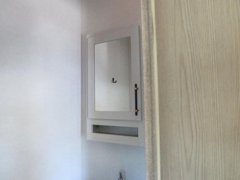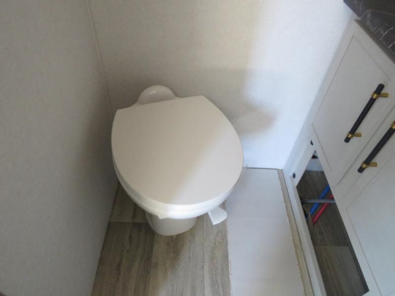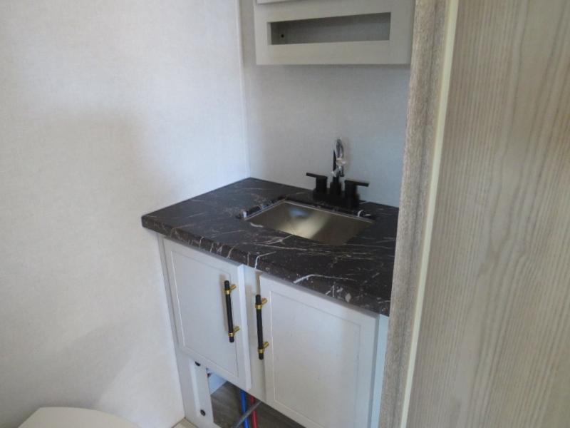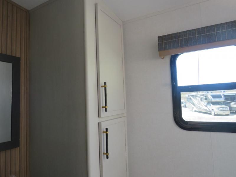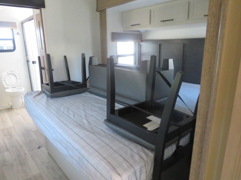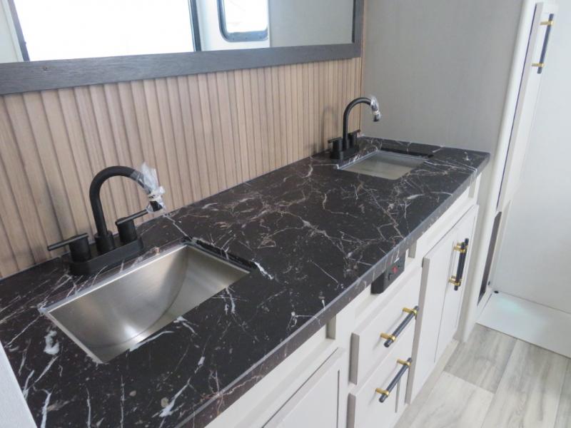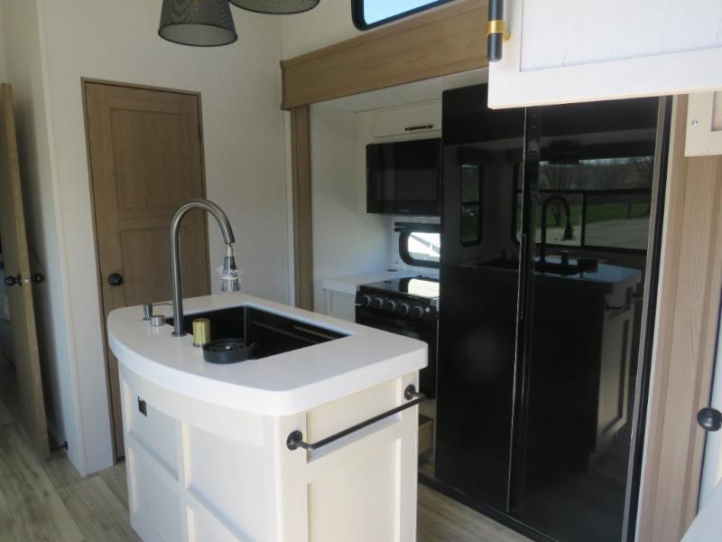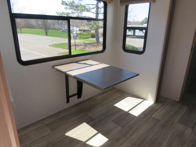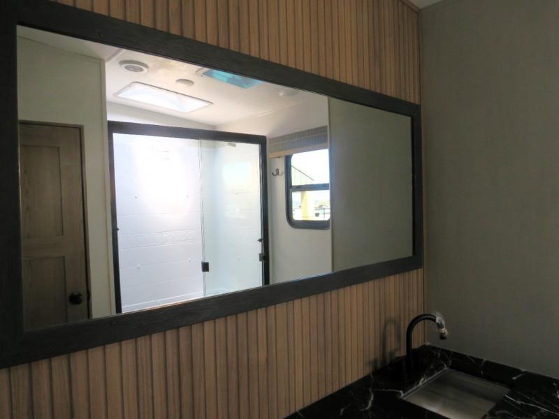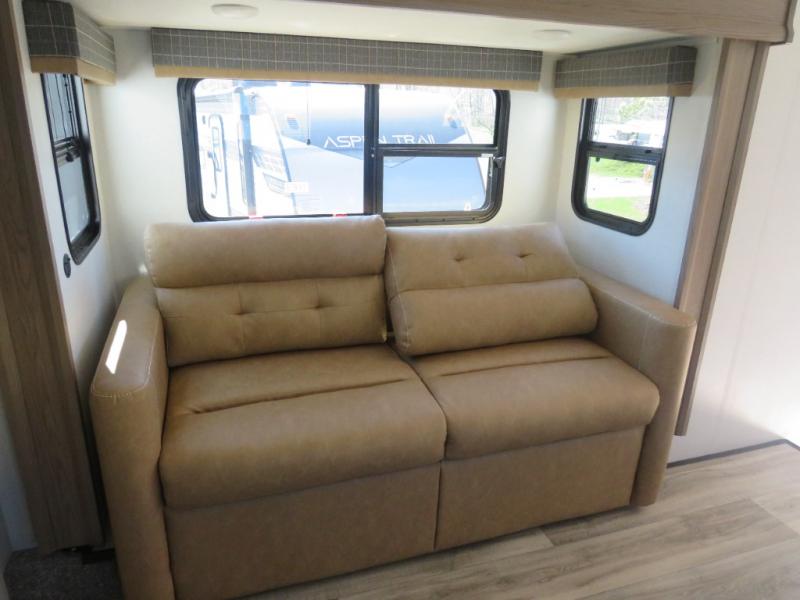 Experience a comfortable camping trip with this fifth wheel! The front living area not only has opposing sofa slides, but also theater seating across from an entertainment center with a 40" fireplace and a HD LED TV. The separate kitchen has everything you will need to prepare delicious home cooked meals including a glass top three burner cooktop with an oven and a kitchen island with a large sink that has a high rise faucet with a sprayer for an easy clean up. There is even a half bathroom by the kitchen so you can use it and quickly get back to cooking. The master suite has a king bed slide for more interior space, an entertainment center for a comfortable movie night, and access to the spacious full rear bathroom with a dual sink vanity, storage and washer/dryer prep!