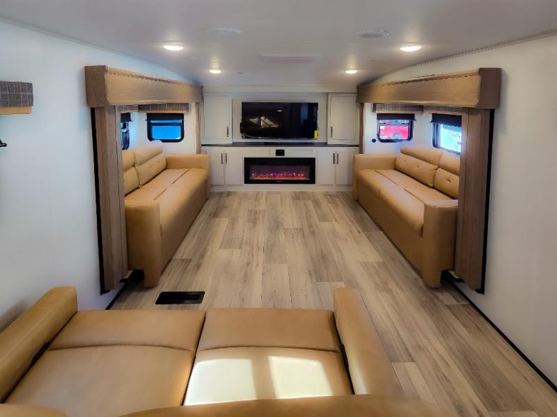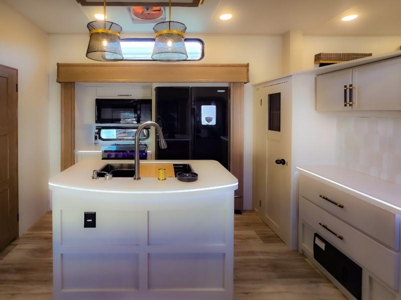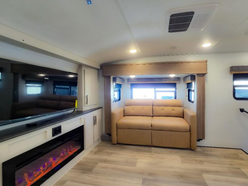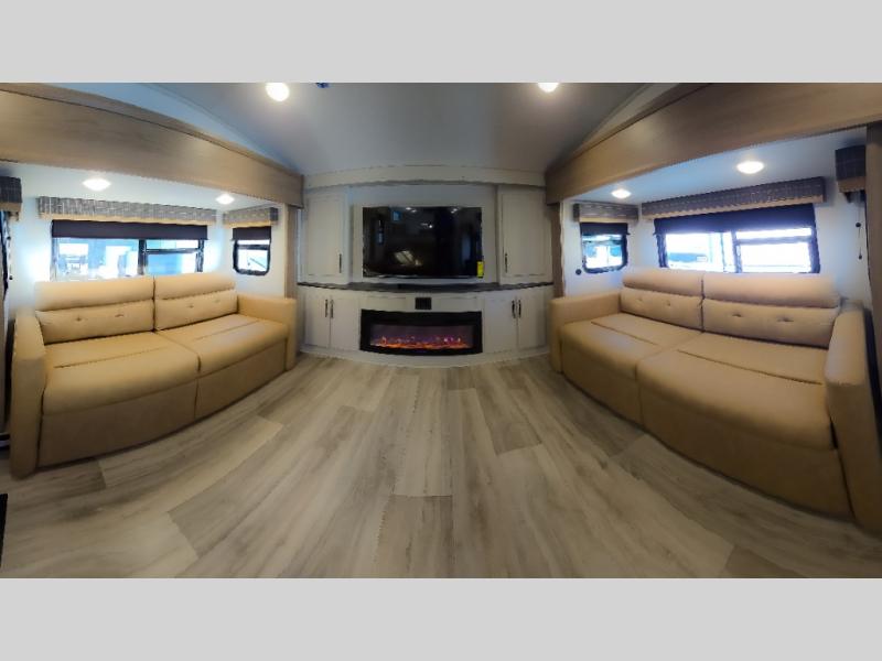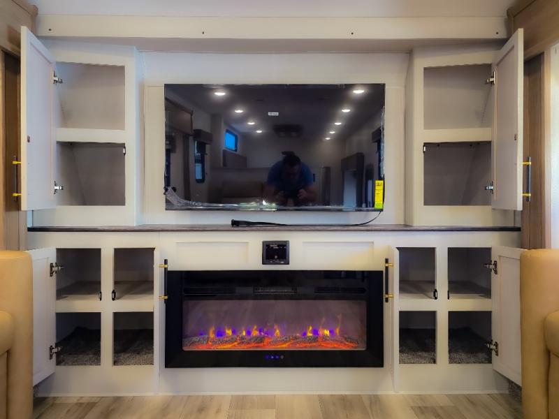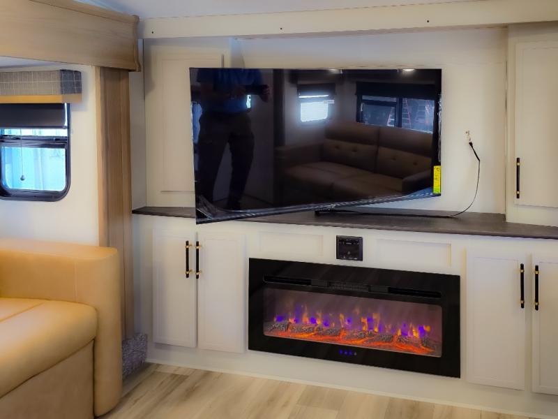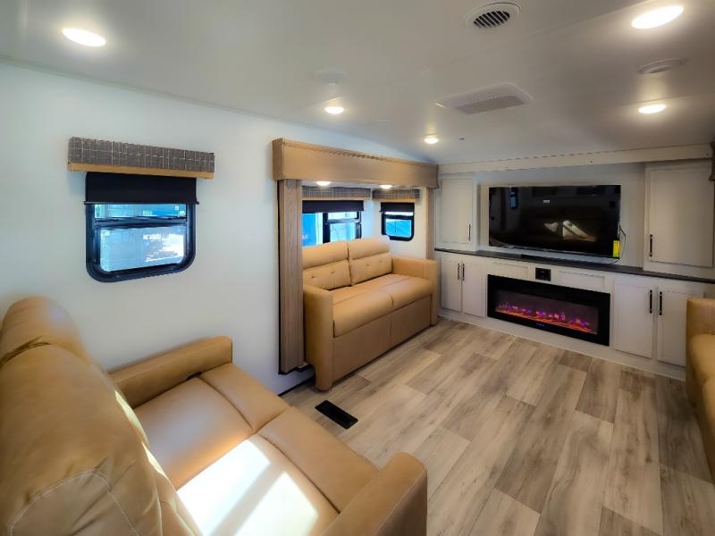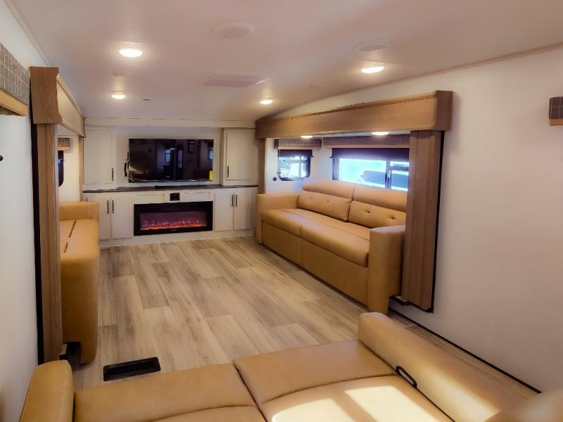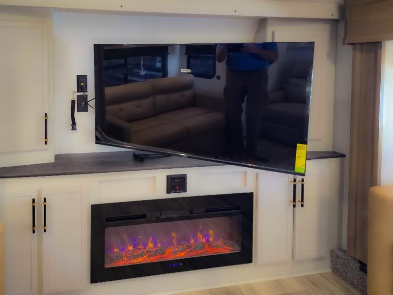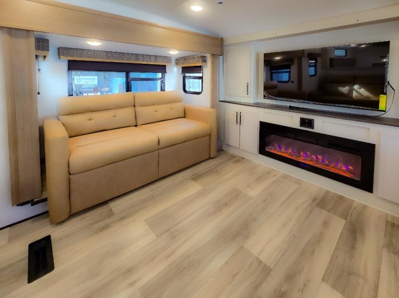 Experience a comfortable camping trip with this fifth wheel! The front living area not only has opposing sofa slides, but also theater seating across from an entertainment center with a 40" fireplace and a HD LED TV. The separate kitchen has everything you will need to prepare delicious home cooked meals including a glass top three burner cooktop with an oven and a kitchen island with a large sink that has a high rise faucet with a sprayer for an easy clean up. There is even a half bathroom by the kitchen so you can use it and quickly get back to cooking. The master suite has a king bed slide for more interior space, an entertainment center for a comfortable movie night, and access to the spacious full rear bathroom with a dual sink vanity, storage and washer/dryer prep!
