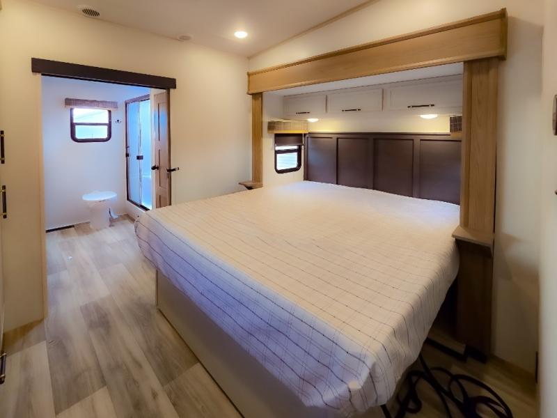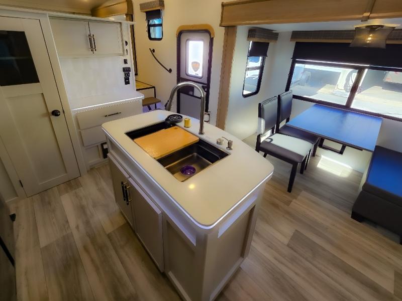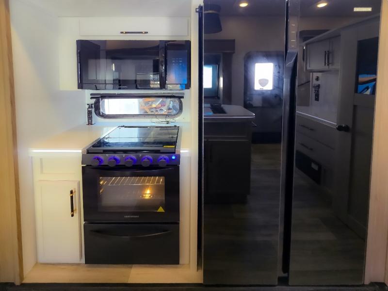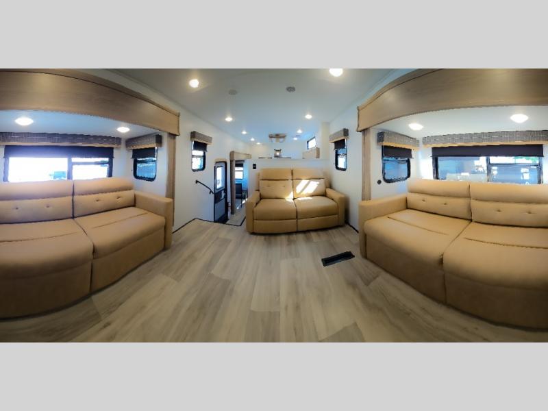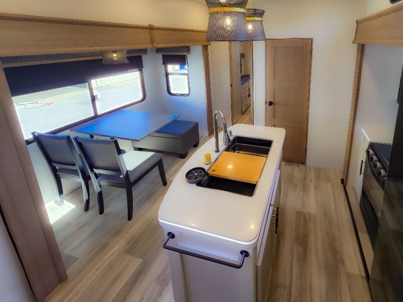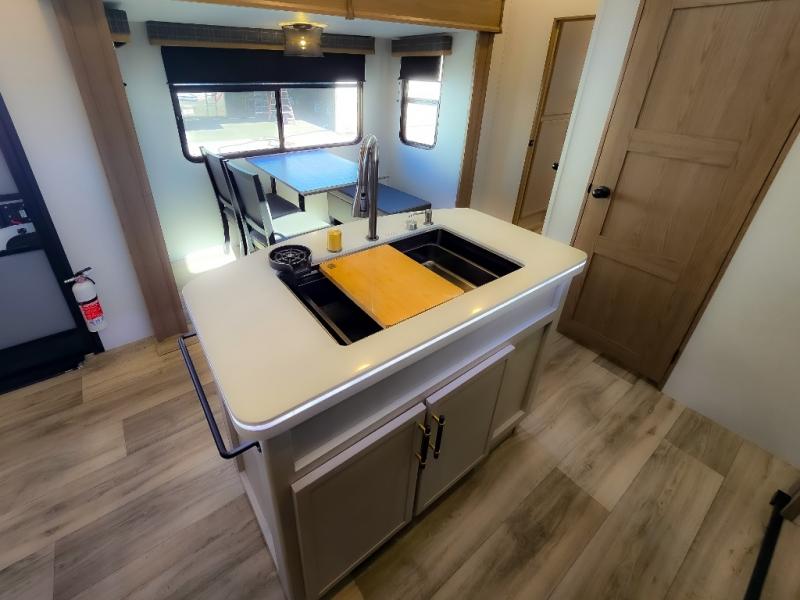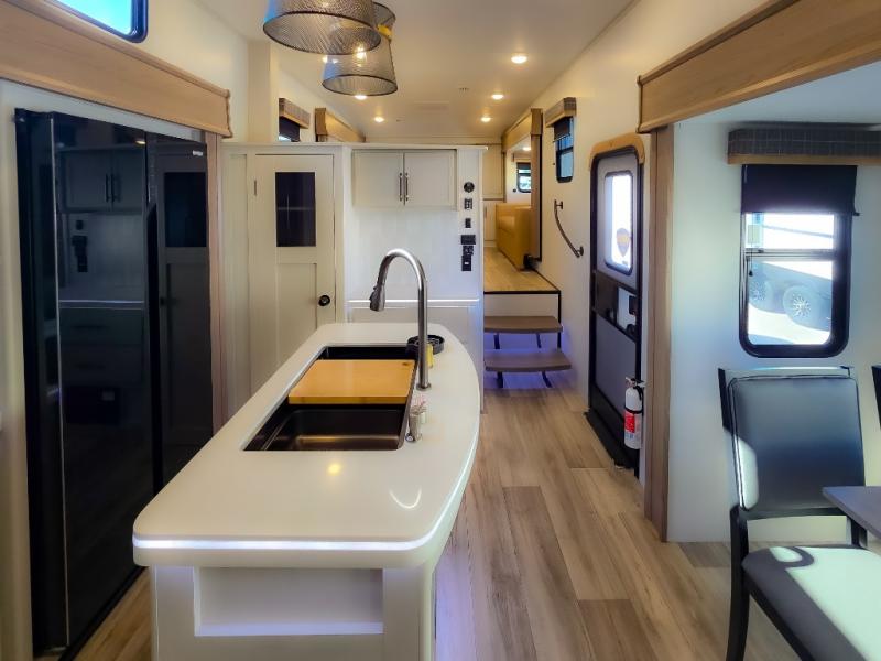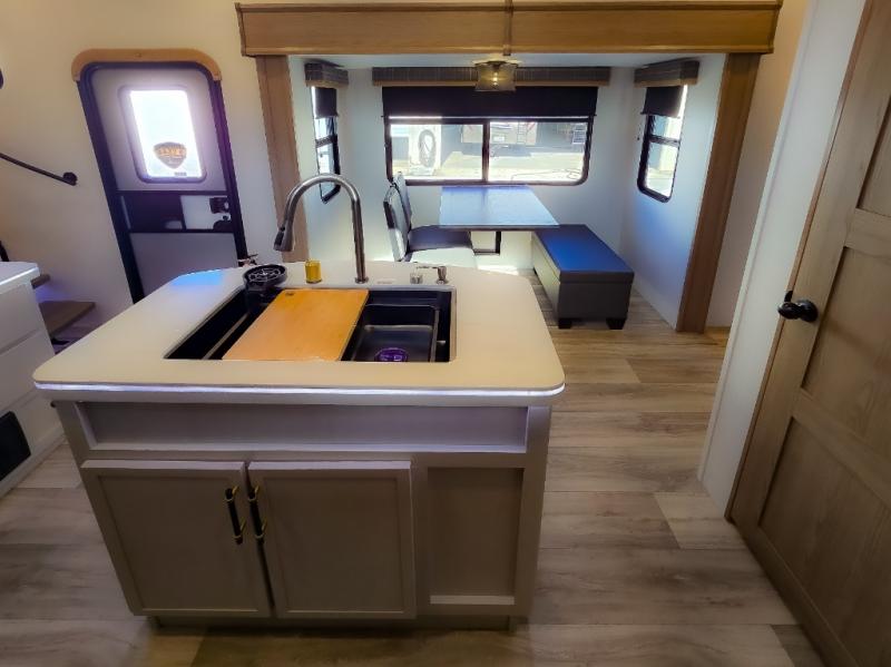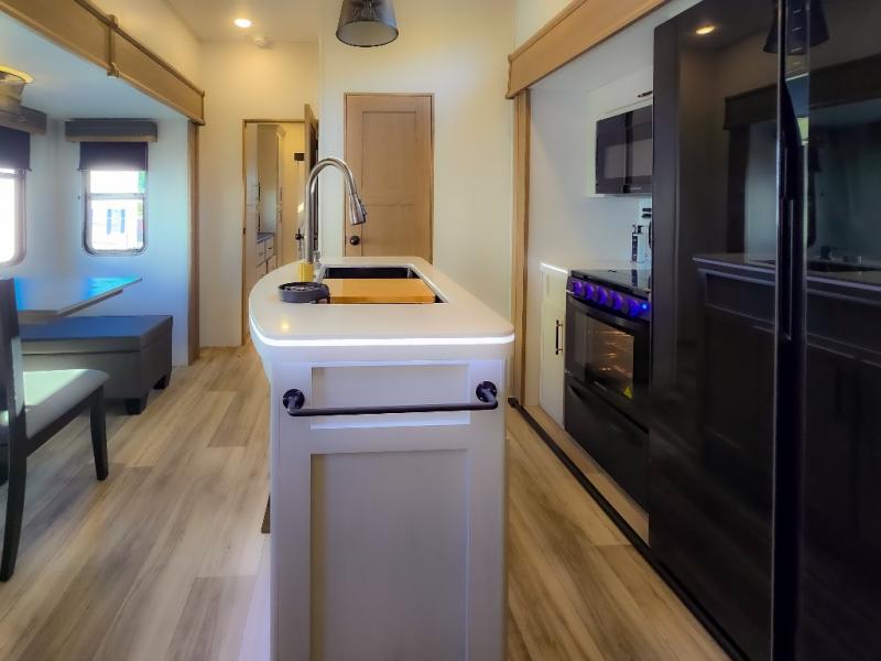Experience a comfortable camping trip with this fifth wheel! The front living area not only has opposing sofa slides, but also theater seating across from an entertainment center with a 40" fireplace and a HD LED TV. The separate kitchen has everything you will need to prepare delicious home cooked meals including a glass top three burner cooktop with an oven and a kitchen island with a large sink that has a high rise faucet with a sprayer for an easy clean up. There is even a half bathroom by the kitchen so you can use it and quickly get back to cooking. The master suite has a king bed slide for more interior space, an entertainment center for a comfortable movie night, and access to the spacious full rear bathroom with a dual sink vanity, storage and washer/dryer prep!