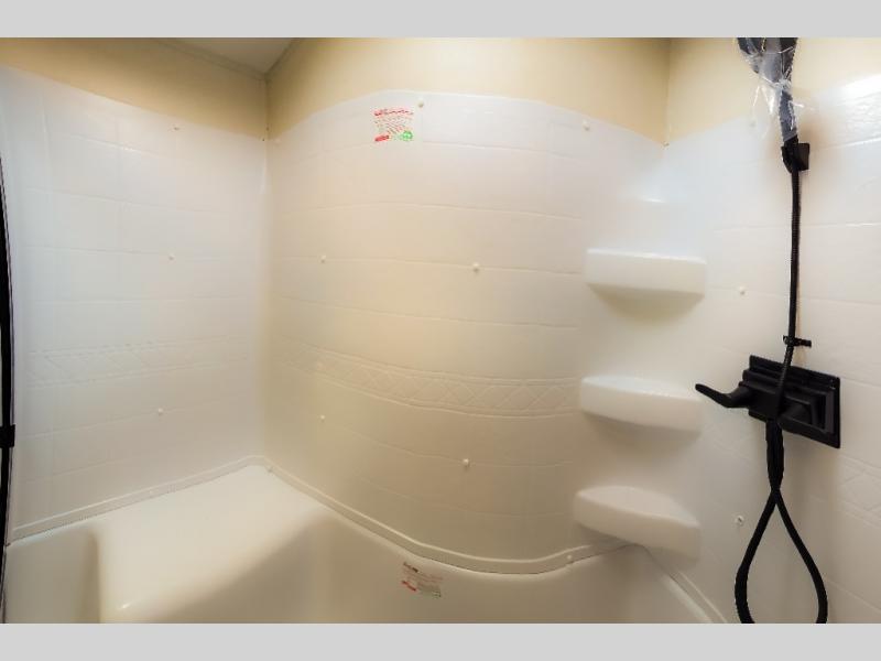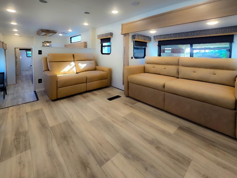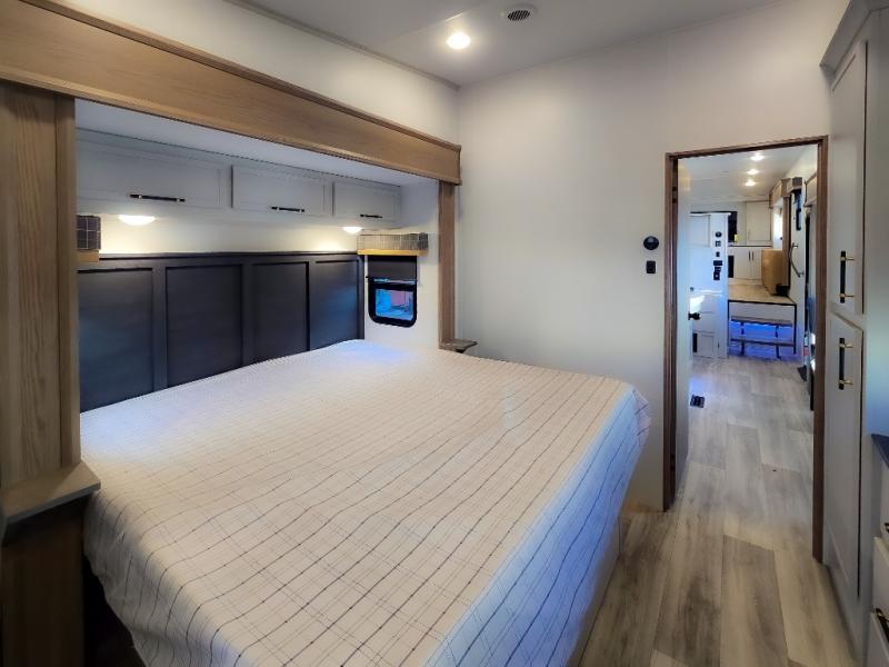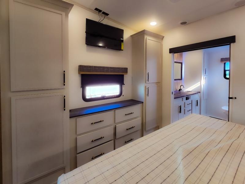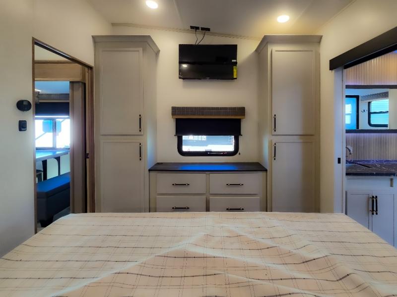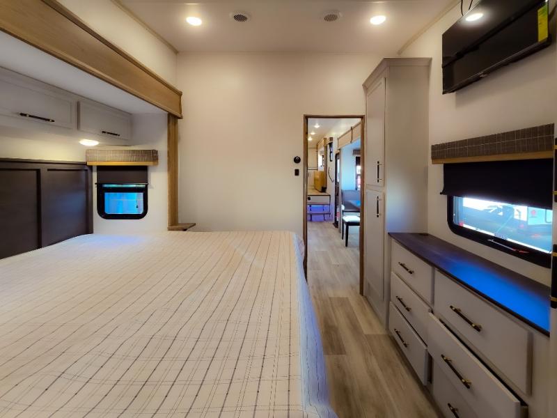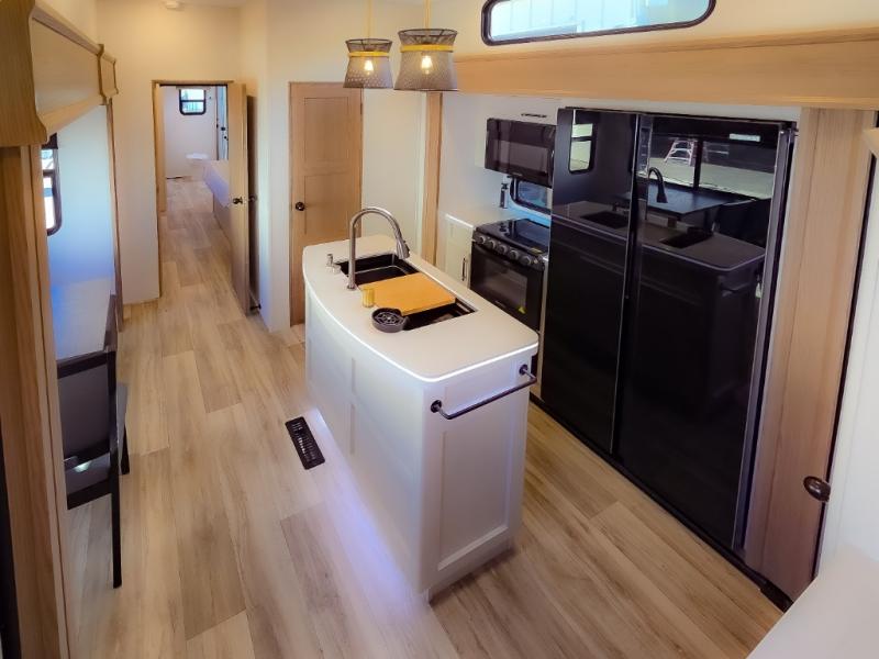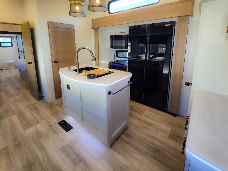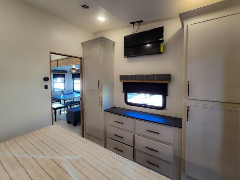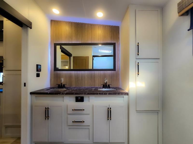 Experience a comfortable camping trip with this fifth wheel! The front living area not only has opposing sofa slides, but also theater seating across from an entertainment center with a 40" fireplace and a HD LED TV. The separate kitchen has everything you will need to prepare delicious home cooked meals including a glass top three burner cooktop with an oven and a kitchen island with a large sink that has a high rise faucet with a sprayer for an easy clean up. There is even a half bathroom by the kitchen so you can use it and quickly get back to cooking. The master suite has a king bed slide for more interior space, an entertainment center for a comfortable movie night, and access to the spacious full rear bathroom with a dual sink vanity, storage and washer/dryer prep!