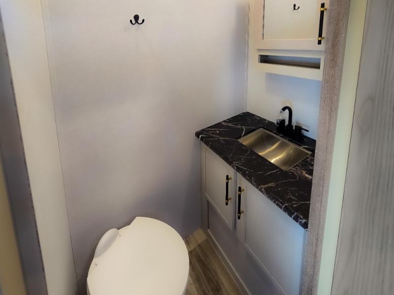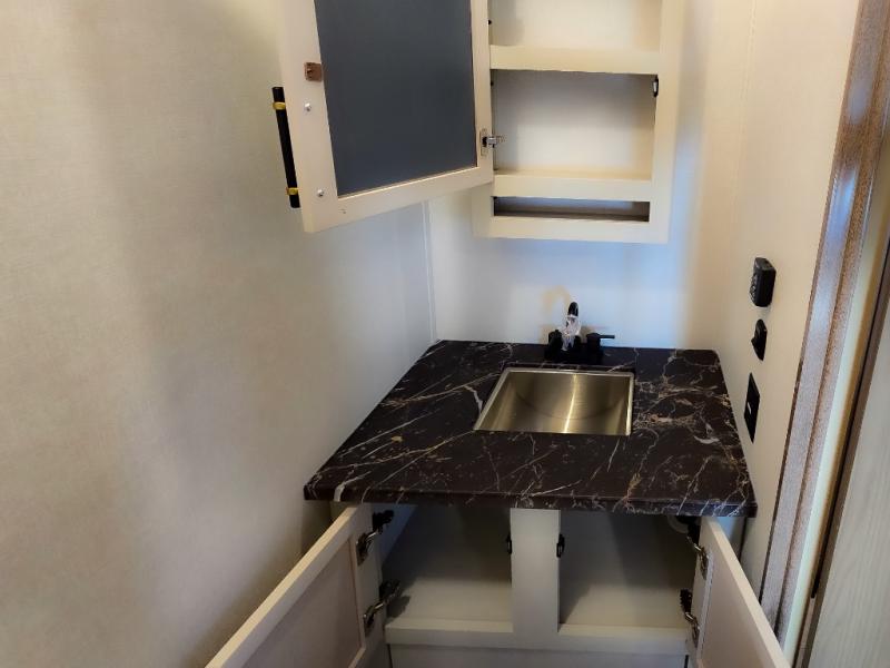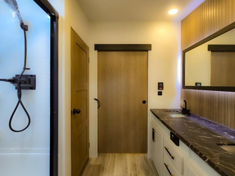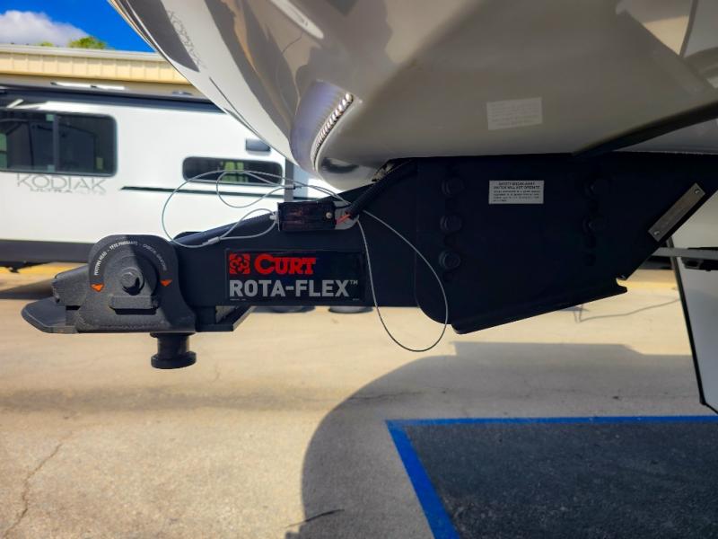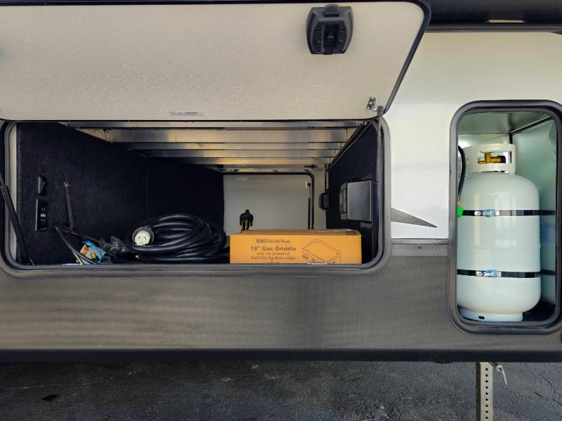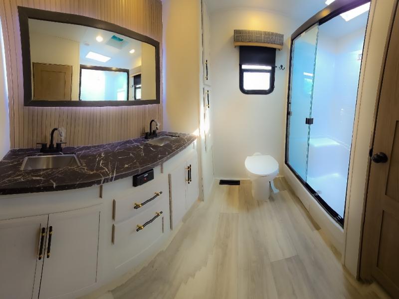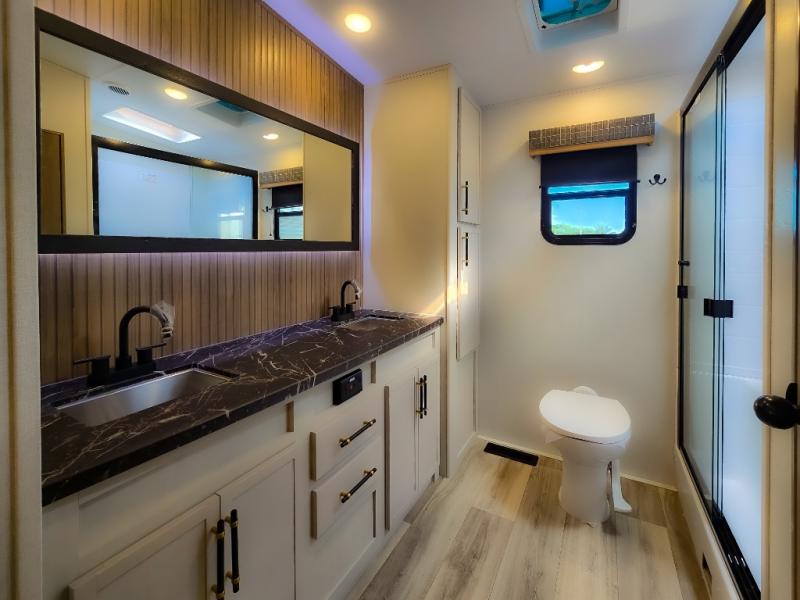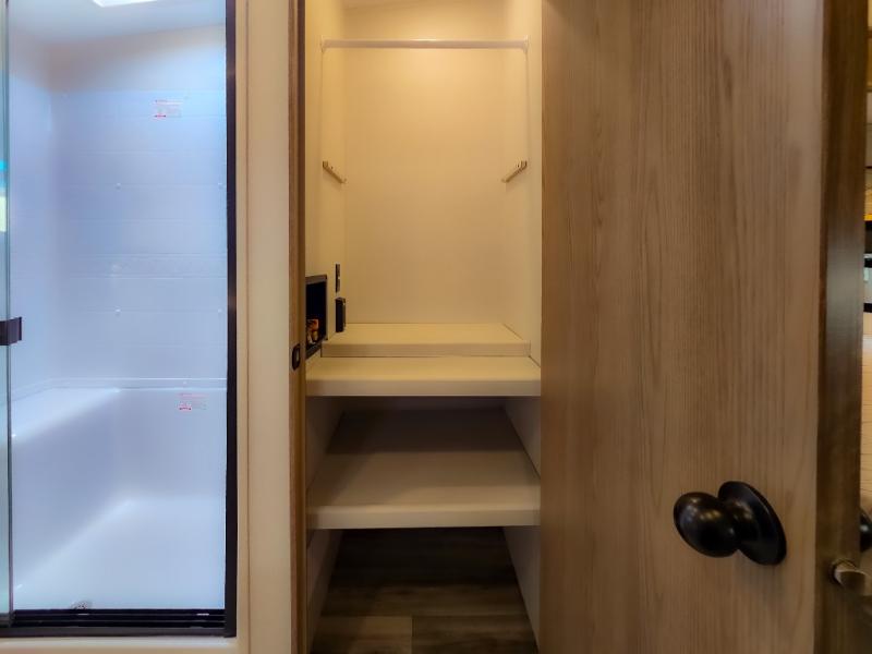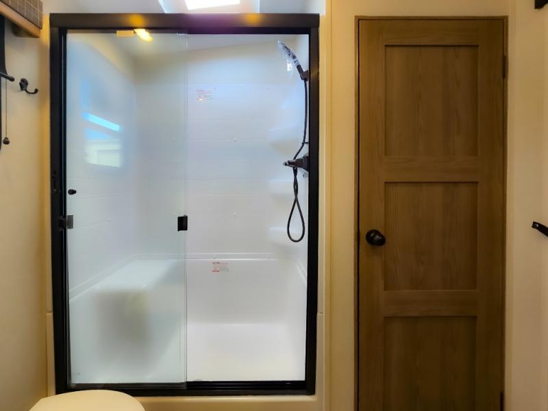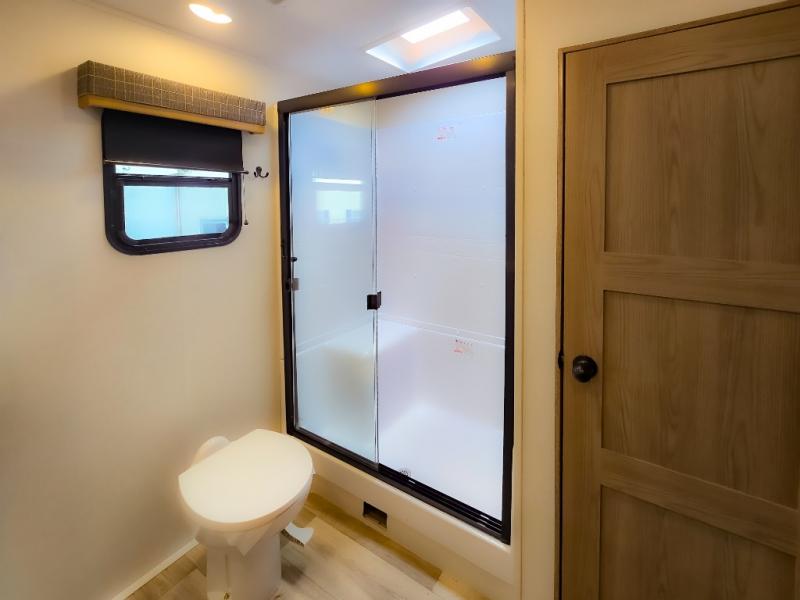 Experience a comfortable camping trip with this fifth wheel! The front living area not only has opposing sofa slides, but also theater seating across from an entertainment center with a 40" fireplace and a HD LED TV. The separate kitchen has everything you will need to prepare delicious home cooked meals including a glass top three burner cooktop with an oven and a kitchen island with a large sink that has a high rise faucet with a sprayer for an easy clean up. There is even a half bathroom by the kitchen so you can use it and quickly get back to cooking. The master suite has a king bed slide for more interior space, an entertainment center for a comfortable movie night, and access to the spacious full rear bathroom with a dual sink vanity, storage and washer/dryer prep!