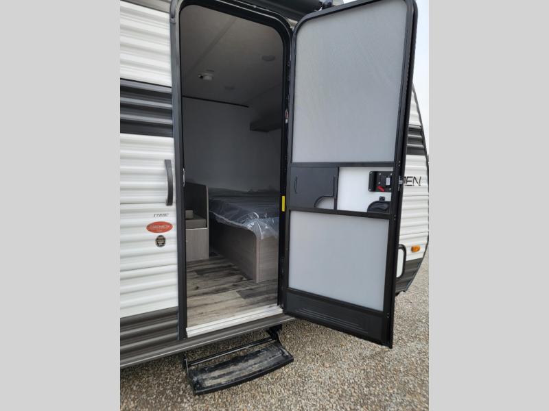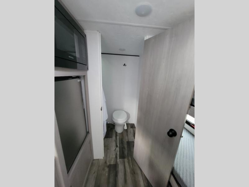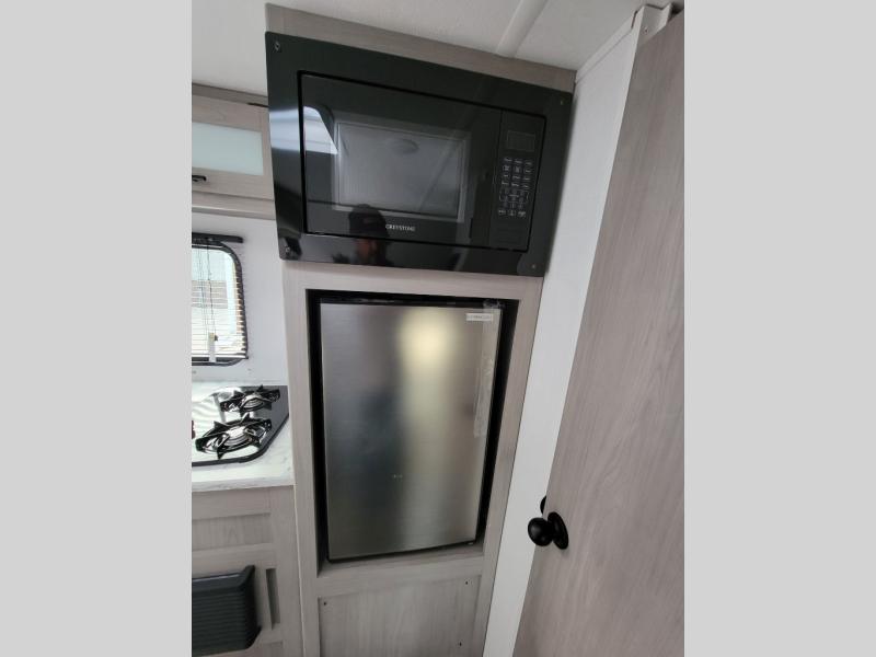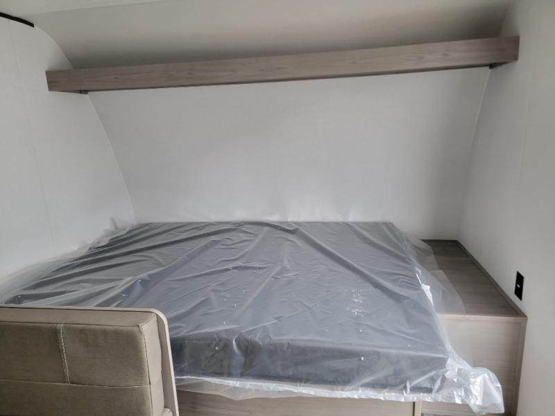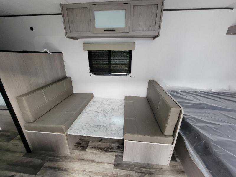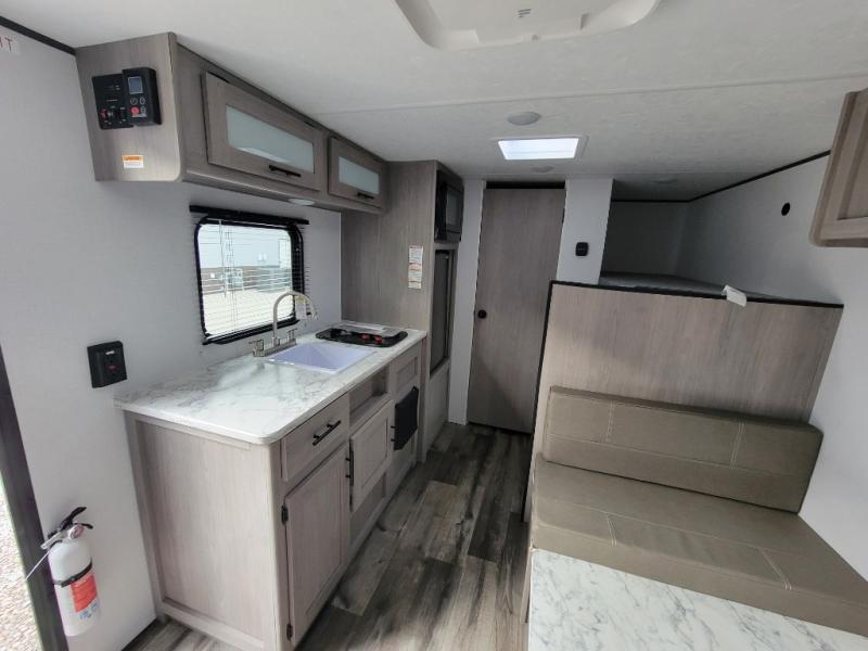 A perfect trailer for your family of three to five featuring a set of bunk beds for the kids or guests, a queen bed up front for you, and the booth dinette can be converted to sleep one or two more depending on size. This unit is cozy and convenient providing you just what you need to enjoy a little adventure away from home. For meals, there is a two burner cooktop and sink, plus a 3.3 cu. ft. 12V refrigerator for your perishables. You will all appreciate the convenience of having your own private bath so that you don't need to use the campground facilities at night. You will also enjoy spending time outside with an 8' power awning to provide even more living space outdoors!