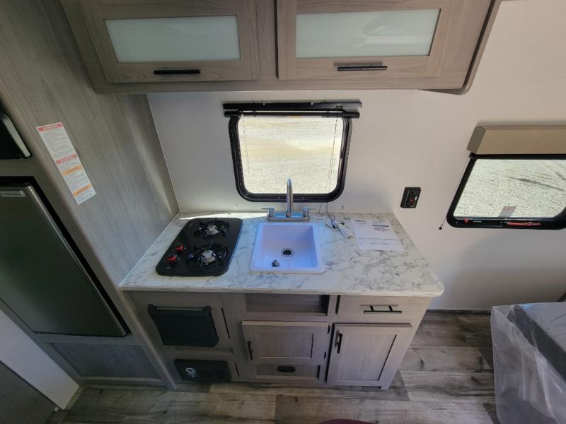 This single axle travel trailer is the perfect couple's trailer with space for an overnight guest on the booth dinette. The queen bed up front will provide a great night's rest instead of sleeping on an air mattress, and the full rear bath means you won't have to use the camp's facilities at night. You'll also find a 3.3 cu. ft. 12V refrigerator for food storage, a two burner cooktop, plus a microwave oven for all your cooking needs!