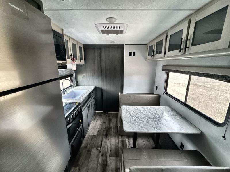 Step into convenient camping in this cozy travel trailer for three to four. There is a cooktop and a microwave to cook meals on and a refrigerator to hold cold items. Your crew can dine at the booth dinette that includes overhead storage, or head outdoors to sit under the 16' awning. Once your meal is done, grab the fishing poles from the pass-through storage and head down to the water. There is a full bath on board that will let you clean up when you're done, and the residential queen bed up front is sure to provide a great night's rest!