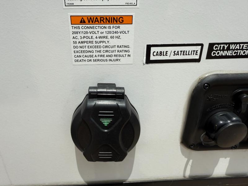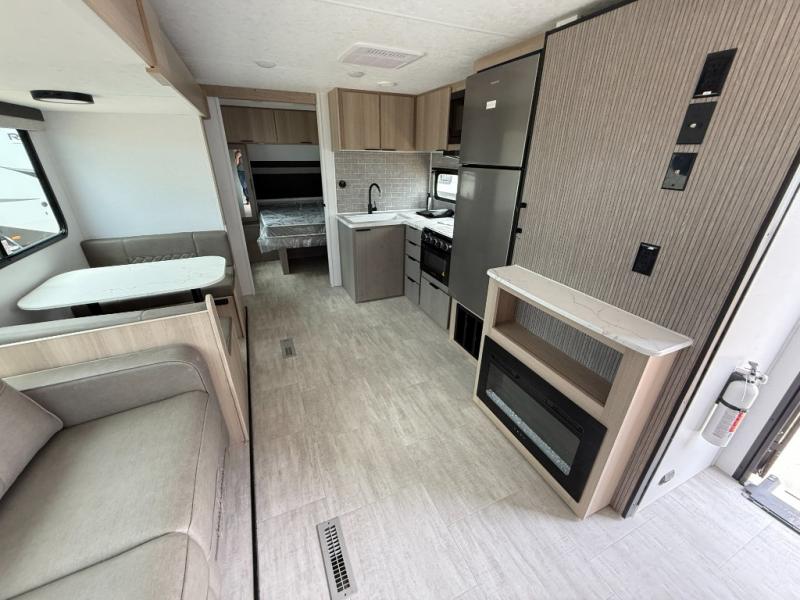 There is comfort found all throughout this travel trailer! Cook your meals with the cooktop, a microwave for popping a bag of popcorn on movie night, and a 10 cu. ft. refrigerator to hold cold items. Your crew can dine at the booth dinette that includes overhead storage, or head outdoors to sit under the 14' power awning. Once your meal is done, grab the fishing poles from the pass-through storage and head down to the water. There is a full rear bathroom with a radius shower and exhaust fan on board that will let you clean up when you're done, and the queen bed up front is sure to provide a great night's rest. You even have a hinged entertainment center with fireplace across from the theater seating!