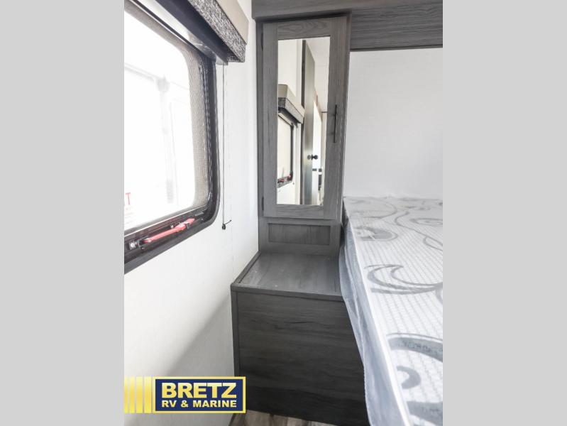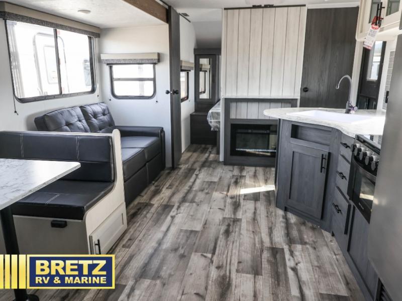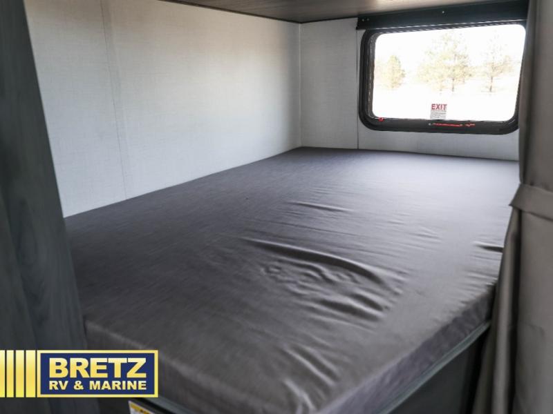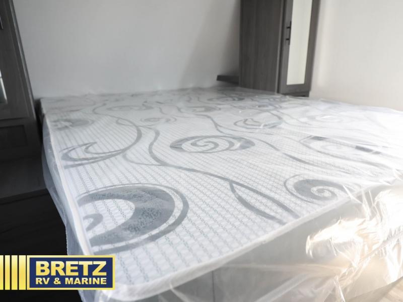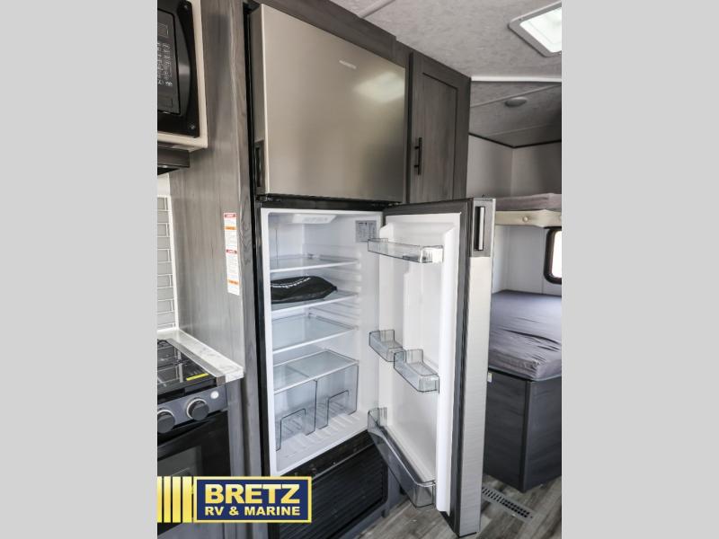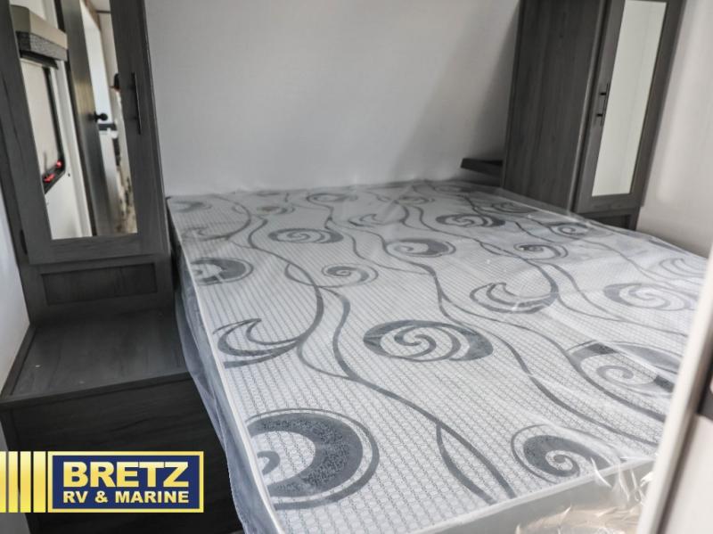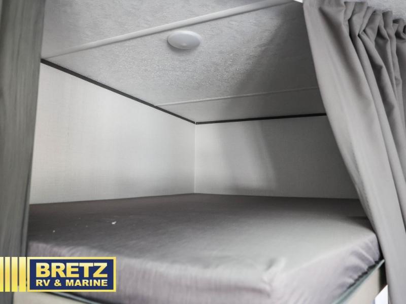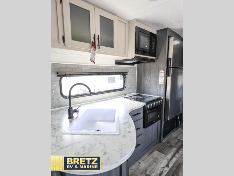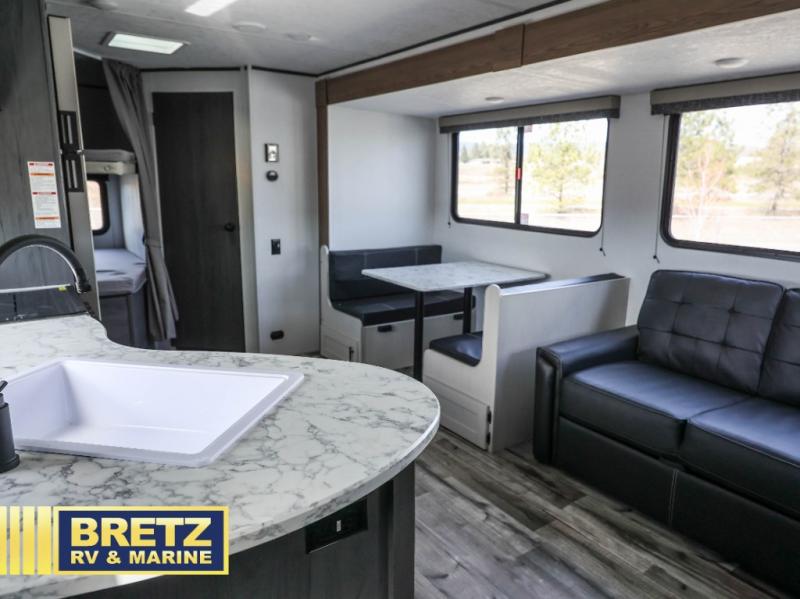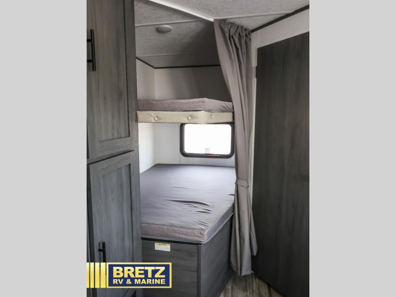 When you camp with your family you still need privacy, and this travel trailer will deliver that with the front bedroom with dual entry doors! Here, you'll find a residential queen bed with closets on each side and windows for some natural lighting. The main living and kitchen area offers a large slide out with a booth dinette and jack knife sofa with a foot rest and your guests can sleep here as well as the double-size bunks. The kitchen offers everything at the cook's fingertips to keep everyone fed, plus there is an outdoor griddle for breakfast outside. You'll also enjoy the 16' power awning with LED lights and the pass-through storage where fishing poles can be stored!