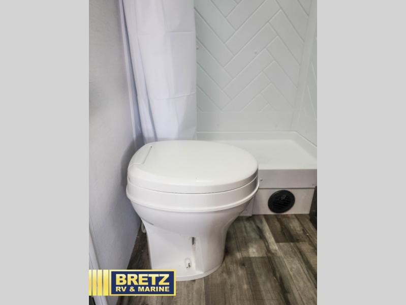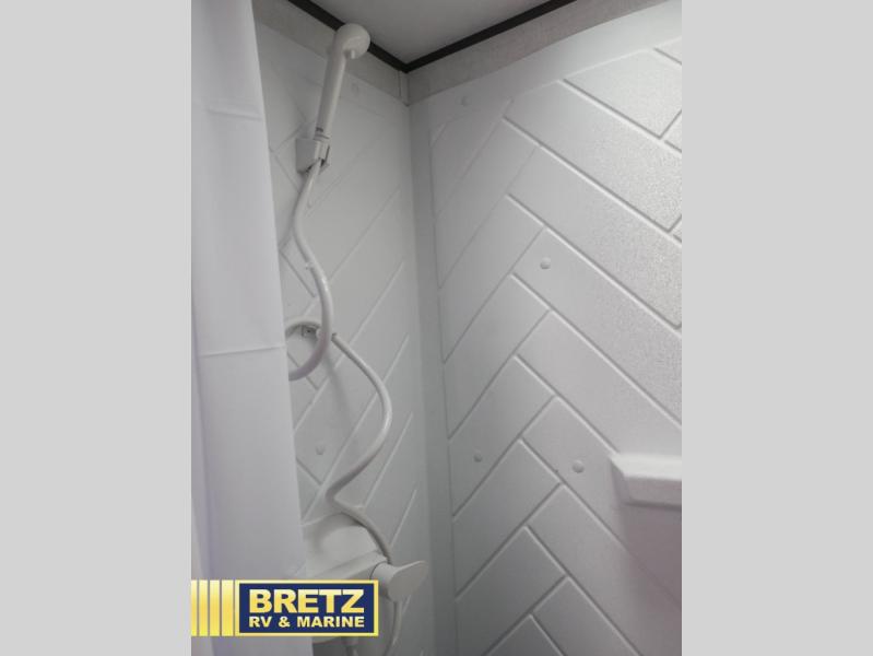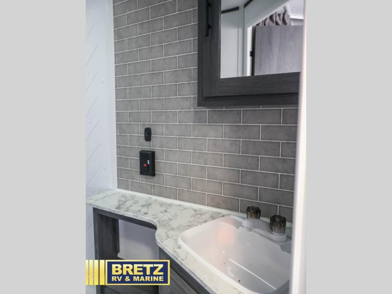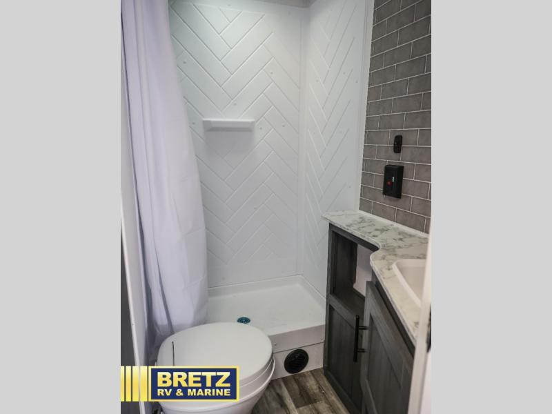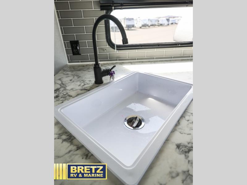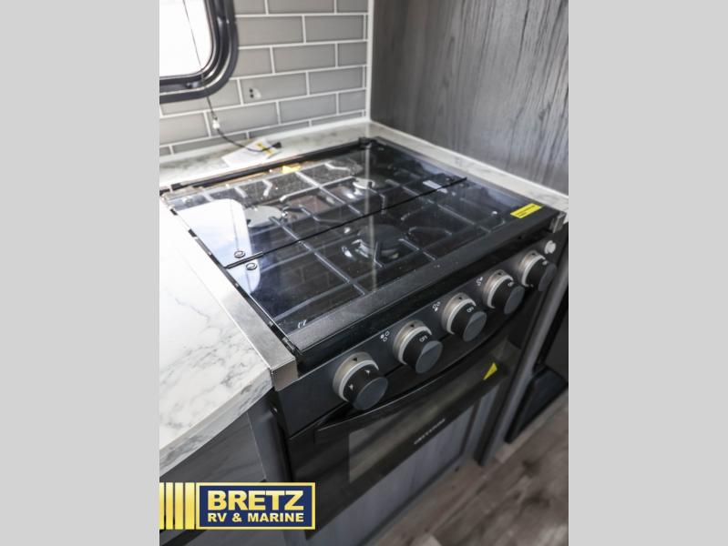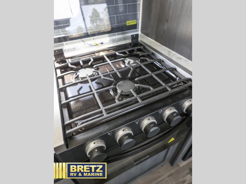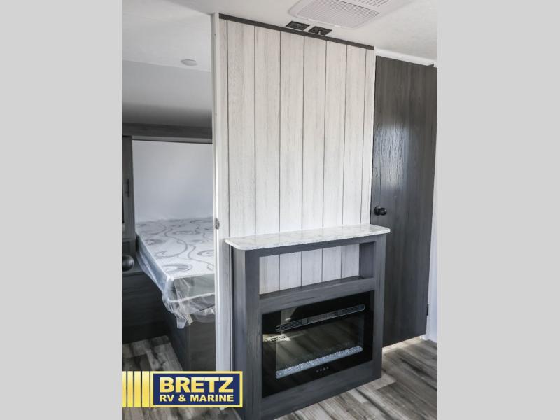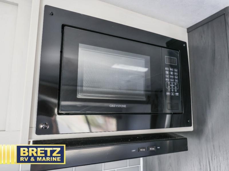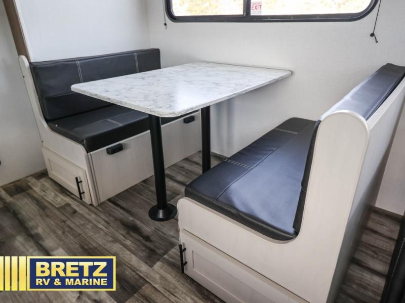 When you camp with your family you still need privacy, and this travel trailer will deliver that with the front bedroom with dual entry doors! Here, you'll find a residential queen bed with closets on each side and windows for some natural lighting. The main living and kitchen area offers a large slide out with a booth dinette and jack knife sofa with a foot rest and your guests can sleep here as well as the double-size bunks. The kitchen offers everything at the cook's fingertips to keep everyone fed, plus there is an outdoor griddle for breakfast outside. You'll also enjoy the 16' power awning with LED lights and the pass-through storage where fishing poles can be stored!