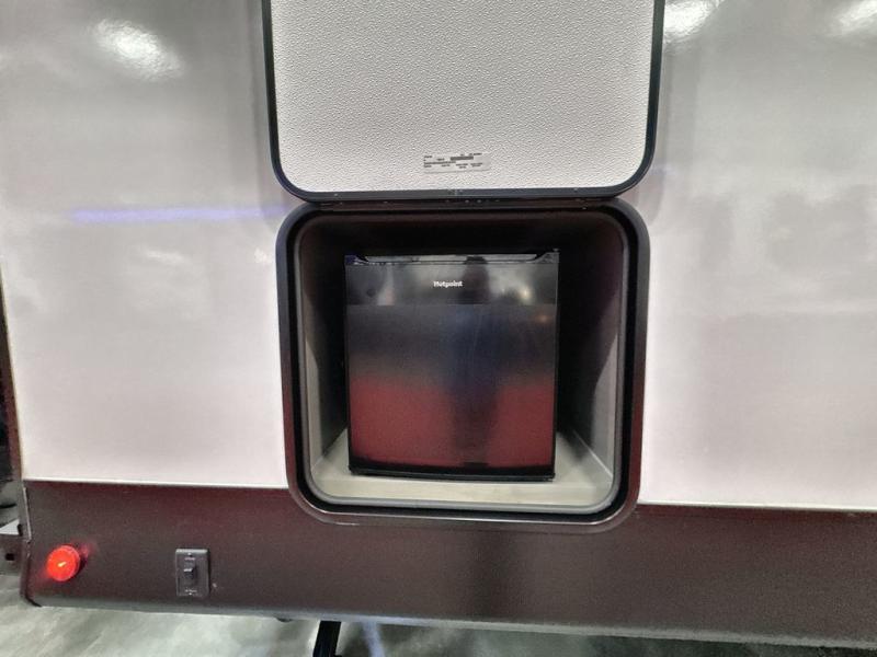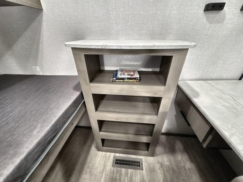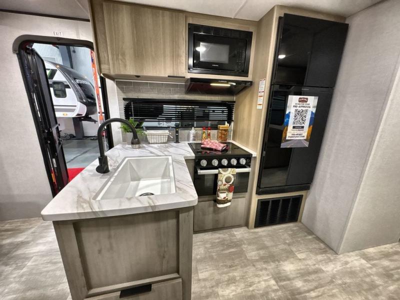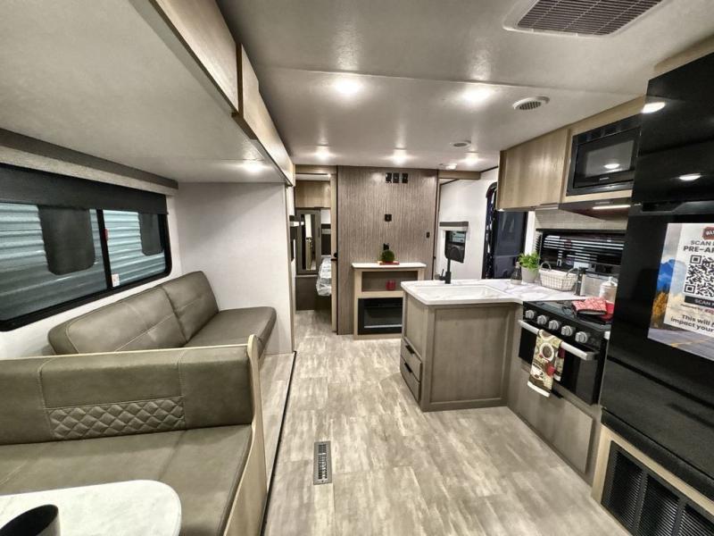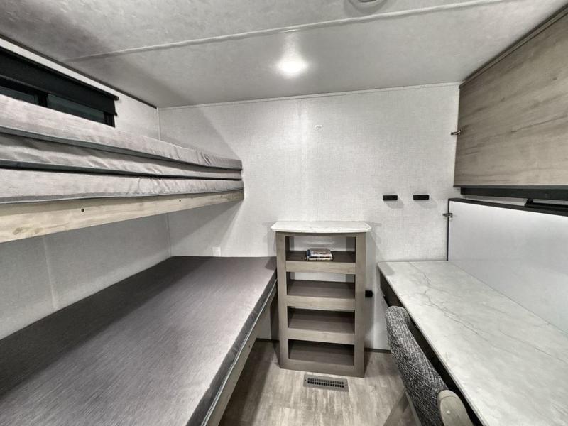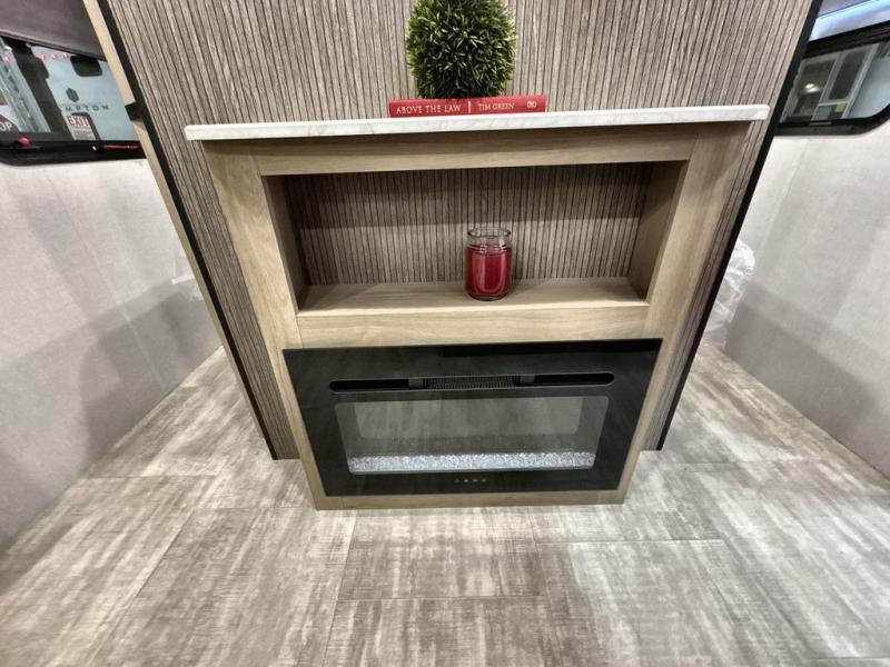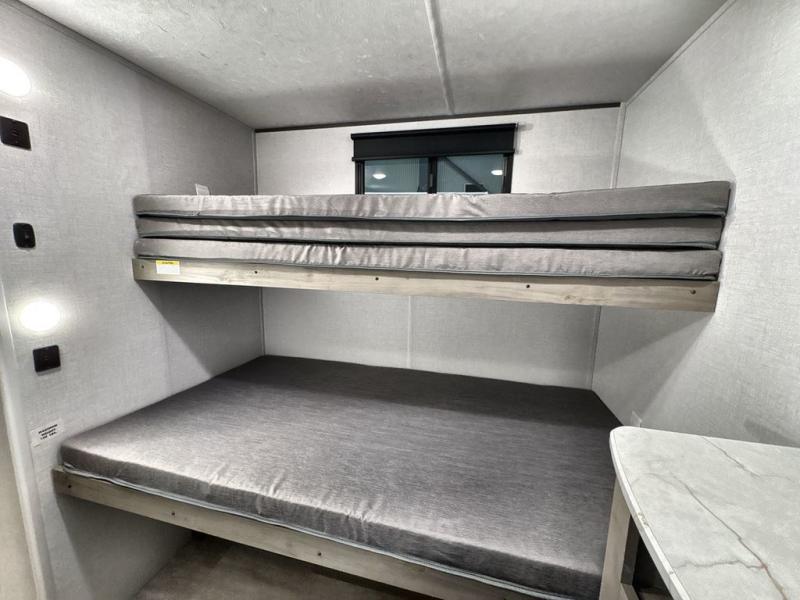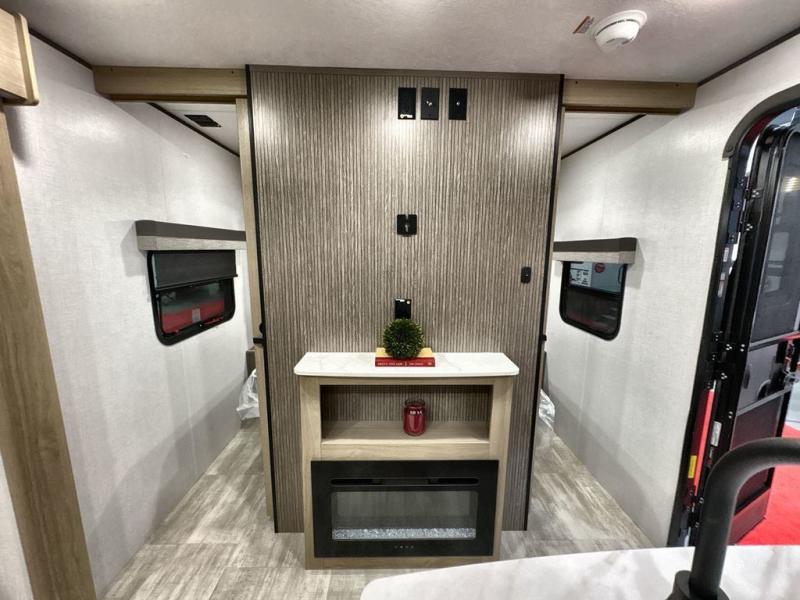Pack your bags and head out on a great family vacation in this travel trailer! You will enjoy a good night's rest on the queen bed in the front private bedroom, and the kids will enjoy having their own rear private bunkhouse with a set of bunk beds and a fold down bed above a booth dinette. If you need an extra sleeping space, then you can transform the living area booth dinette. The theater seating offers a comfortable place to sit while relaxing in front of the fireplace. The fully equipped kitchen has everything you need to prepare your best home cooked meals. After a fun-filled day at the beach, you can head to the full bathroom to rinse the sand out of your hair in the shower with exhaust fan!