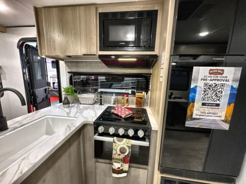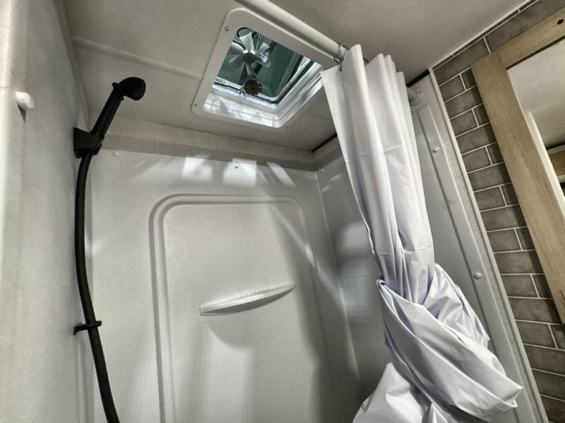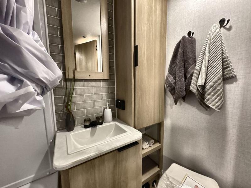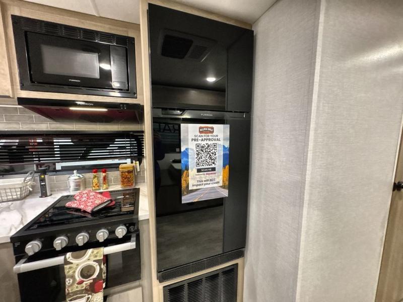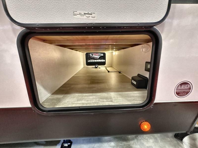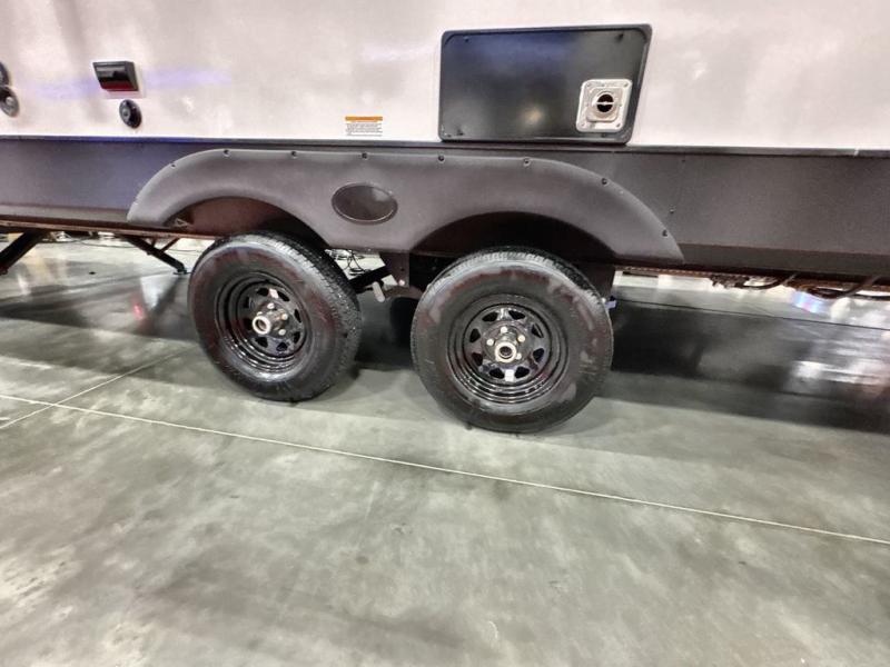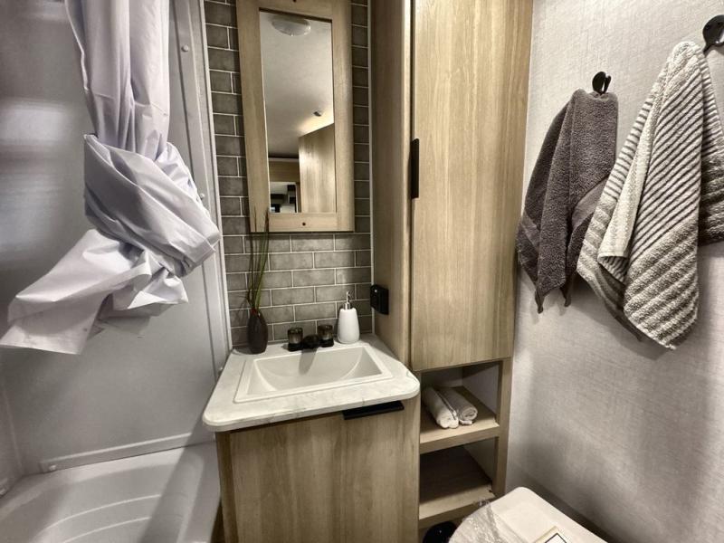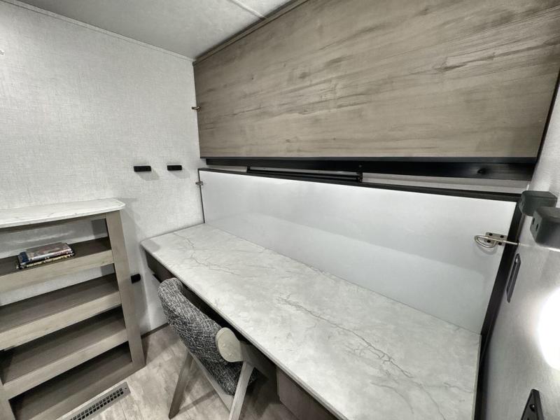 Pack your bags and head out on a great family vacation in this travel trailer! You will enjoy a good night's rest on the queen bed in the front private bedroom, and the kids will enjoy having their own rear private bunkhouse with a set of bunk beds and a fold down bed above a booth dinette. If you need an extra sleeping space, then you can transform the living area booth dinette. The theater seating offers a comfortable place to sit while relaxing in front of the fireplace. The fully equipped kitchen has everything you need to prepare your best home cooked meals. After a fun-filled day at the beach, you can head to the full bathroom to rinse the sand out of your hair in the shower with exhaust fan!