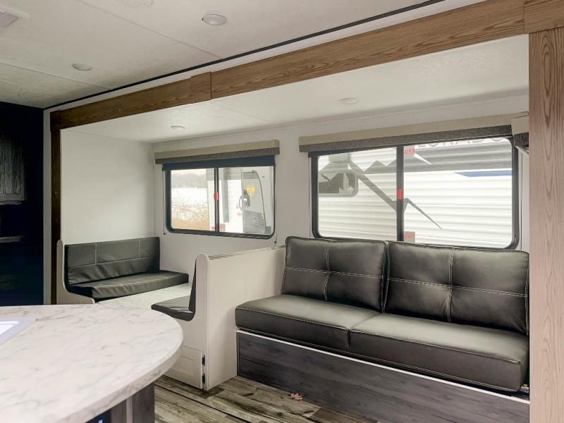 When you enjoy hosting family and friends, this bunkhouse trailer makes sense! You will be able to offer them a private bunkhouse with triple bunks and seating that doubles as sleeping space and/or the living room furniture to sleep on. Your oasis will be in the front bedroom which includes your own residential queen bed and plenty of storage for your clothes and things. The central living area offers seating, dining and cooking amenities, plus a full bathroom which is super convenient.