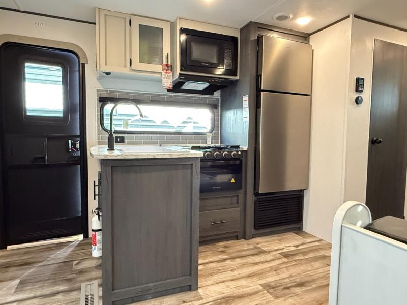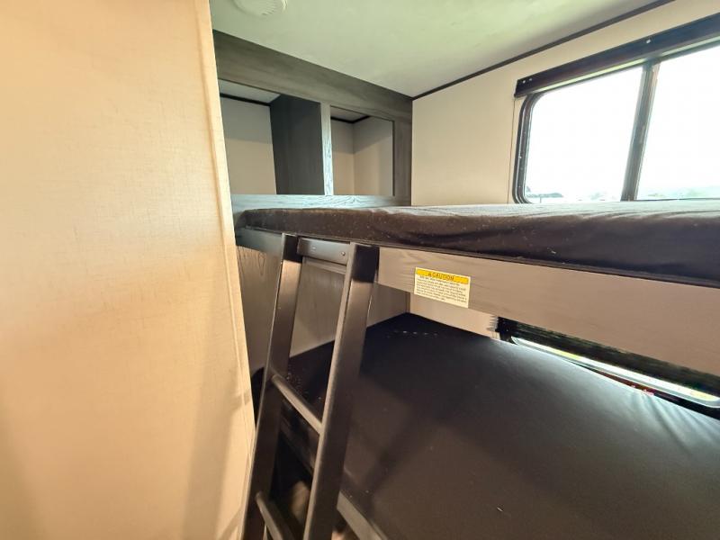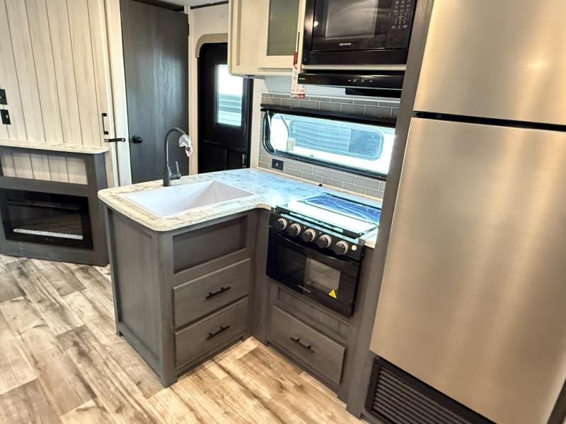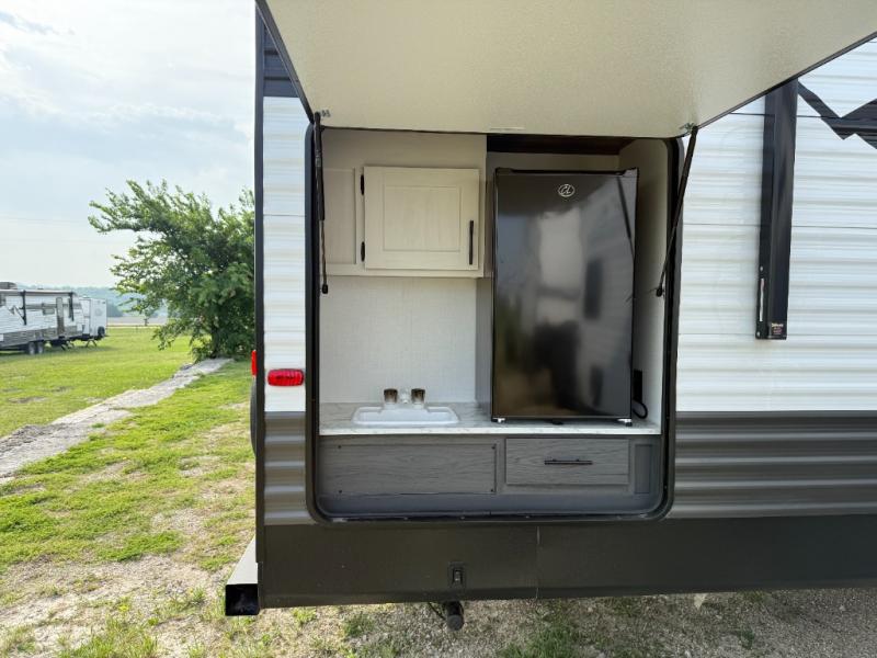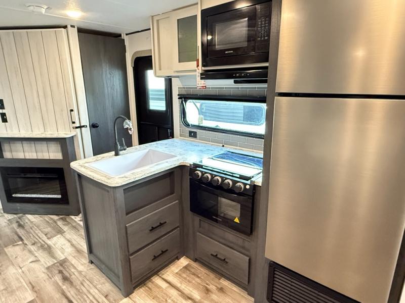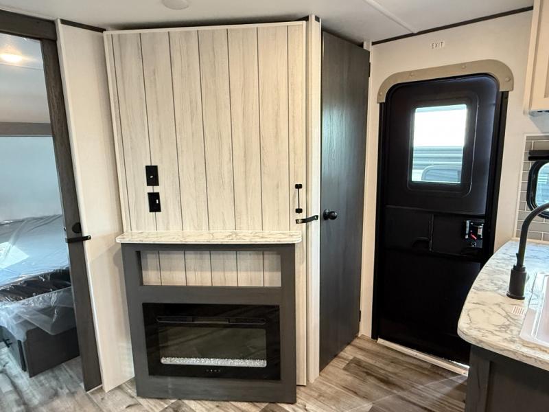 You will have everything you need in this travel trailer! Starting with a fully equipped interior kitchen, as well as an outdoor kitchen to prepare all of your favorite meals. Enjoy your meals at the booth dinette and then either play a card game or head to the jackknife sofa with footrests to let your stomach settle while you relax in front of the cozy fireplace at the hinged entertainment center. The full bathroom has a shower with exhaust fan so you can rinse all of the sand out of your hair or off your feet each night. The rear private bunkhouse has a set of bunk beds with a ladder for privacy while changing or sleeping!