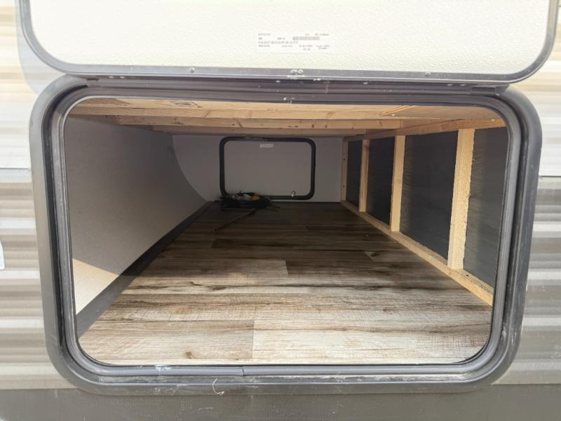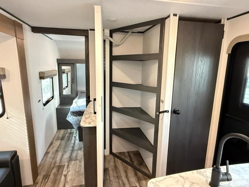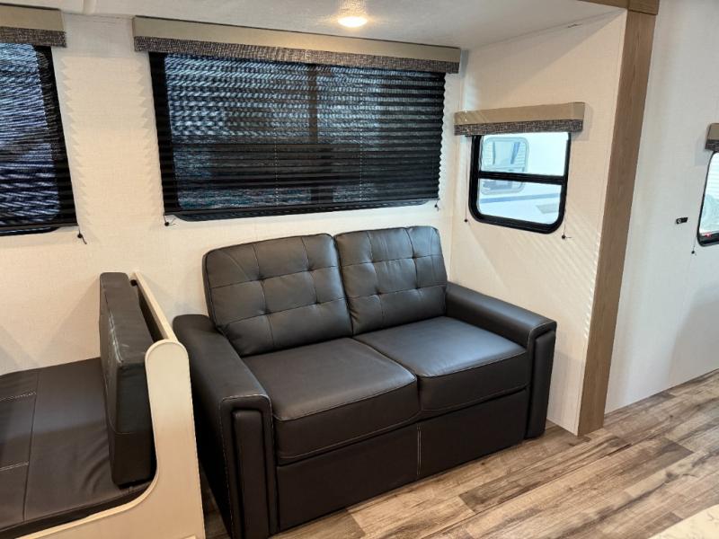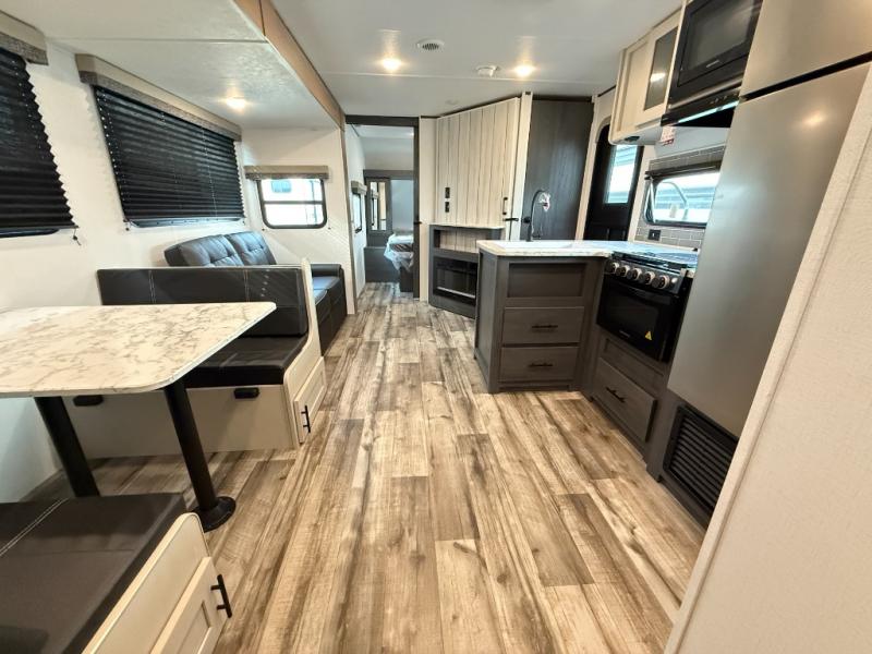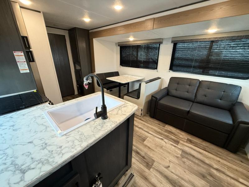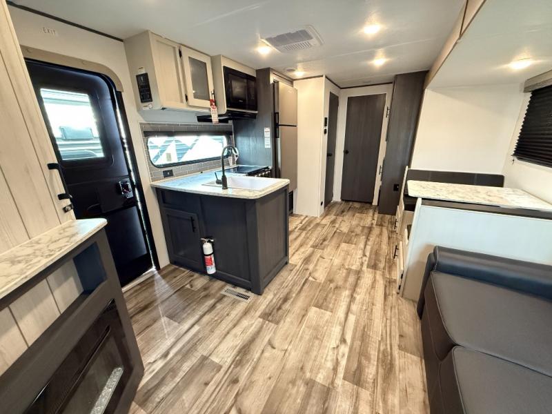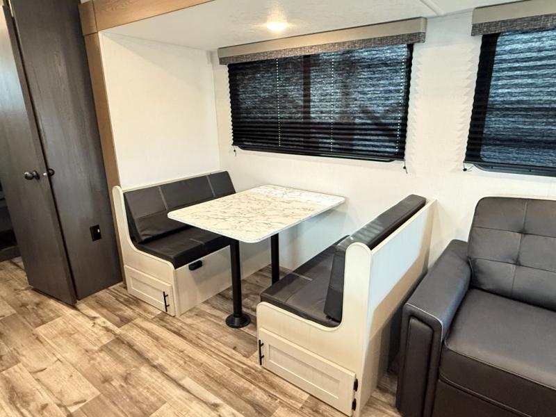 You will have everything you need in this travel trailer! Starting with a fully equipped interior kitchen, as well as an outdoor kitchen to prepare all of your favorite meals. Enjoy your meals at the booth dinette and then either play a card game or head to the jackknife sofa with footrests to let your stomach settle while you relax in front of the cozy fireplace at the hinged entertainment center. The full bathroom has a shower with exhaust fan so you can rinse all of the sand out of your hair or off your feet each night. The rear private bunkhouse has a set of bunk beds with a ladder for privacy while changing or sleeping!
