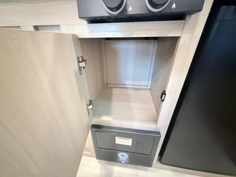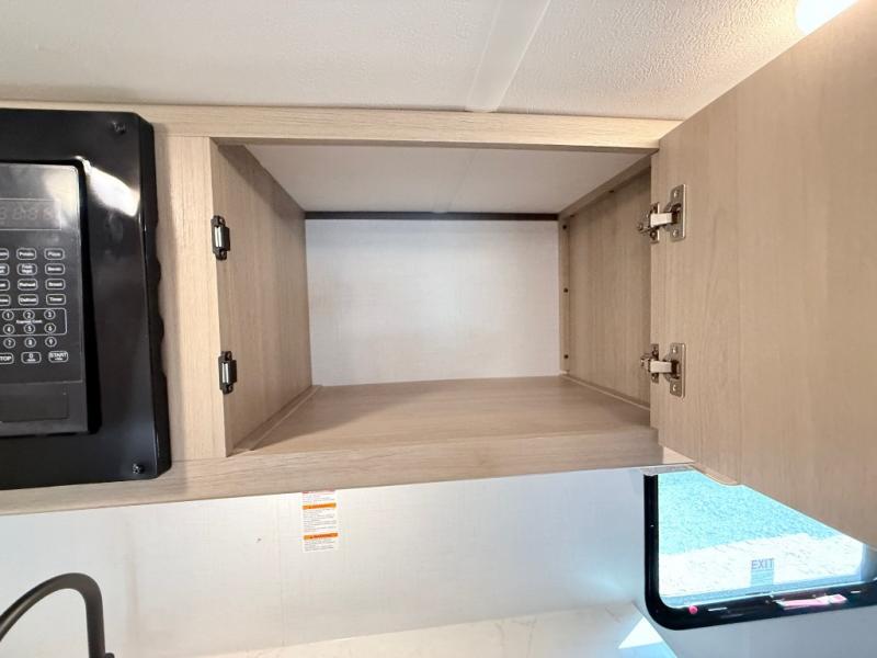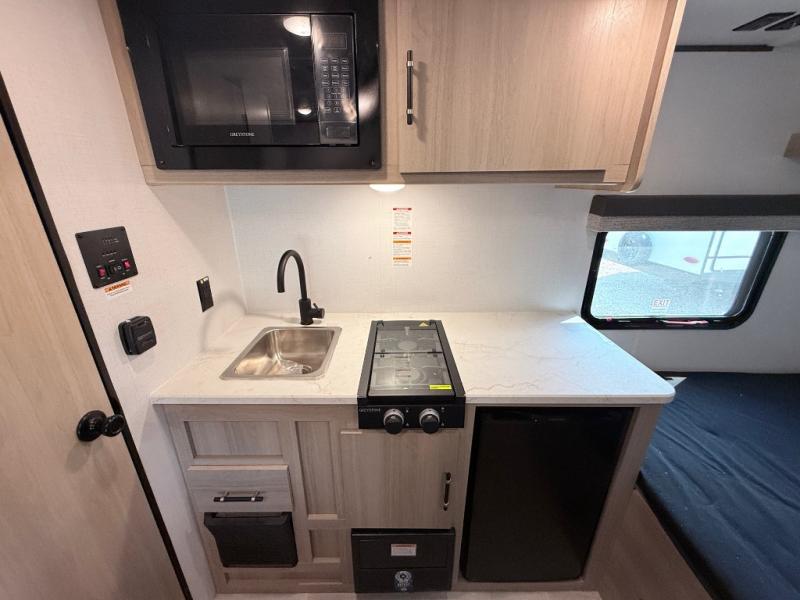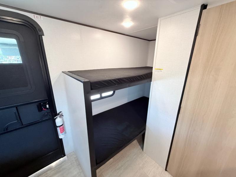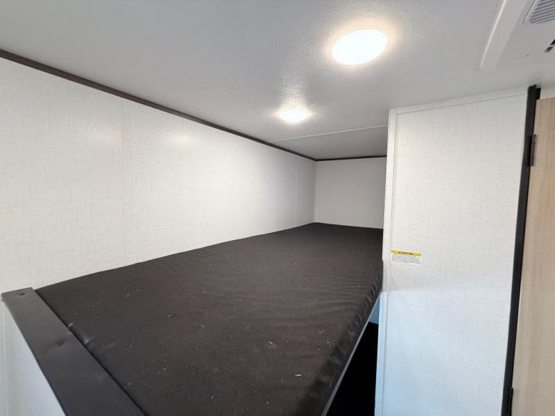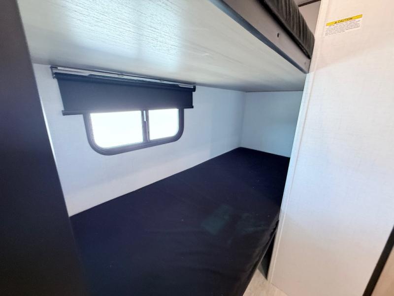 This family-friendly travel trailer is ideal for you! This model offers accommodations for all family members, starting with bunk beds for the kids (or kids at heart!), a queen bed for a comfortable night's sleep, and a private bathroom for personal convenience. Preparing meals has never been easier thanks to the two-burner cooktop, microwave for quick snacks, and a 3.3 cu. ft. refrigerator for keeping food and drinks fresh. You will be able to keep the RV organized due to an overhead cabinet for storing essentials, a closet for hanging clothes and gear, plus a pass-through storage for extra luggage or equipment.