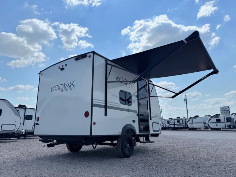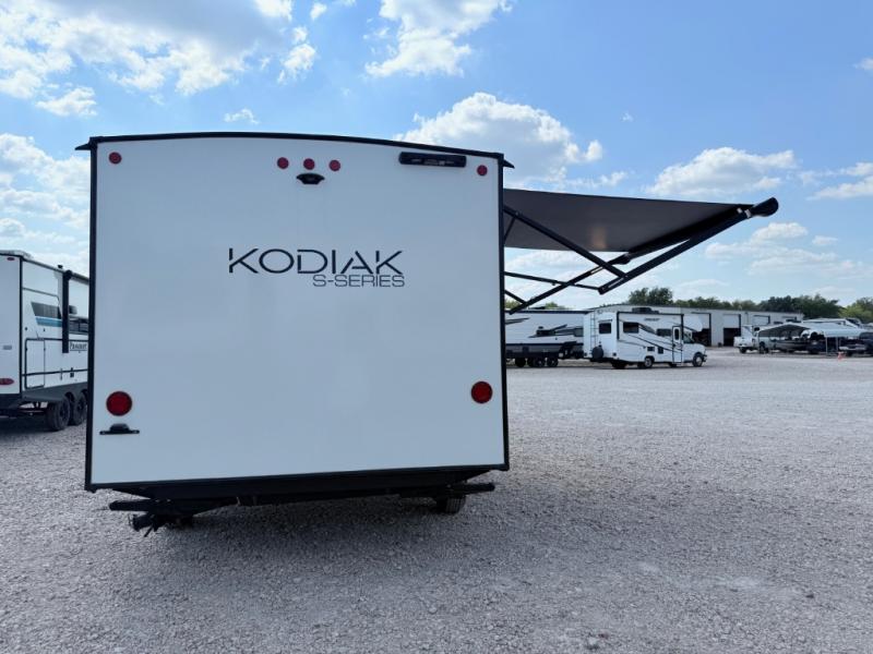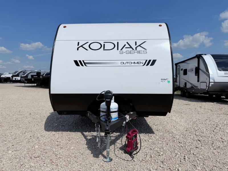 Each Kodiak travel trailer by Dutchmen includes a diamond front plate, easy lube axles, and a power tongue jack for hassle-free towing. The bear cave storage will allow you to bring along all the camp gear, and the power awning with an LED light will create an inviting outdoor space. Head inside to enjoy the designer valances, blackout roller shades, and seamless countertops. There is also HyperDeck flooring that will withstand your many adventures plus a 6' 8" interior height for more head room. A high output furnace and 13.5k BTU A/C will keep you comfortable, and the on-demand tankless water heater will provide instant hot water when you need it!