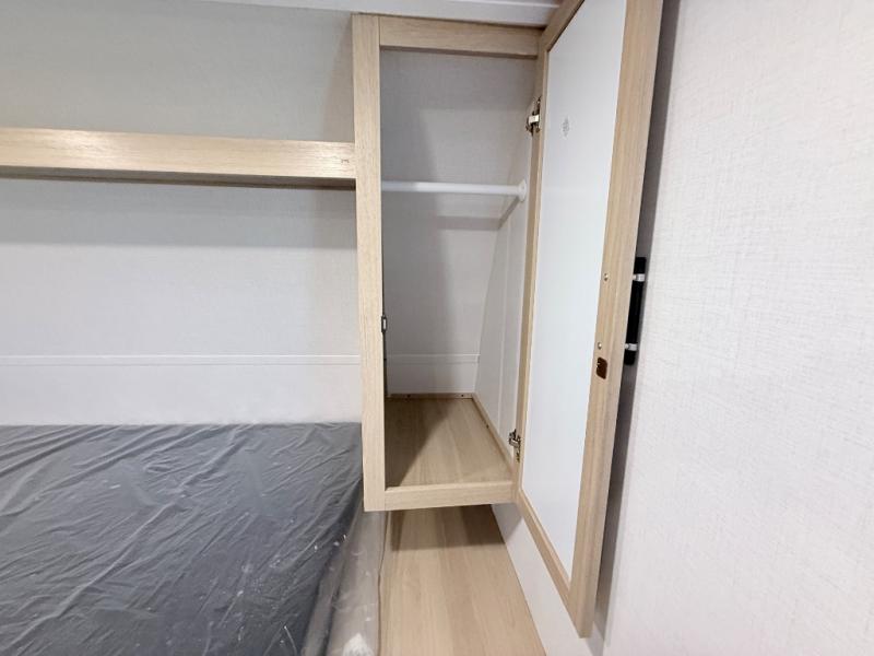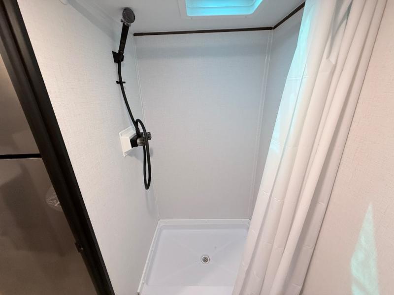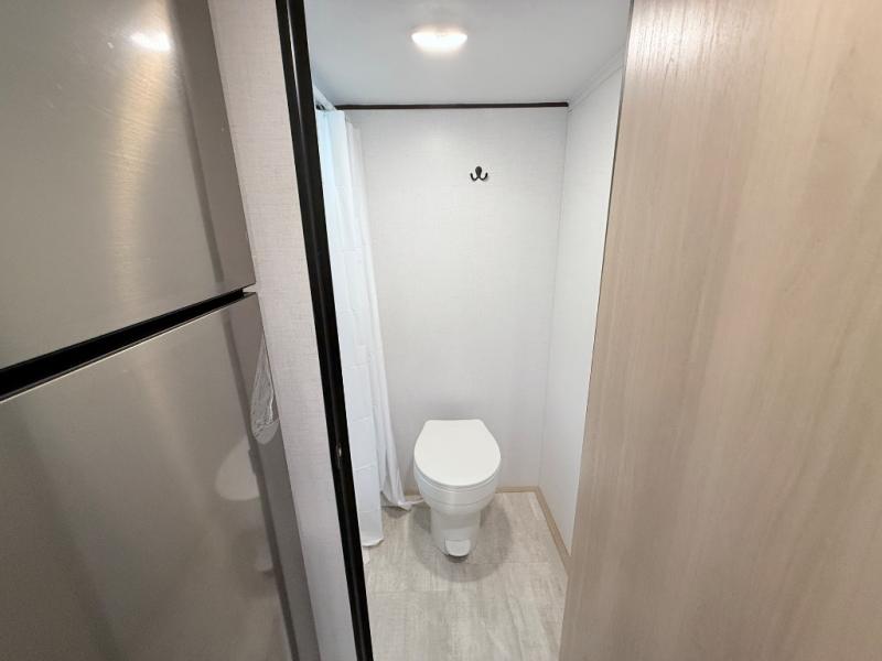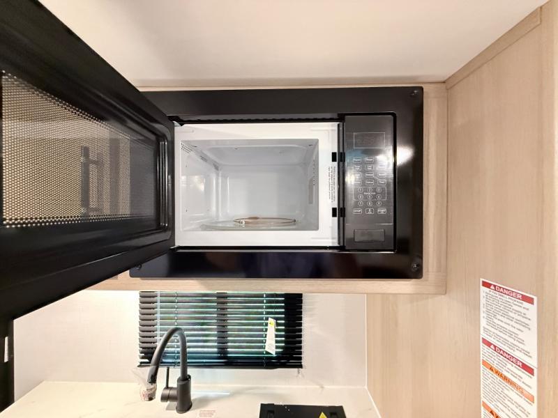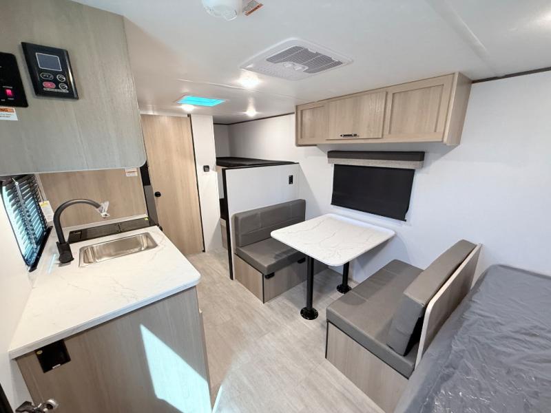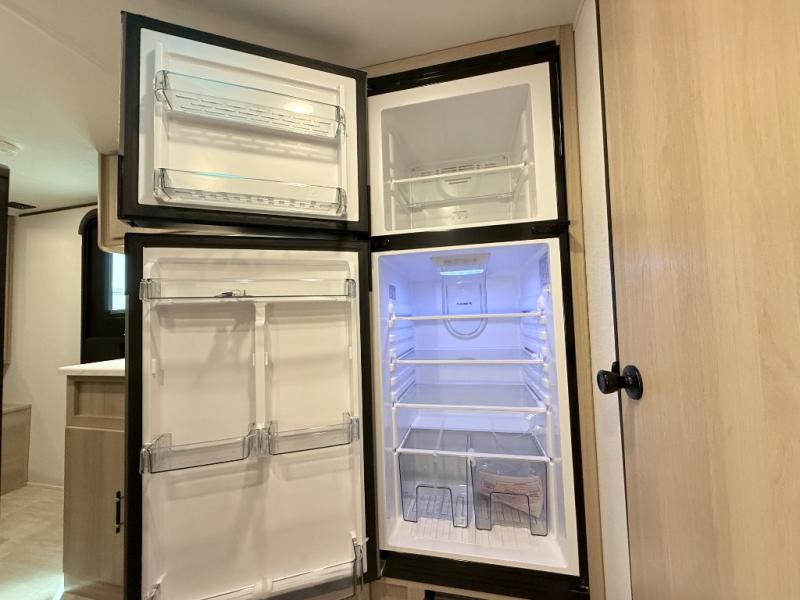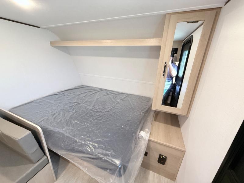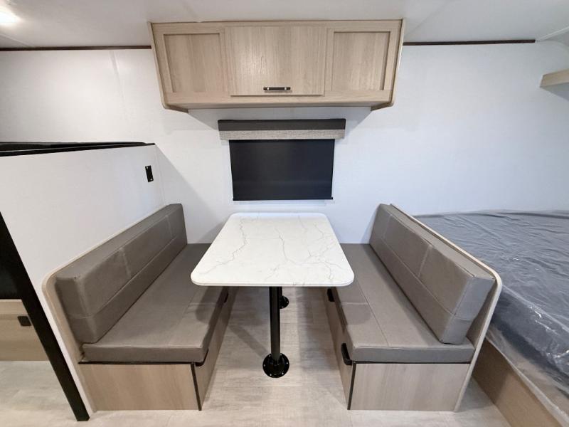 Luxurious travel trailer for the ultimate adventurer! This unit boasts spacious sleeping quarters, including bunk beds for kids or guests, and a plush queen bed for a restful night's sleep. Savor every meal with our premium kitchen features, including a microwave, two-burner cooktop, and spacious 10 cu. ft. refrigerator. The convenient amenities include a private bathroom with ample storage, an elegant booth dinette for meals or relaxation, overhead cabinets for organized storage, spacious closet for hanging clothes and gear, plus a pass-through storage for extra luggage or equipment.