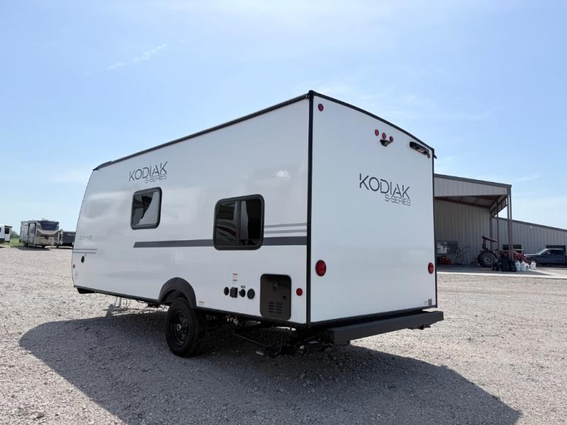 Each Kodiak travel trailer by Dutchmen includes a diamond front plate, easy lube axles, and a power tongue jack for hassle-free towing. The bear cave storage will allow you to bring along all the camp gear, and the power awning with an LED light will create an inviting outdoor space. Head inside to enjoy the designer valances, blackout roller shades, and seamless countertops. There is also HyperDeck flooring that will withstand your many adventures plus a 6' 8" interior height for more head room. A high output furnace and 13.5k BTU A/C will keep you comfortable, and the on-demand tankless water heater will provide instant hot water when you need it!