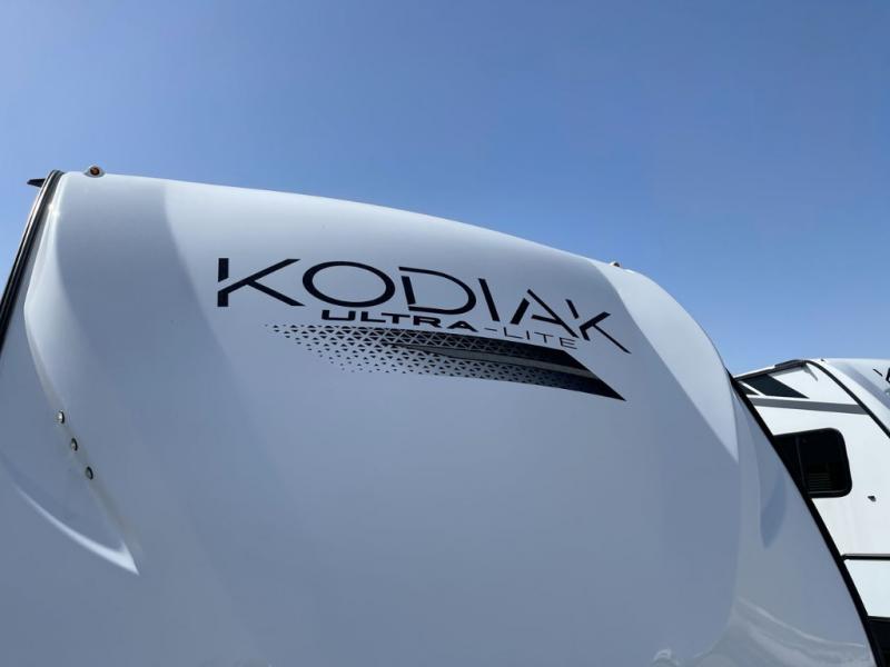 Each Kodiak travel trailer by Dutchmen includes a diamond front plate, easy lube axles, and a power tongue jack for hassle-free towing. The bear cave storage will allow you to bring along all the camp gear, and the power awning with an LED light will create an inviting outdoor space. Head inside to enjoy the designer valances, blackout roller shades, and seamless countertops. There is also HyperDeck flooring that will withstand your many adventures plus a 6' 8" interior height for more head room. A high output furnace and 13.5k BTU A/C will keep you comfortable, and the on-demand tankless water heater will provide instant hot water when you need it!