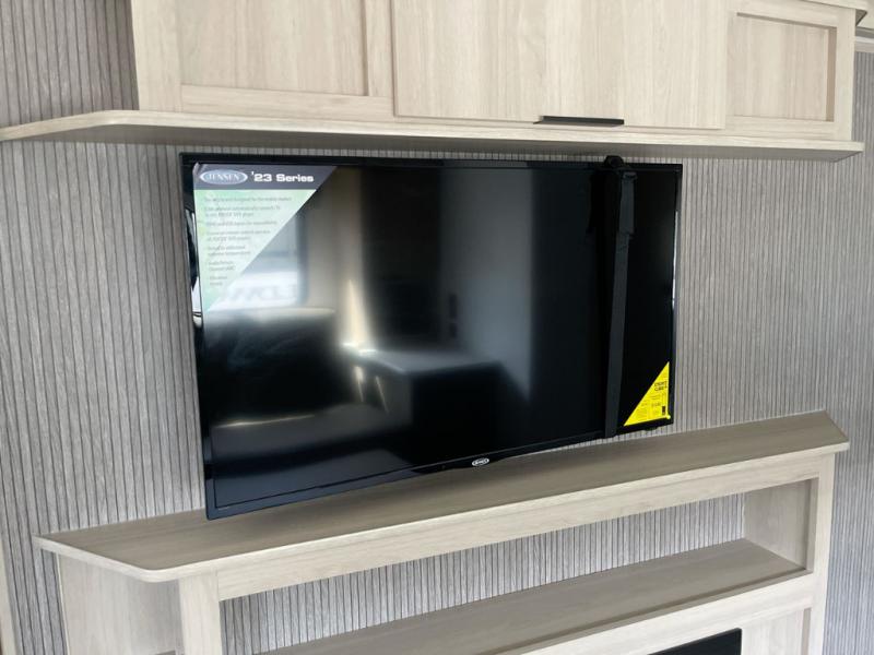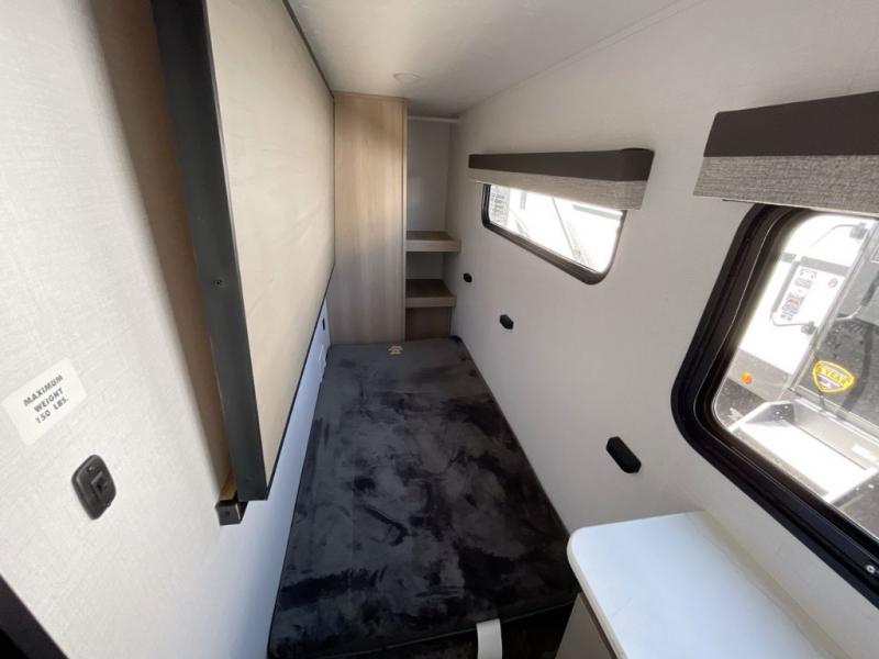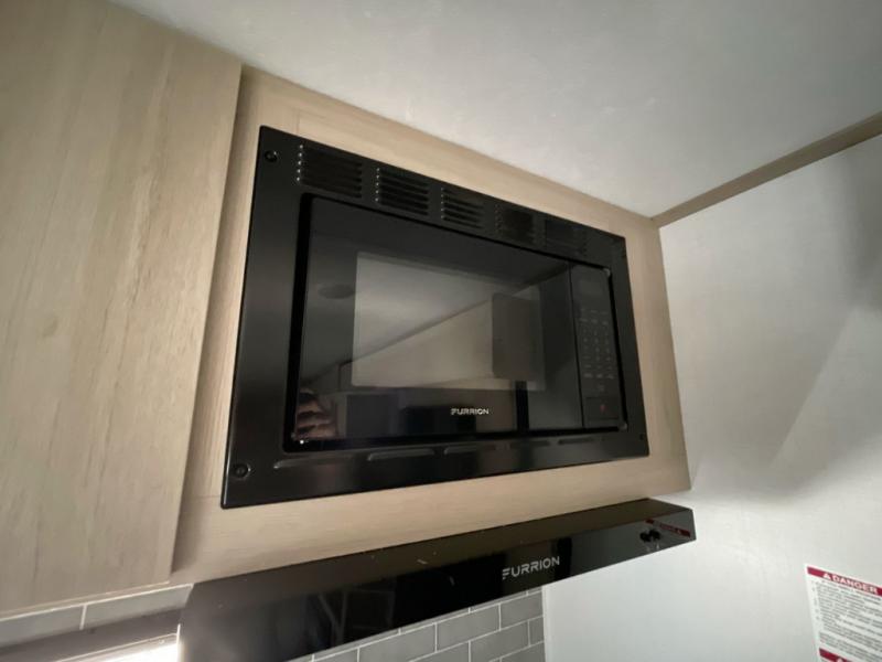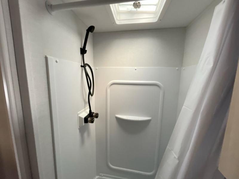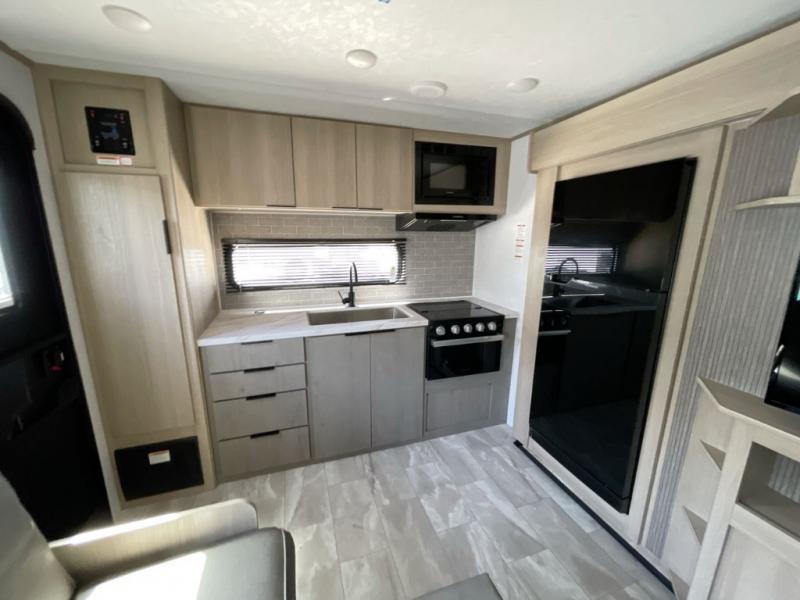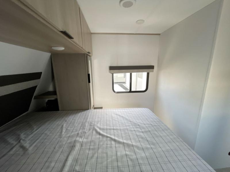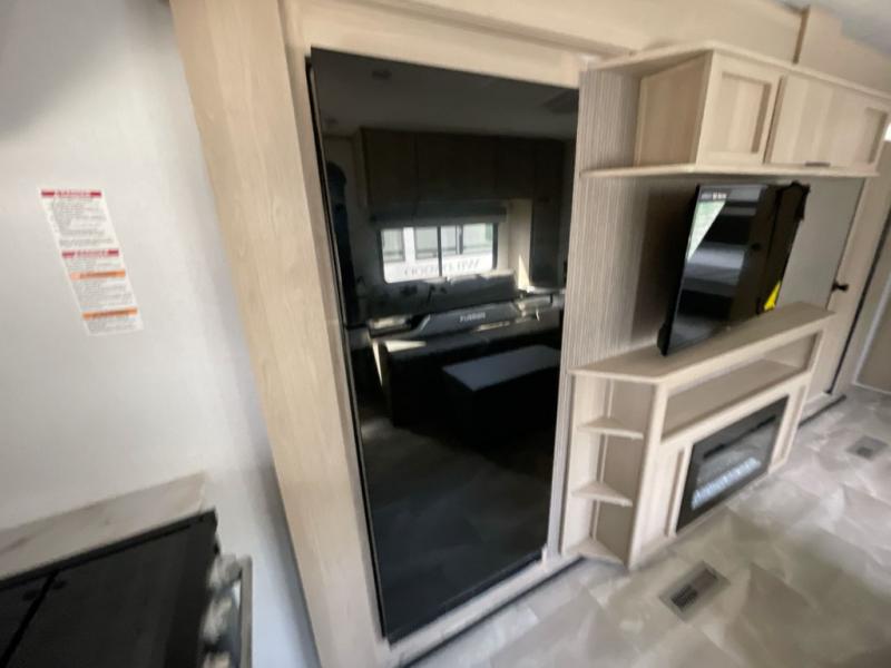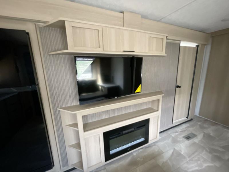 You'll love every minute spent in this spacious travel trailer. There is a front private bedroom with a queen bed and dual bedside closets to keep your things organized. The jack knife sofa sits across from the fireplace so you can enjoy your evenings indoors, and the hidden convertible bunk is behind the entertainment center for a smart usage of space! The rear kitchen includes a cooktop with an oven, a microwave, plus a 12V refrigerator and pantry for food storage. And don't overlook the mid-coach full bath for quick and easy showers!