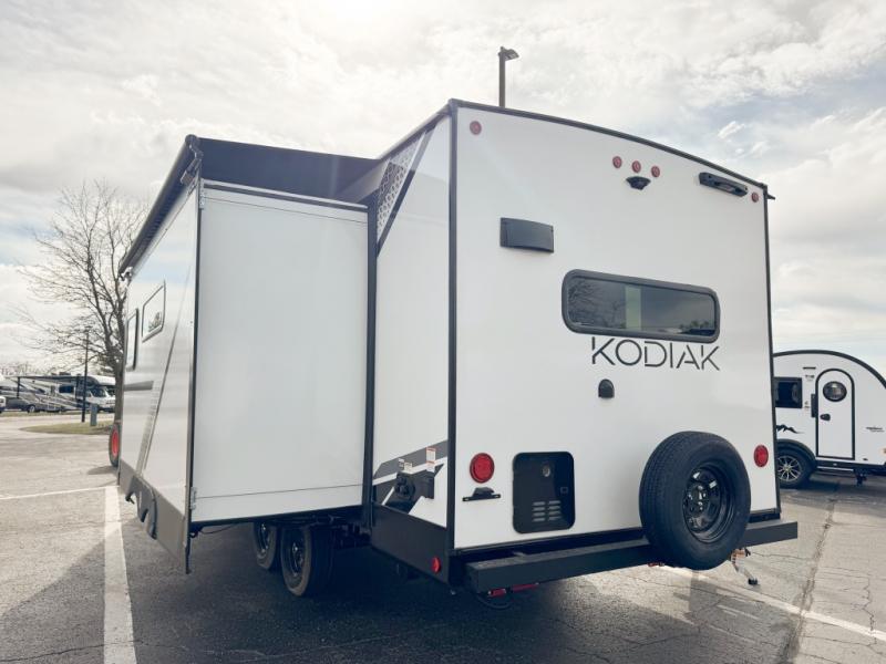 Each Kodiak travel trailer by Dutchmen includes a diamond front plate, easy lube axles, and a power tongue jack for hassle-free towing. The bear cave storage will allow you to bring along all the camp gear, and the power awning with an LED light will create an inviting outdoor space. Head inside to enjoy the designer valances, blackout roller shades, and seamless countertops. There is also HyperDeck flooring that will withstand your many adventures plus a 6' 8" interior height for more head room. A high output furnace and 13.5k BTU A/C will keep you comfortable, and the on-demand tankless water heater will provide instant hot water when you need it!