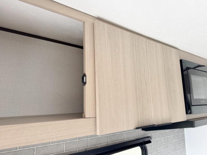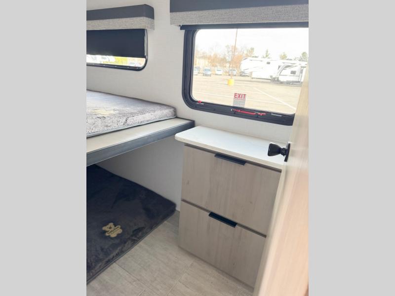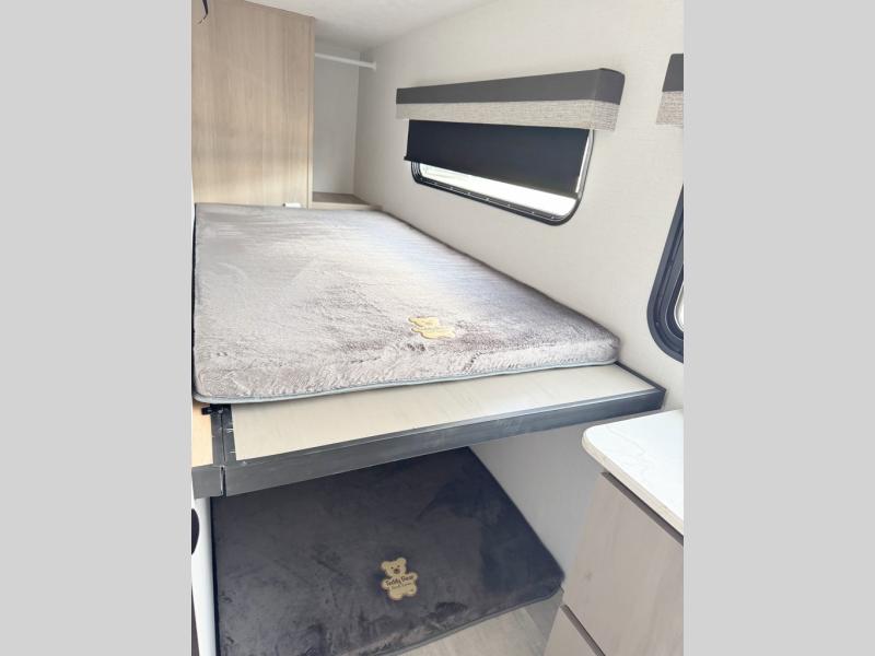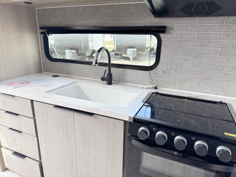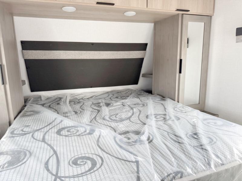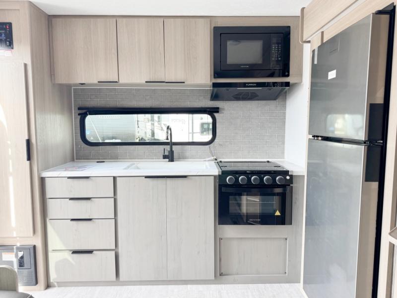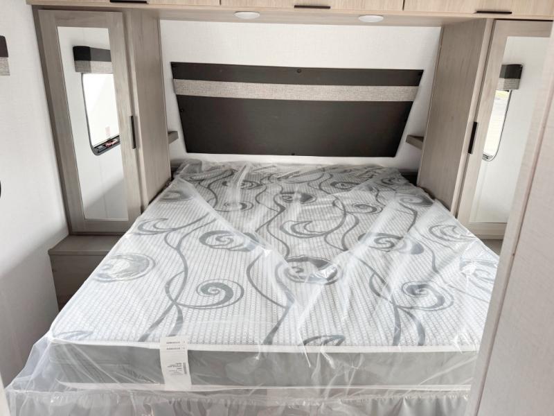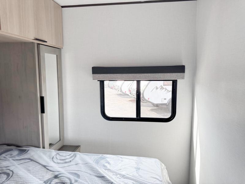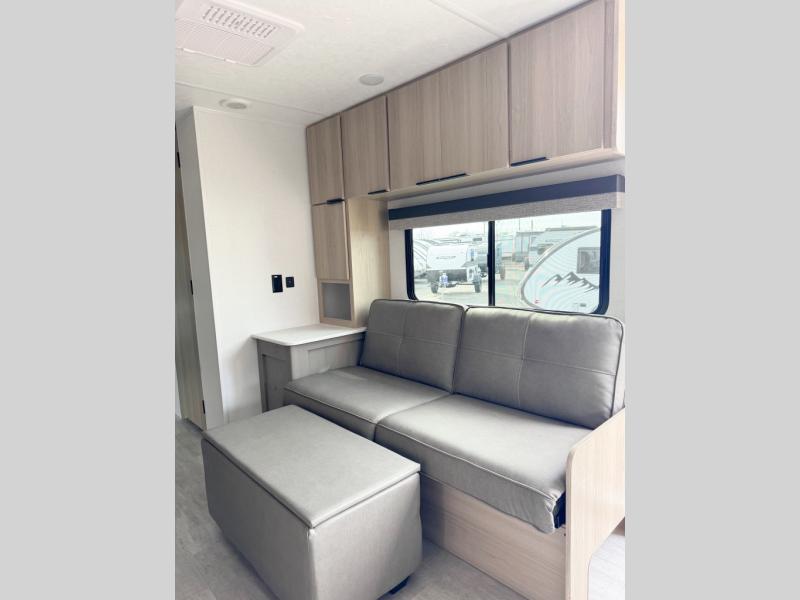 You'll love every minute spent in this spacious travel trailer. There is a front private bedroom with a queen bed and dual bedside closets to keep your things organized. The jack knife sofa sits across from the fireplace so you can enjoy your evenings indoors, and the hidden convertible bunk is behind the entertainment center for a smart usage of space! The rear kitchen includes a cooktop with an oven, a microwave, plus a 12V refrigerator and pantry for food storage. And don't overlook the mid-coach full bath for quick and easy showers!