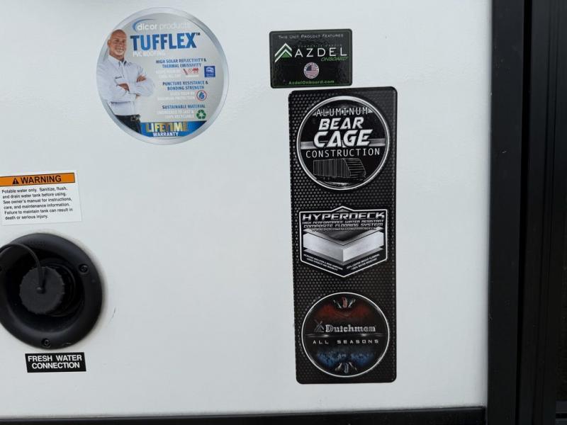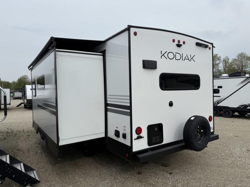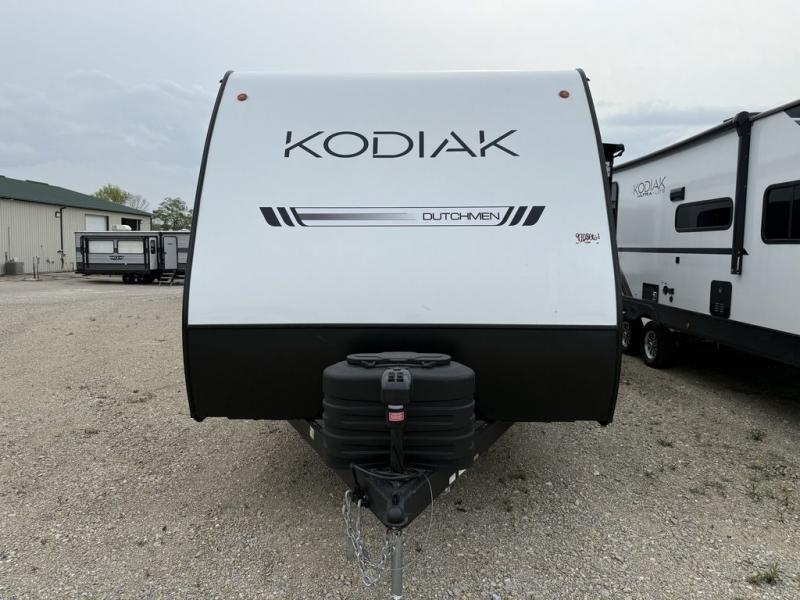 Each Kodiak travel trailer by Dutchmen includes a diamond front plate, easy lube axles, and a power tongue jack for hassle-free towing. The bear cave storage will allow you to bring along all the camp gear, and the power awning with an LED light will create an inviting outdoor space. Head inside to enjoy the designer valances, blackout roller shades, and seamless countertops. There is also HyperDeck flooring that will withstand your many adventures plus a 6' 8" interior height for more head room. A high output furnace and 13.5k BTU A/C will keep you comfortable, and the on-demand tankless water heater will provide instant hot water when you need it!