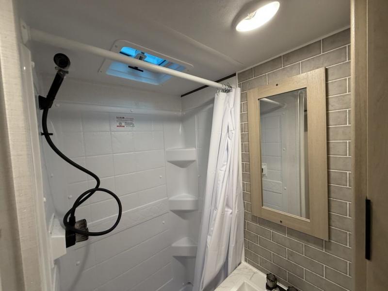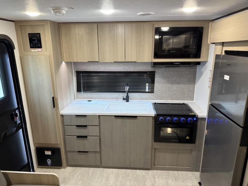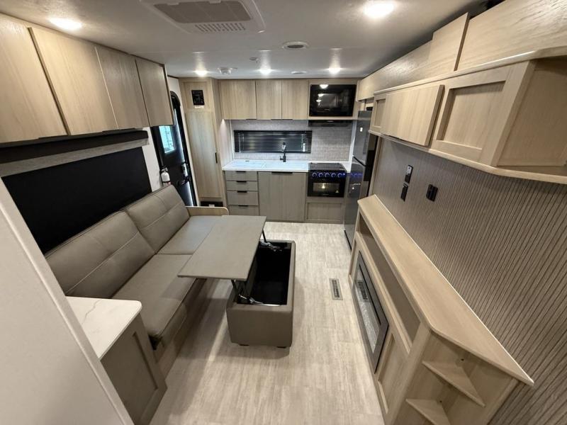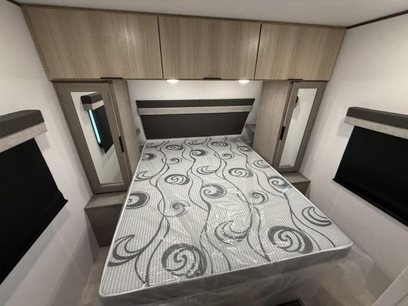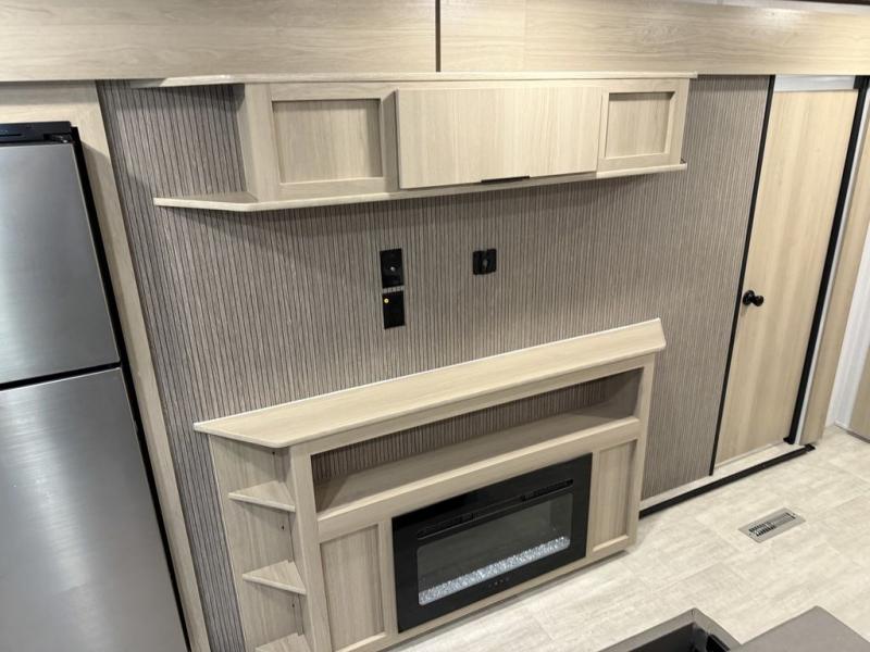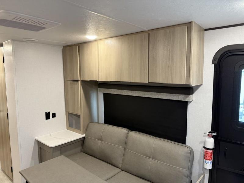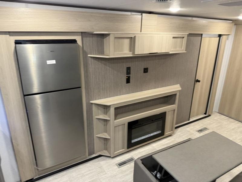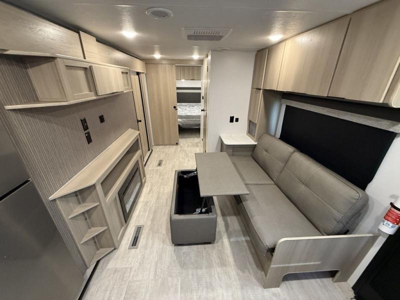 You'll love every minute spent in this spacious travel trailer. There is a front private bedroom with a queen bed and dual bedside closets to keep your things organized. The jack knife sofa sits across from the fireplace so you can enjoy your evenings indoors, and the hidden convertible bunk is behind the entertainment center for a smart usage of space! The rear kitchen includes a cooktop with an oven, a microwave, plus a 12V refrigerator and pantry for food storage. And don't overlook the mid-coach full bath for quick and easy showers!