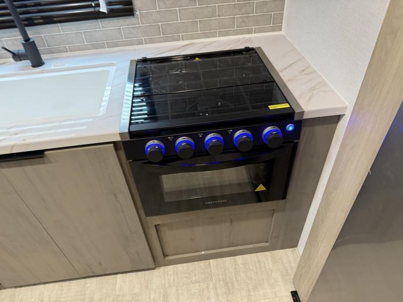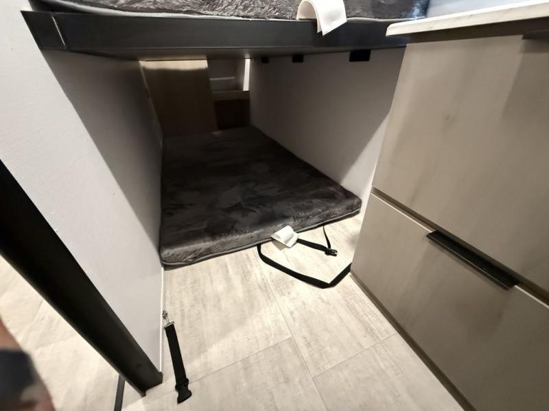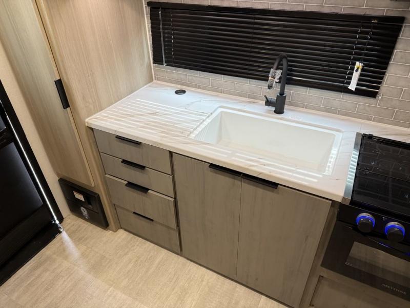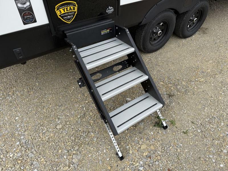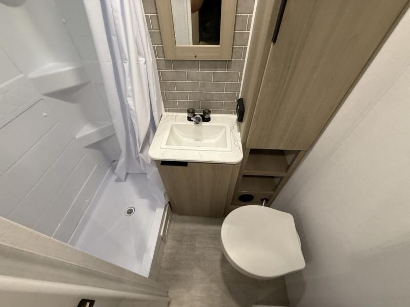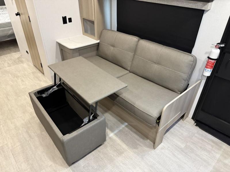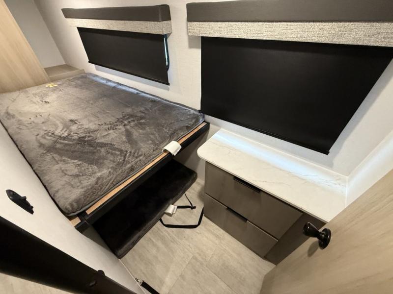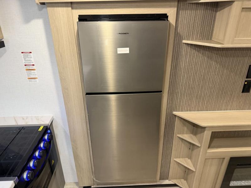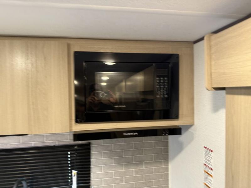 You'll love every minute spent in this spacious travel trailer. There is a front private bedroom with a queen bed and dual bedside closets to keep your things organized. The jack knife sofa sits across from the fireplace so you can enjoy your evenings indoors, and the hidden convertible bunk is behind the entertainment center for a smart usage of space! The rear kitchen includes a cooktop with an oven, a microwave, plus a 12V refrigerator and pantry for food storage. And don't overlook the mid-coach full bath for quick and easy showers!