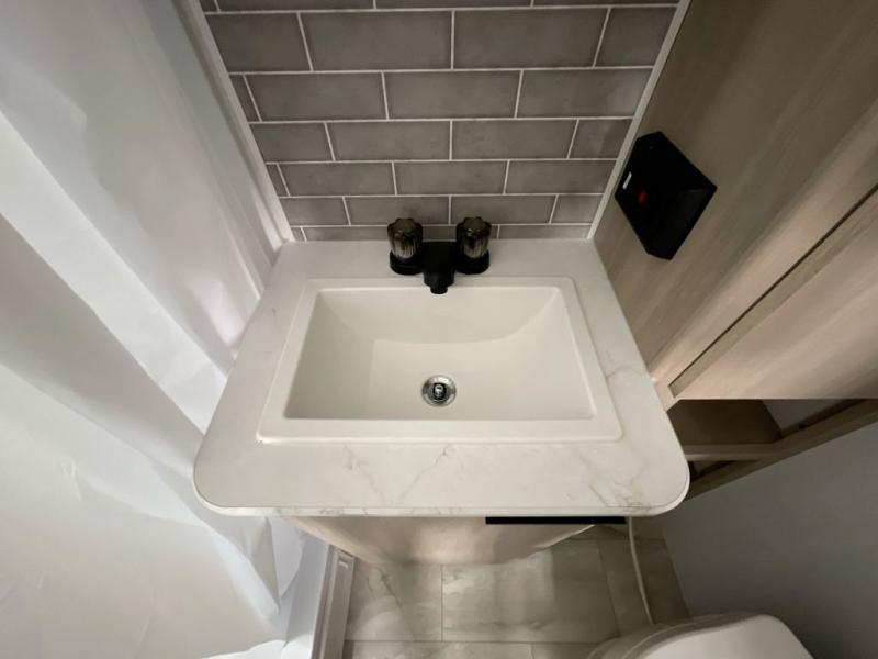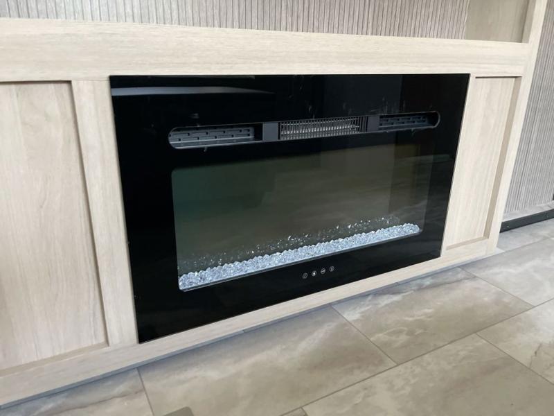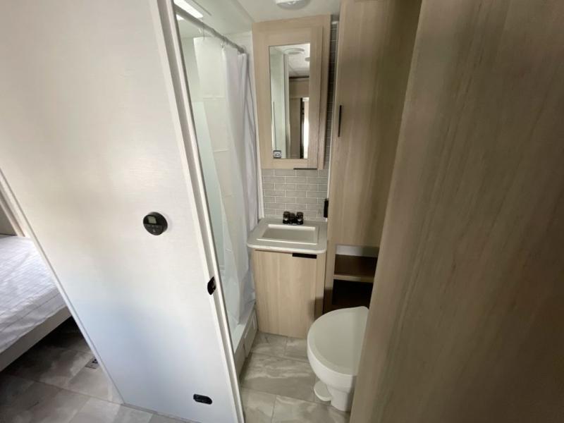 You'll love every minute spent in this spacious travel trailer. There is a front private bedroom with a queen bed and dual bedside closets to keep your things organized. The jack knife sofa sits across from the fireplace so you can enjoy your evenings indoors, and the hidden convertible bunk is behind the entertainment center for a smart usage of space! The rear kitchen includes a cooktop with an oven, a microwave, plus a 12V refrigerator and pantry for food storage. And don't overlook the mid-coach full bath for quick and easy showers!