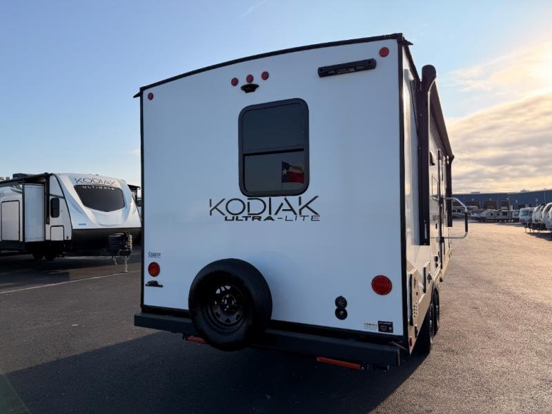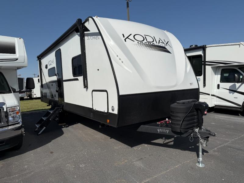 Each Kodiak travel trailer by Dutchmen includes a diamond front plate, easy lube axles, and a power tongue jack for hassle-free towing. The bear cave storage will allow you to bring along all the camp gear, and the power awning with an LED light will create an inviting outdoor space. Head inside to enjoy the designer valances, blackout roller shades, and seamless countertops. There is also HyperDeck flooring that will withstand your many adventures plus a 6' 8" interior height for more head room. A high output furnace and 13.5k BTU A/C will keep you comfortable, and the on-demand tankless water heater will provide instant hot water when you need it!