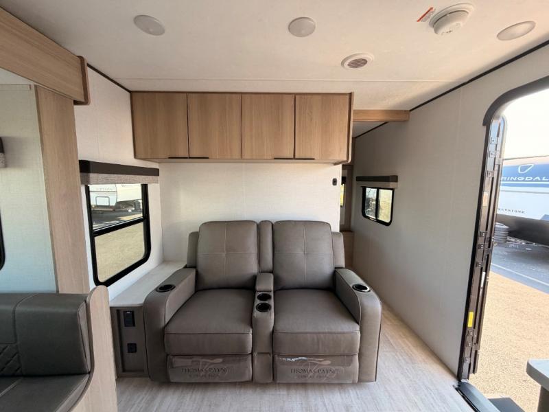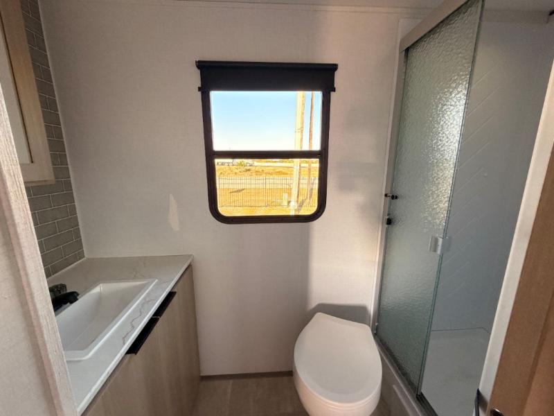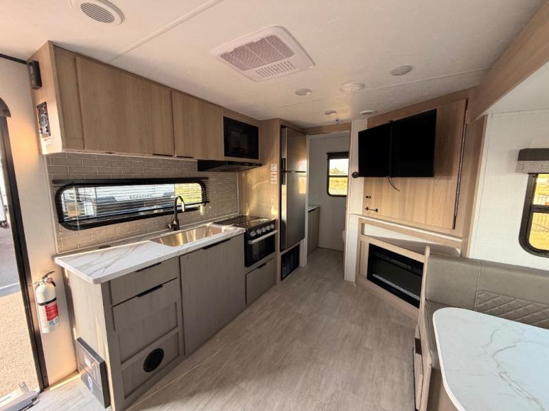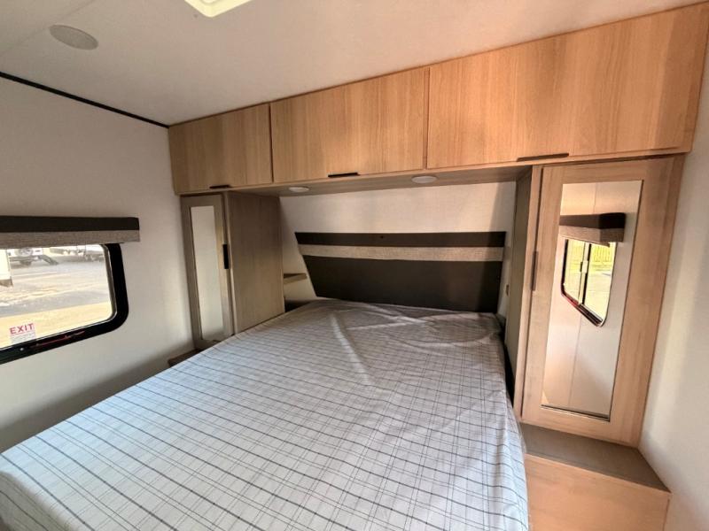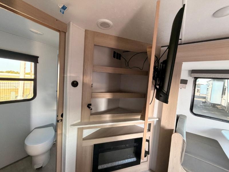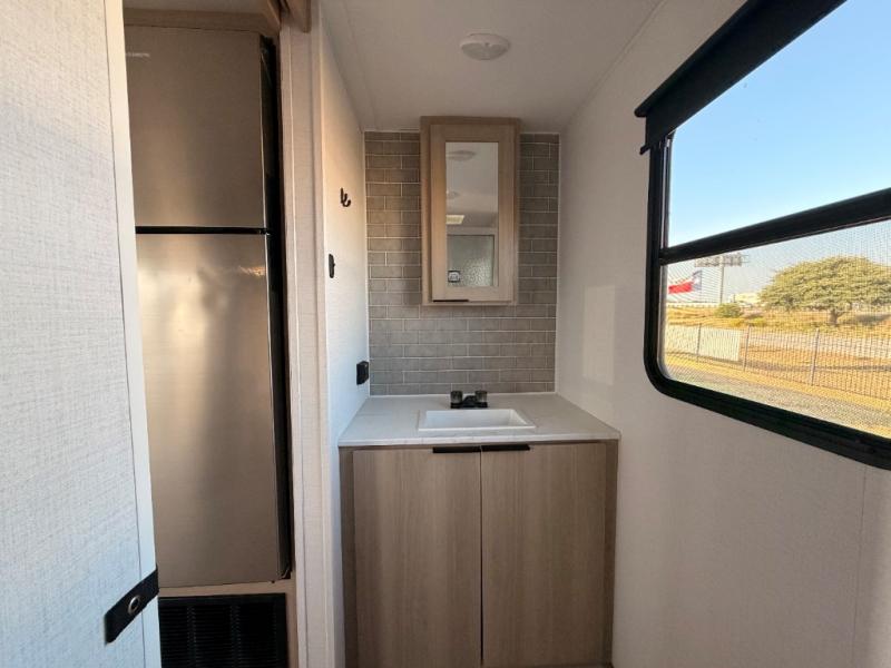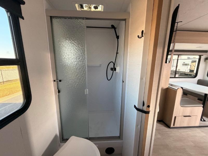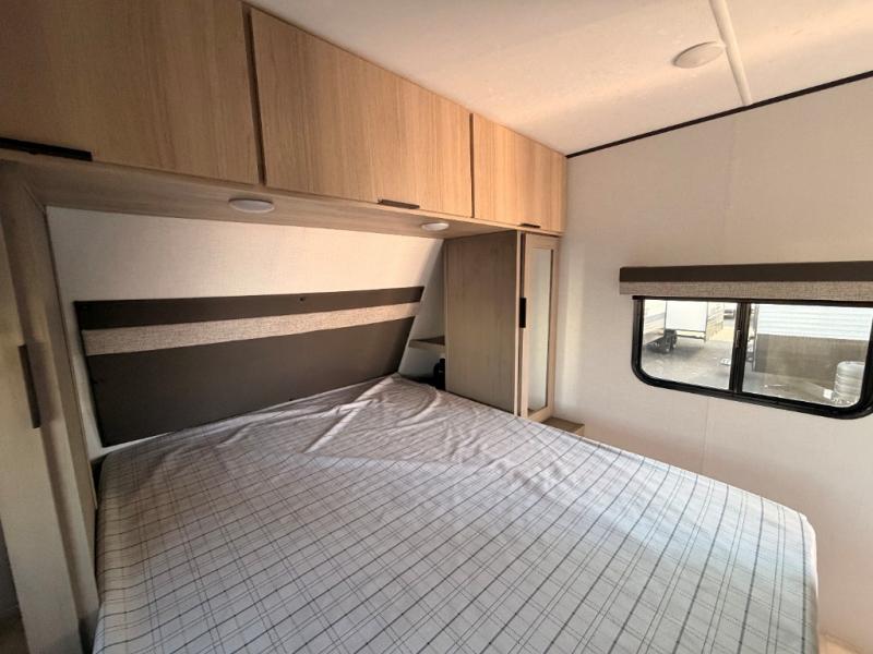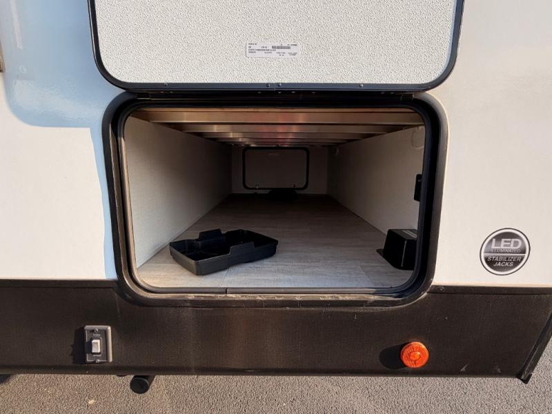 A full rear bath on board this cozy travel trailer will add privacy and convenience you won't want to camp without. The slide out in the main living area will provide plenty of space to let the chef whip up breakfast on the cooktop, and your crew can get comfy on the theater seats. The 10 cu. ft. 12V refrigerator will allow you to pack your favorite cold ingredients, plus there is a hidden pantry behind the hinged entertainment center for smart storage spaces. This model also includes a front private bedroom with a queen bed, just like at home!