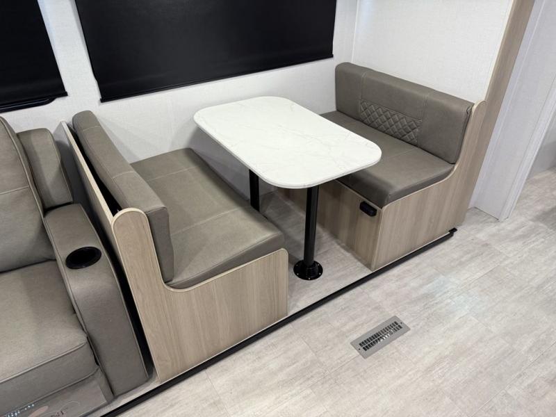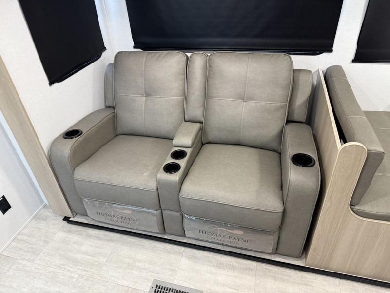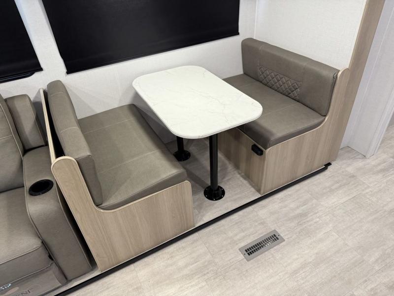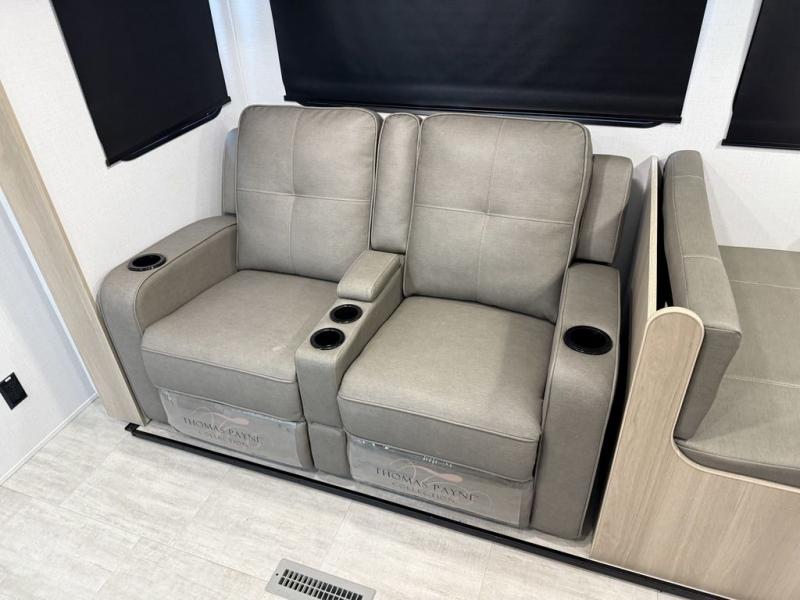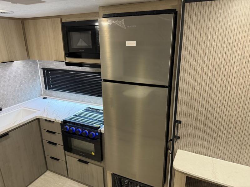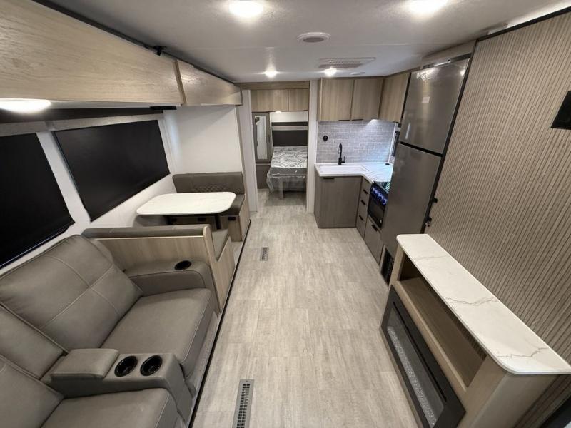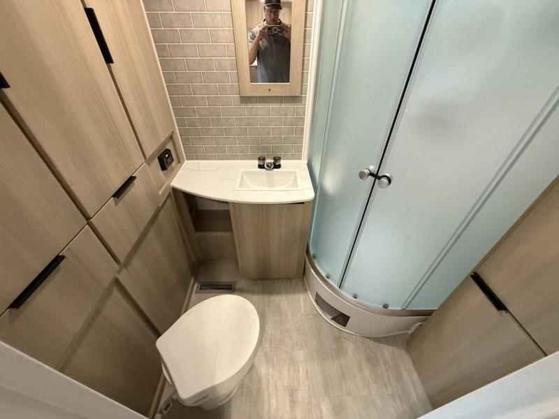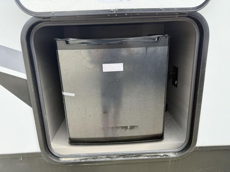 A full rear bath on board this cozy travel trailer will add privacy and convenience you won't want to camp without. The large slide out in the main living area will provide plenty of space to let the chef whip up breakfast on the cooktop, and your crew can get comfy on the theater seats. The 10 cu. ft. 12V refrigerator will allow you to pack your favorite cold ingredients, plus there is a hidden pantry behind the hinged entertainment center for smart storage spaces. This model also includes a front private bedroom with a queen bed, just like at home!