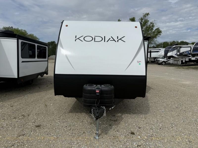 Each Kodiak travel trailer by Dutchmen includes a diamond front plate, easy lube axles, and a power tongue jack for hassle-free towing. The bear cave storage will allow you to bring along all the camp gear, and the power awning with an LED light will create an inviting outdoor space. Head inside to enjoy the designer valances, blackout roller shades, and seamless countertops. There is also HyperDeck flooring that will withstand your many adventures plus a 6' 8" interior height for more head room. A high output furnace and 13.5k BTU A/C will keep you comfortable, and the on-demand tankless water heater will provide instant hot water when you need it!