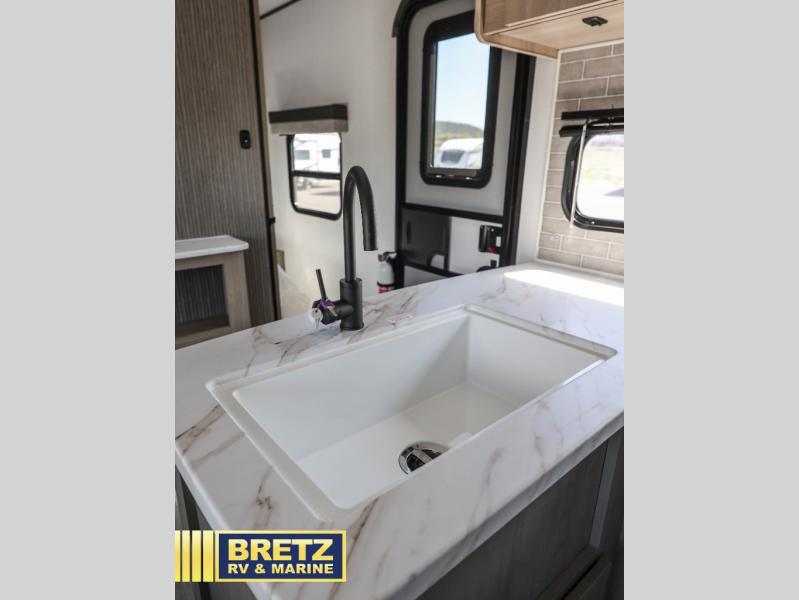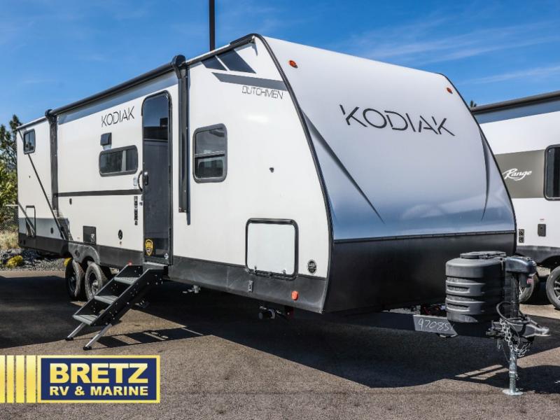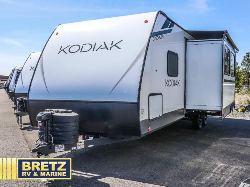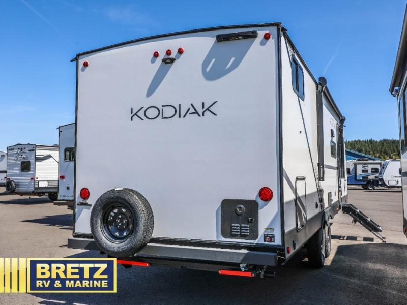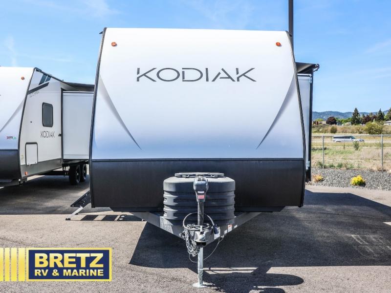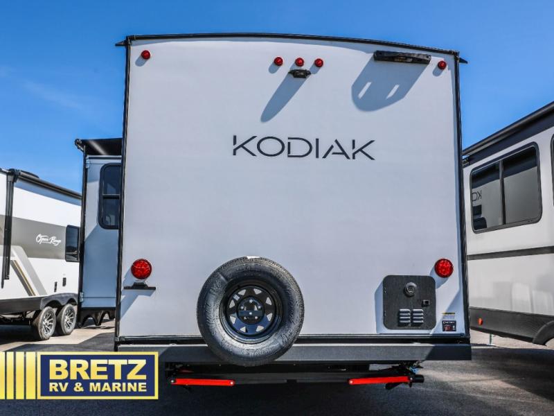 Each Kodiak travel trailer by Dutchmen includes a diamond front plate, easy lube axles, and a power tongue jack for hassle-free towing. The bear cave storage will allow you to bring along all the camp gear, and the power awning with an LED light will create an inviting outdoor space. Head inside to enjoy the designer valances, blackout roller shades, and seamless countertops. There is also HyperDeck flooring that will withstand your many adventures plus a 6' 8" interior height for more head room. A high output furnace and 13.5k BTU A/C will keep you comfortable, and the on-demand tankless water heater will provide instant hot water when you need it!