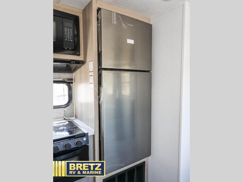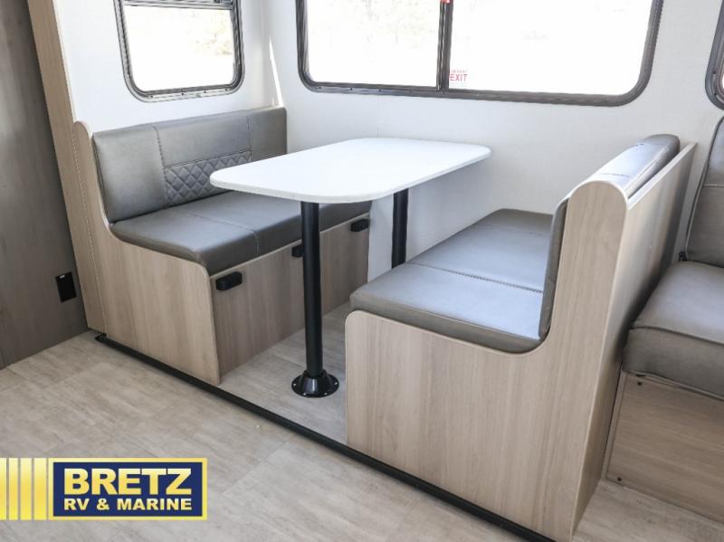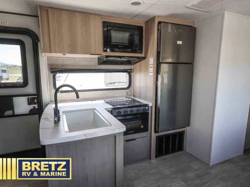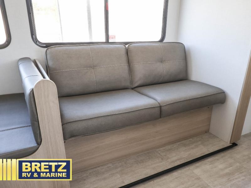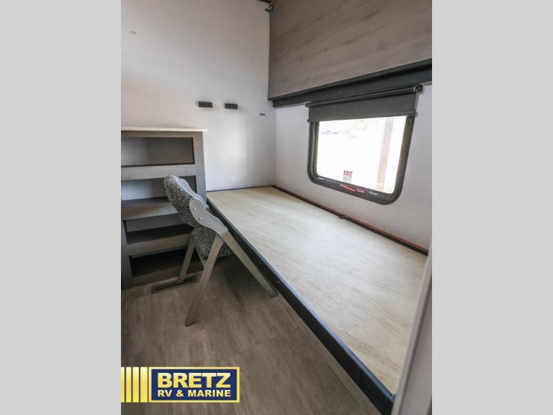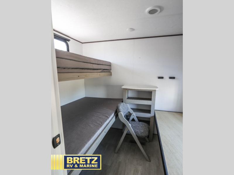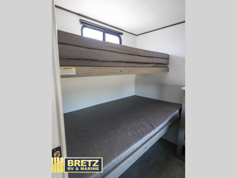 This travel trailer is perfect for weekend excursions or extended getaways at your favorite state park. You will have your own queen bed up front with storage space for your things, and the rear private bunkhouse will be perfect for guests. Here, you'll find a set of bunk beds plus a fold-up bunk over a booth dinette so there is a place to eat or play games back here. The full kitchen will let you cook meals each day, and the 10 cu. ft. refrigerator will keep your food fresh. Outside, a 14' power awning will provide some shade, and an outdoor refrigerator will keep cold drinks close by!
