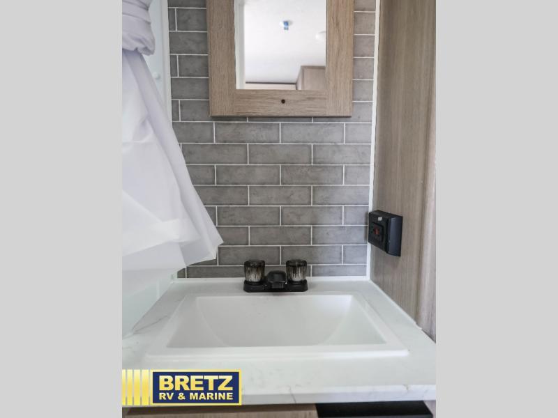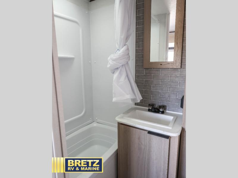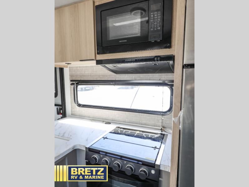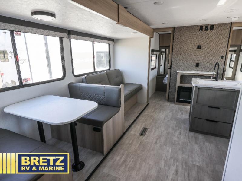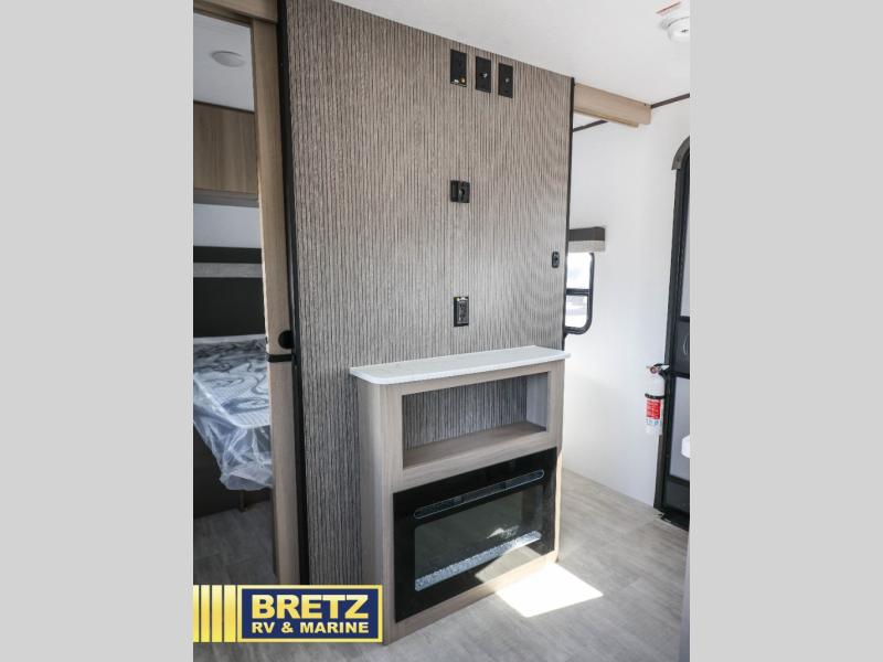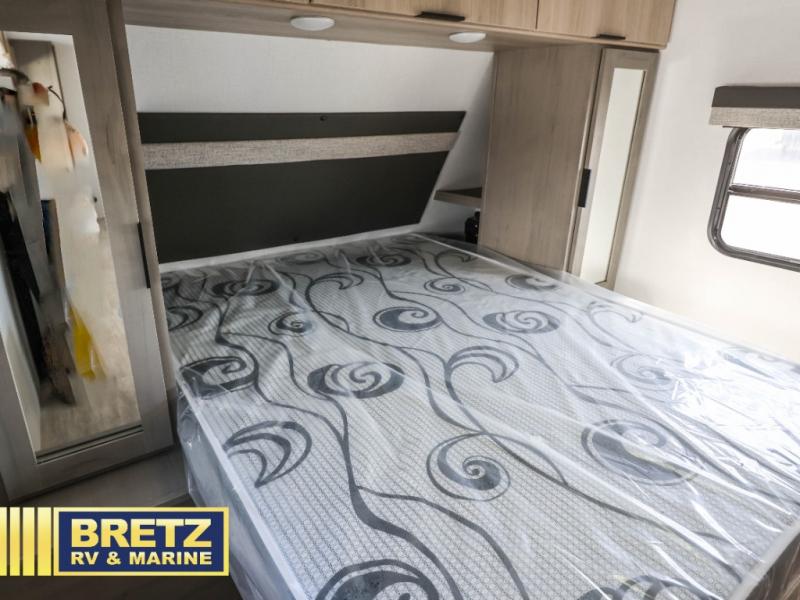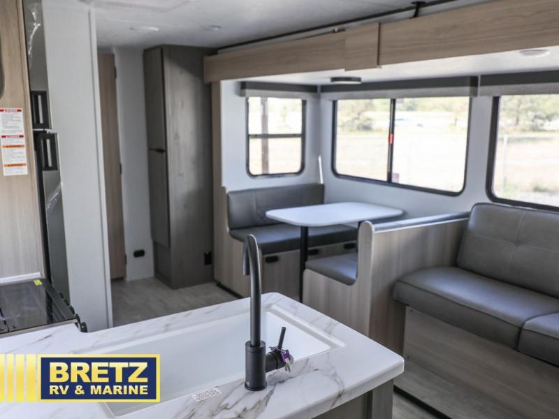 This travel trailer is perfect for weekend excursions or extended getaways at your favorite state park. You will have your own queen bed up front with storage space for your things, and the rear private bunkhouse will be perfect for guests. Here, you'll find a set of bunk beds plus a fold-up bunk over a booth dinette so there is a place to eat or play games back here. The full kitchen will let you cook meals each day, and the 10 cu. ft. refrigerator will keep your food fresh. Outside, a 14' power awning will provide some shade, and an outdoor refrigerator will keep cold drinks close by!