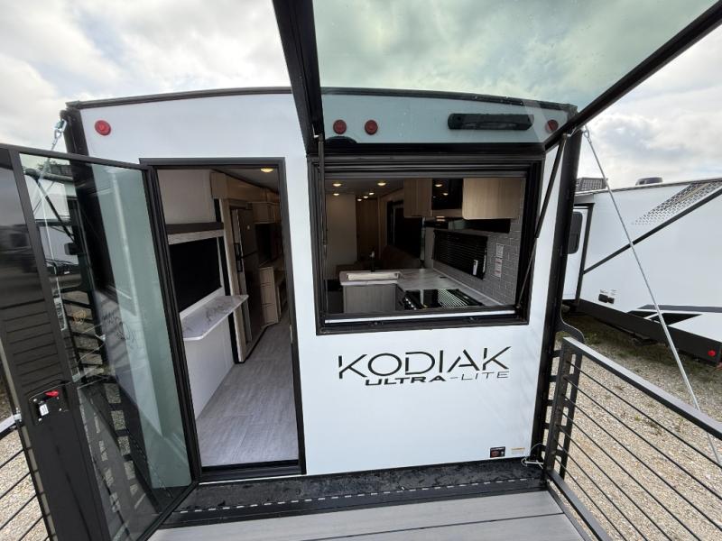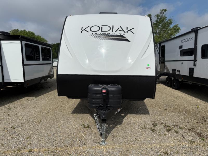 Each Kodiak travel trailer by Dutchmen includes a diamond front plate, easy lube axles, and a power tongue jack for hassle-free towing. The bear cave storage will allow you to bring along all the camp gear, and the power awning with an LED light will create an inviting outdoor space. Head inside to enjoy the designer valances, blackout roller shades, and seamless countertops. There is also HyperDeck flooring that will withstand your many adventures plus a 6' 8" interior height for more head room. A high output furnace and 13.5k BTU A/C will keep you comfortable, and the on-demand tankless water heater will provide instant hot water when you need it!